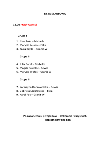 LISTA STARTOWA 13.00 PONY GAMES Grupa I 1. Nina Foks – Michelle 2. Marysia Żelazo – Flika 3. Zosia Bryda – Granit-W Grupa II 4. Julia Burak - Michelle 5. Magda Pawelec - Rewia 6. Marysia Wołoś – Granit-W Grupa III 7. Katarzyna Dobrowolska – Rewia 8. Gabriela Szabłowska – Flika 9. Karol Foc – Granit-W Po zakończeniu przejazdów - Dekoracja wszystkich uczestników bez koni