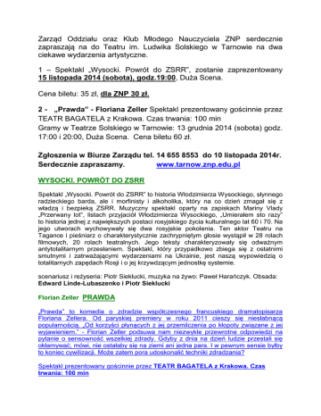 Zarząd Oddziału oraz Klub Młodego Nauczyciela ZNP serdecznie zapraszają na do Teatru im. Ludwika Solskiego w Tarnowie na dwa ciekawe wydarzenia artystyczne. 1 – Spektakl „Wysocki. Powrót do ZSRR”, zostanie zaprezentowany 15 listopada 2014 (sobota), godz.19:00, Duża Scena. Cena biletu: 35 zł, dla ZNP 30 zł. 2 - „Prawda” - Floriana Zeller Spektakl prezentowany gościnnie przez TEATR BAGATELA z Krakowa. Czas trwania: 100 min Gramy w Teatrze Solskiego w Tarnowie: 13 grudnia 2014 (sobota) godz. 17:00 i 20:00, Duża Scena. Cena biletu 60 zł. Zgłoszenia w Biurze Zarządu tel. 14 655 8553 do 10 listopada 2014r. Serdecznie zapraszamy. www.tarnow.znp.edu.pl WYSOCKI. POWRÓT DO ZSRR Spektakl „Wysocki. Powrót do ZSRR” to historia Włodzimierza Wysockiego, słynnego radzieckiego barda, ale i morfinisty i alkoholika, który na co dzień zmagał się z władzą i bezpieką ZSRR. Muzyczny spektakl oparty na zapiskach Mariny Vlady „Przerwany lot”, listach przyjaciół Włodzimierza Wysockiego, „Umierałem sto razy” to historia jednej z największych postaci rosyjskiego życia kulturalnego lat 60 i 70. Na jego utworach wychowywały się dwa rosyjskie pokolenia. Ten aktor Teatru na Tagance i pieśniarz o charakterystycznie zachrypniętym głosie wystąpił w 28 rolach filmowych, 20 rolach teatralnych. Jego teksty charakteryzowały się odważnym antytotalitarnym przesłaniem. Spektakl, który przypadkowo zbiega się z ostatnimi smutnymi i zatrważającymi wydarzeniami na Ukrainie, jest naszą wypowiedzią o totalitarnych zapędach Rosji i o jej krzywdzącym jednostkę systemie. scenariusz i reżyseria: Piotr Sieklucki, muzyka na żywo: Paweł Harańczyk. Obsada: Edward Linde-Lubaszenko i Piotr Sieklucki Florian Zeller PRAWDA „Prawda” to komedia o zdradzie współczesnego francuskiego dramatopisarza Floriana Zellera. Od paryskiej premiery w roku 2011 cieszy się niesłabnącą popularnością. „Od korzyści płynących z jej przemilczenia po kłopoty związane z jej wyjawieniem.” - Florian Zeller podsuwa nam niezwykle przewrotne odpowiedzi na pytanie o sensowność wszelkiej zdrady. Gdyby z dnia na dzień ludzie przestali się okłamywać, mówi, nie ostałaby się na ziemi ani jedna para. I w pewnym sensie byłby to koniec cywilizacji. Może zatem pora udoskonalić techniki zdradzania? Spektakl prezentowany gościnnie przez TEATR BAGATELA z Krakowa. Czas trwania: 100 min