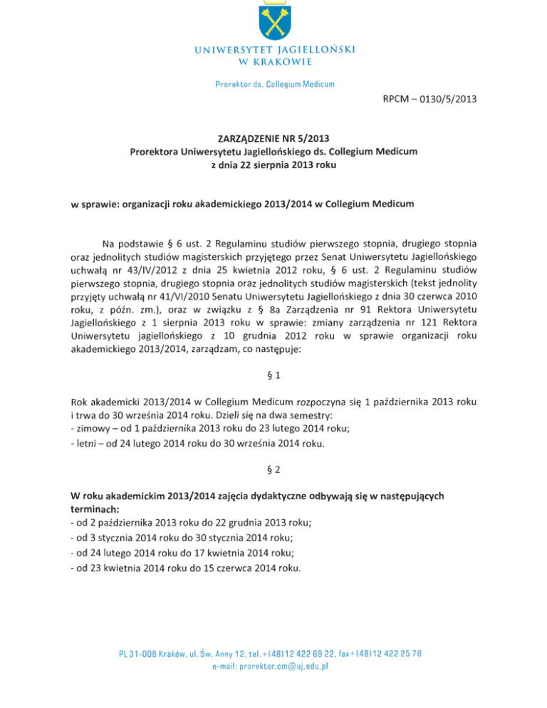 UNIWERSYTET JAG I ELLO Ń S KI W KRAKOWIE Prorektor ds . Collegium Medicum RPCM - 0130/5/2013 ZARZĄDZENIE NR 5/2013 Prorektora Uniwersytetu Jagiellońskiego ds. Collegium Medicum z dnia 22 sierpnia 2013 roku w sprawie: organizacji roku akademickiego 2013/2014 w Collegium Medicum Na podstawie § 6 ust. 2 Regulaminu studiów pierwszego stopnia, drugiego stopnia oraz jednolitych studiów magisterskich przyjętego przez Senat Uniwersytetu Jagiellońskiego uchwałą nr 43/IV/2012 z dnia 25 kwietnia 2012 roku, § 6 ust. 2 Regulaminu studiów pierwszego stopnia, drugiego stopnia oraz jednolitych studiów magisterskich (tekst jednolity przyjęty uchwałą nr 41/VI/2010 Senatu Uniwersytetu Jagiellońskiego z dnia 30 czerwca 2010 roku, z późn. zm .), oraz w związku z § 8a Zarządzenia nr 91 Rektora Uniwersytetu Jagiellońskiego z 1 sierpnia 2013 roku w sprawie: zmiany zarządzenia nr 121 Rektora Uniwersytetu jagiellońskiego z 10 grudnia 2012 roku w sprawie organizacji roku akademickiego 2013/2014, zarządzam, co następuje: §1 Rok akademicki 2013/2014 w Collegium Medicum rozpoczyna się 1 października 2013 roku i trwa do 30 września 2014 roku. Dzieli się na dwa semestry: - zimowy- od l października 2013 roku do 23 lutego 2014 roku; -letni- od 24 lutego 2014 roku do 30 września 2014 roku . §2 W roku akademickim 2013/2014 zajęcia dydaktyczne odbywają się w następujących terminach: - od 2 października 2013 roku do 22 grudnia 2013 roku; - od 3 stycznia 2014 roku do 30 stycznia 2014 roku; - od 24 lutego 2014 roku do 17 kwietnia 2014 roku; - od 23 kwietnia 2014 roku do 15 czerwca 2014 roku. PL 31-008 Kraków , ul. Św . Anny 12 , te l. + (481 12 422 69 22 , fa x+ (48) 12 42 2 25 78 e-mail : pro r ektor.cm @uj .edu .pl §3 W roku akademickim 2013/2014 sesje egzaminacyjne odbywają się w następujących terminach: Zimowa: od 31 stycznia 2014 roku do 10 lutego 2014 roku. Zimowa poprawkowa: od 17 lutego 2014 roku do 23 lutego 2014 roku . Letnia: od 16 czerwca 2014 roku do 29 czerwca 2014 roku . Letnia poprawkowa: od 1 września 2014 roku do 15 września 2014 roku. §4 W roku akademickim 2013/2014 dniami wolnymi od zajęć są: Przerwa świąteczna: od 23 grudnia 2013 roku do 2 stycznia 2014 roku . Przerwa semestralna: od 11 lutego 2014 roku do 16 lutego 2014 roku . Przerwa świąteczna: od 18 kwietnia 2014 roku do 22 kwietnia 2014 roku . Przerwa wakacyjna: od 30 czerwca 2014 roku do 30 września 2014 roku. Dodatkowym dniem wolnym od zajęć jest: -piątek w tygodniu, w którym odbywają się Juwenalia. §S Dziekan wydziału - z ważnych powodów związanych z działalnością wydziału - może ustanowić dodatkowe godziny wolne od zajęć w innych dniach, niż wskazane w§ 4. §6 Rektor może, na uzasadniony wniosek dziekana wydziału zaopiniowany przez Wydziałową Radę Samorządu Studentów, zmienić termin sesji egzaminacyjneL o ile zagwarantowana zostanie realizacja pełnego programu kształcenia i planu studiów. §7 Dziekani zobowiązani są do zapewnienia pełnej realizacji planowanych godzin zaJęc dydaktycznych. Do zrealizowania wskazanego w programie kształcenia i planie studiów wymiaru godzin wykorzystane mogą zostać metody i techniki kształcenia na odległość (e-learning). Prowadzenie zajęć z wykorzystaniem metod i technik kształcenia na odległość regulują odrębne przepisy. §8 Okres od 16 do 30 września 2014 roku przeznaczony jest na z ałatwianie spraw organizacyjnych związanych z zakończeniem roku akademickiego 2013/2014 i rozpoczęciem roku akademickiego 2014/2015. §9 Szczegółową organizację roku akademickiego dla poszczególnych kierunków studiów niestacjonarnych ustala dziekan wydziału w oparciu o obowiązujące plany studiów i programy kształcenia . § 10 Z dniem 30 września 2013 roku traci moc Zarządzenie nr 2/2012 Prorektora Uniwersytetu Jagiellońskiego ds. Collegium Medicum z dnia S stycznia 2012 roku w sprawie organiza cji roku akademickiego 2012/2013 w Collegium Medicum. § 11 Zarządzenie wchodzi w życie z dniem 1 października 2013 roku. Prorektor Uniwersytetu Jagiellońskiego ds. Collegium Medicum 1;~t.bC::~f.f!3 Otrzymują: lx P e ł nomoc ni k Rekto ra UJ ds. kształce ni a i w s p ó łp racy mi ę d z yn a rodo wej w Co llegium Medicu m l x Wszystki e jednostki organizacyjn e UJ CM l x Rada Sa m o rząd u Stud entów UJ CM l x Towarzystwo Doktorantów UJ l x a/ a