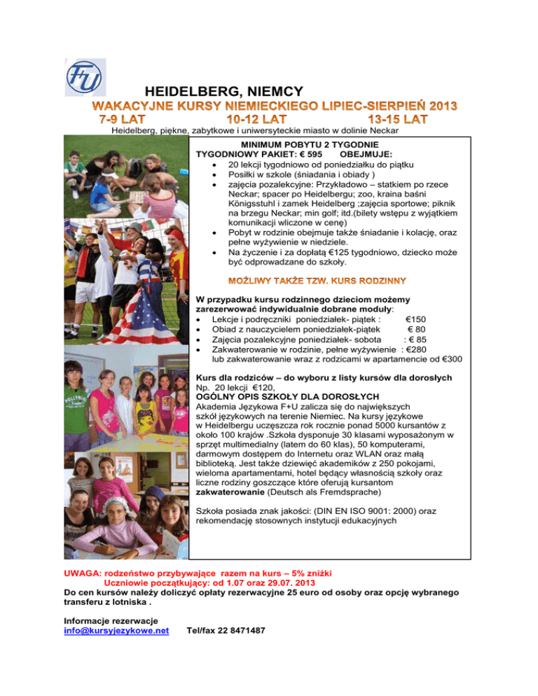 HEIDELBERG, NIEMCY Heidelberg, piękne, zabytkowe i uniwersyteckie miasto w dolinie Neckar MINIMUM POBYTU 2 TYGODNIE TYGODNIOWY PAKIET: € 595 OBEJMUJE: 20 lekcji tygodniowo od poniedziałku do piątku Posiłki w szkole (śniadania i obiady ) zajęcia pozalekcyjne: Przykładowo – statkiem po rzece Neckar; spacer po Heidelbergu; zoo, kraina baśni Königsstuhl i zamek Heidelberg ;zajęcia sportowe; piknik na brzegu Neckar; min golf; itd.(bilety wstępu z wyjątkiem komunikacji wliczone w cenę) Pobyt w rodzinie obejmuje także śniadanie i kolację, oraz pełne wyżywienie w niedziele. Na życzenie i za dopłatą €125 tygodniowo, dziecko może być odprowadzane do szkoły. W przypadku kursu rodzinnego dzieciom możemy zarezerwować indywidualnie dobrane moduły: Lekcje i podręczniki poniedziałek- piątek : €150 Obiad z nauczycielem poniedziałek-piątek € 80 Zajęcia pozalekcyjne poniedziałek- sobota : € 85 Zakwaterowanie w rodzinie, pełne wyżywienie : €280 lub zakwaterowanie wraz z rodzicami w apartamencie od €300 Kurs dla rodziców – do wyboru z listy kursów dla dorosłych Np. 20 lekcji €120, OGÓLNY OPIS SZKOŁY DLA DOROSŁYCH Akademia Językowa F+U zalicza się do największych szkół językowych na terenie Niemiec. Na kursy językowe w Heidelbergu uczęszcza rok rocznie ponad 5000 kursantów z około 100 krajów .Szkoła dysponuje 30 klasami wyposażonym w sprzęt multimedialny (latem do 60 klas), 50 komputerami, darmowym dostępem do Internetu oraz WLAN oraz małą biblioteką. Jest także dziewięć akademików z 250 pokojami, wieloma apartamentami, hotel będący własnością szkoły oraz liczne rodziny goszczące które oferują kursantom zakwaterowanie (Deutsch als Fremdsprache) Szkoła posiada znak jakości: (DIN EN ISO 9001: 2000) oraz rekomendację stosownych instytucji edukacyjnych UWAGA: rodzeństwo przybywające razem na kurs – 5% zniżki Uczniowie początkujący: od 1.07 oraz 29.07. 2013 Do cen kursów należy doliczyć opłaty rezerwacyjne 25 euro od osoby oraz opcję wybranego transferu z lotniska . Informacje rezerwacje [email protected] Tel/fax 22 8471487