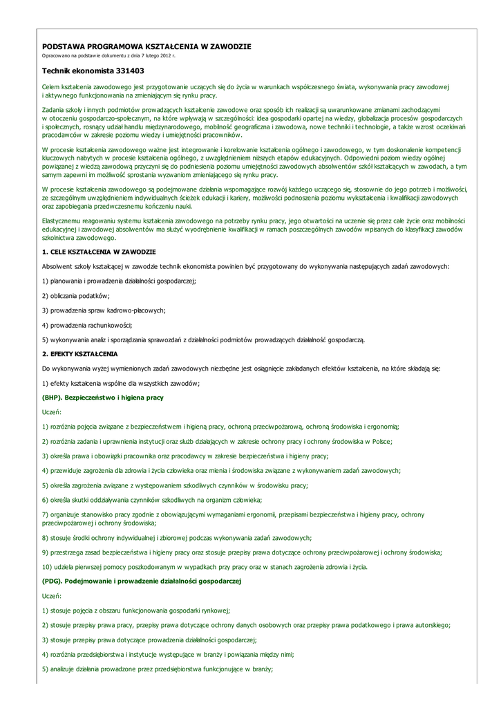 PODSTAWA PROGRAMOWA KSZTAŁCENIA W ZAWODZIE O pracow ano na podstaw ie dokumentu z dnia 7 lutego 2012 r. Technik ekonomista 331403 Celem kształcenia zawodowego jest przygotowanie uczących się do życia w warunkach współczesnego świata, wykonywania pracy zawodowej i aktywnego funkcjonowania na zmieniającym się rynku pracy. Zadania szkoły i innych podmiotów prowadzących kształcenie zawodowe oraz sposób ich realizacji są uwarunkowane zmianami zachodzącymi w otoczeniu gospodarczo-społecznym, na które wpływają w szczególności: idea gospodarki opartej na wiedzy, globalizacja procesów gospodarczych i społecznych, rosnący udział handlu międzynarodowego, mobilność geograficzna i zawodowa, nowe techniki i technologie, a także wzrost oczekiwań pracodawców w zakresie poziomu wiedzy i umiejętności pracowników. W procesie kształcenia zawodowego ważne jest integrowanie i korelowanie kształcenia ogólnego i zawodowego, w tym doskonalenie kompetencji kluczowych nabytych w procesie kształcenia ogólnego, z uwzględnieniem niższych etapów edukacyjnych. Odpowiedni poziom wiedzy ogólnej powiązanej z wiedzą zawodową przyczyni się do podniesienia poziomu umiejętności zawodowych absolwentów szkół kształcących w zawodach, a tym samym zapewni im możliwość sprostania wyzwaniom zmieniającego się rynku pracy. W procesie kształcenia zawodowego są podejmowane działania wspomagające rozwój każdego uczącego się, stosownie do jego potrzeb i możliwości, ze szczególnym uwzględnieniem indywidualnych ścieżek edukacji i kariery, możliwości podnoszenia poziomu wykształcenia i kwalifikacji zawodowych oraz zapobiegania przedwczesnemu kończeniu nauki. Elastycznemu reagowaniu systemu kształcenia zawodowego na potrzeby rynku pracy, jego otwartości na uczenie się przez całe życie oraz mobilności edukacyjnej i zawodowej absolwentów ma służyć wyodrębnienie kwalifikacji w ramach poszczególnych zawodów wpisanych do klasyfikacji zawodów szkolnictwa zawodowego. 1. CELE KSZTAŁCENIA W ZAWODZIE Absolwent szkoły kształcącej w zawodzie technik ekonomista powinien być przygotowany do wykonywania następujących zadań zawodowych: 1) planowania i prowadzenia działalności gospodarczej; 2) obliczania podatków; 3) prowadzenia spraw kadrowo-płacowych; 4) prowadzenia rachunkowości; 5) wykonywania analiz i sporządzania sprawozdań z działalności podmiotów prowadzących działalność gospodarczą. 2. EFEKTY KSZTAŁCENIA Do wykonywania wyżej wymienionych zadań zawodowych niezbędne jest osiągnięcie zakładanych efektów kształcenia, na które składają się: 1) efekty kształcenia wspólne dla wszystkich zawodów; (BHP). Bezpieczeństwo i higiena pracy Uczeń: 1) rozróżnia pojęcia związane z bezpieczeństwem i higieną pracy, ochroną przeciwpożarową, ochroną środowiska i ergonomią; 2) rozróżnia zadania i uprawnienia instytucji oraz służb działających w zakresie ochrony pracy i ochrony środowiska w Polsce; 3) określa prawa i obowiązki pracownika oraz pracodawcy w zakresie bezpieczeństwa i higieny pracy; 4) przewiduje zagrożenia dla zdrowia i życia człowieka oraz mienia i środowiska związane z wykonywaniem zadań zawodowych; 5) określa zagrożenia związane z występowaniem szkodliwych czynników w środowisku pracy; 6) określa skutki oddziaływania czynników szkodliwych na organizm człowieka; 7) organizuje stanowisko pracy zgodnie z obowiązującymi wymaganiami ergonomii, przepisami bezpieczeństwa i higieny pracy, ochrony przeciwpożarowej i ochrony środowiska; 8) stosuje środki ochrony indywidualnej i zbiorowej podczas wykonywania zadań zawodowych; 9) przestrzega zasad bezpieczeństwa i higieny pracy oraz stosuje przepisy prawa dotyczące ochrony przeciwpożarowej i ochrony środowiska; 10) udziela pierwszej pomocy poszkodowanym w wypadkach przy pracy oraz w stanach zagrożenia zdrowia i życia. (PDG). Podejmowanie i prowadzenie działalności gospodarczej Uczeń: 1) stosuje pojęcia z obszaru funkcjonowania gospodarki rynkowej; 2) stosuje przepisy prawa pracy, przepisy prawa dotyczące ochrony danych osobowych oraz przepisy prawa podatkowego i prawa autorskiego; 3) stosuje przepisy prawa dotyczące prowadzenia działalności gospodarczej; 4) rozróżnia przedsiębiorstwa i instytucje występujące w branży i powiązania między nimi; 5) analizuje działania prowadzone przez przedsiębiorstwa funkcjonujące w branży; 6) inicjuje wspólne przedsięwzięcia z różnymi przedsiębiorstwami z branży; 7) przygotowuje dokumentację niezbędną do uruchomienia i prowadzenia działalności gospodarczej; 8) prowadzi korespondencję związaną z prowadzeniem działalności gospodarczej; 9) obsługuje urządzenia biurowe oraz stosuje programy komputerowe wspomagające prowadzenie działalności gospodarczej; 10) planuje i podejmuje działania marketingowe prowadzonej działalności gospodarczej; 11) optymalizuje koszty i przychody prowadzonej działalności gospodarczej. (JOZ). Język obcy ukierunkowany zawodowo Uczeń: 1) posługuje się zasobem środków językowych (leksykalnych, gramatycznych, ortograficznych oraz fonetycznych), umożliwiających realizację zadań zawodowych; 2) interpretuje wypowiedzi dotyczące wykonywania typowych czynności zawodowych artykułowane powoli i wyraźnie, w standardowej odmianie języka; 3) analizuje i interpretuje krótkie teksty pisemne dotyczące wykonywania typowych czynności zawodowych; 4) formułuje krótkie i zrozumiałe wypowiedzi oraz teksty pisemne umożliwiające komunikowanie się w środowisku pracy; 5) korzysta z obcojęzycznych źródeł informacji. (KPS). Kompetencje personalne i społeczne Uczeń: 1) przestrzega zasad kultury i etyki; 2) jest kreatywny i konsekwentny w realizacji zadań; 3) przewiduje skutki podejmowanych działań; 4) jest otwarty na zmiany; 5) potrafi radzić sobie ze stresem; 6) aktualizuje wiedzę i doskonali umiejętności zawodowe; 7) przestr