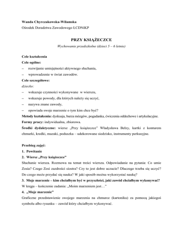 Wanda Chyrczakowska-Wilamska Ośrodek Doradztwa Zawodowego ŁCDNiKP PRZY KSIĄŻECZCE Wychowanie przedszkolne (dzieci 5 – 6 letnie) Cele kształcenia Cele ogólne: rozwijanie umiejętności aktywnego słuchania, wprowadzenie w świat zawodów. Cele szczegółowe: dziecko: wskazuje czynności wykonywane w wierszu, wskazuje powody, dla których należy się uczyć, nazywa znane zawody, opowiada swoje marzenie o tym kim chce być? Metody kształcenia: dyskusja, burza mózgów, pogadanka, ćwiczenia oddechowe i artykulacyjne. Formy pracy: indywidualna, zbiorowa. Środki dydaktyczne: wiersz „Przy książeczce” Władysława Bełzy, kartki z konturem chmurki, kredki, mazaki, poduszka – udekorowane siedzisko, instrumenty perkusyjne. Przebieg zajęć: 1. Powitanie 2. Wiersz „Przy książeczce” Słuchanie wiersza. Rozmowa na temat treści wiersza. Odpowiadanie na pytania: Co umie Zosia? Czego Zosi zazdrości siostra? Czy to jest dobre uczucie? Dlaczego trzeba się uczyć? Do czego może przydać się nauka? W jaki sposób można wykorzystać naukę? 3. Moje marzenie – kim chciałbym być w przyszłości, jaki zawód chciałbym wykonywać? W kręgu – kończenie zadania: „Moim marzeniem jest…” 4. „Moje marzenie” Graficzne przedstawienie swojego marzenia na chmurce (kartoniku) za pomocą jakiegoś symbolu albo rysunku – zawód który chciałbym wykonywać. 5. Uśmiechnij się Dzieci siadają w kręgu, w środku kręgu leży poduszka na której po kolei każde dziecko siada, a pozostałe dzieci mówią mu coś miłego. Rozmowa na temat jak się czujemy gdy słyszymy miłe rzeczy i niemiłe, co należy robić, aby w grupie było przyjemnie. 6. Wyklaszczę Ci kim chcę być Dzieci otrzymują instrumenty perkusyjne, wszyscy wyklaskują a następnie za pomocą instrumentów wystukują sylaby w nazwach zawodów, które pojawiły się na chmurkach. 7. „Puszczanie” marzeń Dzieci w myślach umieszczają swoje marzenia na chmurce a następnie nabierają powietrze i wydychając powietrze, dmuchają w chmurkę, która leci wysoko. Ćwiczenia narządów artykulacyjnych: ćwiczenia warg – zaokrąglanie i rozciąganie warg przy zwartych szczękach, przesyłanie całusków nadymanie policzków jak balonik, szeroki uśmiech (z pokazywaniem zębów), ćwiczenia języka – oblizywanie warg, wysuwanie języka do przodu i cofanie w głąb jamy ustnej (np. zabawa: myszka chowa się do norki), układanie języka w grot (wąski), układanie języka w łopatę (szeroki), ćwiczenia żuchwy – ziewanie naśladowanie żucia krowy. 8. Zakończenie Podsumowanie zajęć. Podziękowanie za udział. Załącznik nr 1 Władysław Bełza Przy książeczce Zosia panienką jest już nielada, Wie nawet, jak się literki składa, Do stu bez myłki liczyć już umie, I najtrudniejszy wierszyk rozumie. Jakże serdecznie tej uczoności, Młodsza Marynia siostrze zazdrości! Lecz zazdrość, Maniu, to brzydka wada, Trzeba się uczyć, to trudna rada!