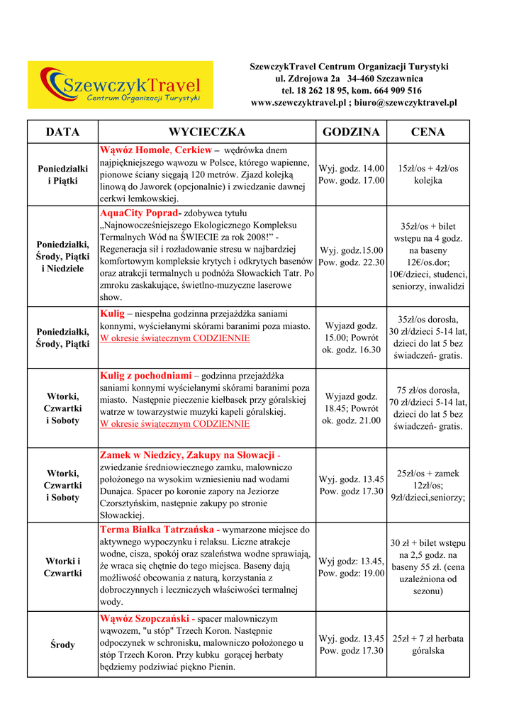 SzewczykTravel Centrum Organizacji Turystyki ul. Zdrojowa 2a 34-460 Szczawnica tel. 18 262 18 95, kom. 664 909 516 www.szewczyktravel.pl ; [email protected] DATA WYCIECZKA GODZINA CENA Wąwóz Homole, Cerkiew – wędrówka dnem Poniedziałki i Piątki najpiękniejszego wąwozu w Polsce, którego wapienne, Wyj. godz. 14.00 pionowe ściany sięgają 120 metrów. Zjazd kolejką Pow. godz. 17.00 linową do Jaworek (opcjonalnie) i zwiedzanie dawnej cerkwi łemkowskiej. 15zł/os + 4zł/os kolejka AquaCity Poprad- zdobywca tytułu Poniedziałki, Środy, Piątki i Niedziele „Najnowocześniejszego Ekologicznego Kompleksu 35zł/os + bilet Termalnych Wód na ŚWIECIE za rok 2008!” wstępu na 4 godz. Regeneracja sił i rozładowanie stresu w najbardziej Wyj. godz.15.00 na baseny komfortowym kompleksie krytych i odkrytych basenów Pow. godz. 22.30 12€/os.dor; oraz atrakcji termalnych u podnóża Słowackich Tatr. Po 10€/dzieci, studenci, zmroku zaskakujące, świetlno-muzyczne laserowe seniorzy, inwalidzi show. Kulig – niespełna godzinna przejażdżka saniami Poniedziałki, Środy, Piątki konnymi, wyściełanymi skórami baranimi poza miasto. W okresie świątecznym CODZIENNIE 35zł/os dorosła, Wyjazd godz. 30 zł/dzieci 5-14 lat, 15.00; Powrót dzieci do lat 5 bez ok. godz. 16.30 świadczeń- gratis. Kulig z pochodniami – godzinna przejażdżka Wtorki, Czwartki i Soboty saniami konnymi wyściełanymi skórami baranimi poza miasto. Następnie pieczenie kiełbasek przy góralskiej watrze w towarzystwie muzyki kapeli góralskiej. W okresie świątecznym CODZIENNIE 75 zł/os dorosła, Wyjazd godz. 70 zł/dzieci 5-14 lat, 18.45; Powrót dzieci do lat 5 bez ok. godz. 21.00 świadczeń- gratis. Zamek w Niedzicy, Zakupy na Słowacji Wtorki, Czwartki i Soboty zwiedzanie średniowiecznego zamku, malowniczo położonego na wysokim wzniesieniu nad wodami Dunajca. Spacer po koronie zapory na Jeziorze Czorsztyńskim, następnie zakupy po stronie Słowackiej. Wyj. godz. 13.45 Pow. godz 17.30 25zł/os + zamek 12zł/os; 9zł/dzieci,seniorzy; Terma Białka Tatrzańska - wymarzone miejsce do Wtorki i Czwartki aktywnego wypoczynku i relaksu. Liczne atrakcje 30 zł + bilet wstępu wodne, cisza, spokój oraz szaleństwa wodne sprawiają, na 2,5 godz. na Wyj godz: 13.45, że wraca się chętnie do tego miejsca. Baseny dają baseny 55 zł. (cena Pow. godz: 19.00 możliwość obcowania z naturą, korzystania z uzależniona od dobroczynnych i leczniczych właściwości termalnej sezonu) wody. Wąwóz Szopczański - spacer malowniczym Środy wąwozem, "u stóp" Trzech Koron. Następnie odpoczynek w schronisku, malowniczo położonego u stóp Trzech Koron. Przy kubku gorącej herbaty będziemy podziwiać piękno Pienin. Wyj. godz. 13.45 25zł + 7 zł herbata Pow. godz 17.30 góralska Jaskinia Bielańska, Szczyrbskie PlesoCzwartki i Niedziele 50zł/os + bilet do najpiękniejsza jaskinia w Tatrzańskiej Kotlinie. Spacer jaskini 7€/os; 6€/os nad tatrzańskim stawem , zaliczanym do Wyj godz: 8.45, stud, emer; najpiękniejszych na Słowacji. Następnie przejazd Pow godz: 17.30 3,5€/dzieci, ren.; panoramiczną kolejką „elektryczką” do Starego bilet "Eelektryczka” Smokowca. 1,5€/os Czerwony Klasztor - Zwiedzanie klasztoru w Czwartek przepięknym otoczeniu, pod szczytem Trzech Koron nad brzegiem Dunajca. Kartuzjańsko – kamedulski klasztor i kościół pod wezwaniem św. Antoniego. Możliwość zakupów spożywczych na Słowacji. 25zł/os + bilet wstępu do Wyj. godz 13.45, klasztoru: 3€/os. Pow. godz.17.30 dorosła, 2€/os seniorzy, 1€/dzieci Wieczorek z Kapelą Goralską - Przejazd do Piątki restauracji, która posiada regionalny, góralski wystrój. Niezapomnianych wrażeń dostarczy specjalność Szefa Kuchni – kwaśnica góralska. Dopełnieniem wieczoru będzie występ kapeli góralskiej. Wyjazd godz. 18.45; Powrót godz. 21.30 25zł/os (cena zawiera przejazd w dwie strony, poczęstunek, kapela góralska - godz. grania) Wyjazd godz. 8.30; Powrót godz. 12.30 15zł/os Wyj. godz: 8.45, Pow godz: 17.30 40zł/os + bilet na kolejkę 17zł/os Wyj godz: 8.45, Pow godz: 17.30 45zł/os + kolejka 12zł/os, ulgowy 9zł/os; Muzeum Nikifora - 10zł/os, ulgowy - 6zł/os; Jarmark Podhalański w Nowym Targu - na placu Soboty kupić i sprzedać można dosłownie wszystko. Zarówno wyroby regionalne jaki i wiele rzeczy potrzebnych „na co dzień”. Kożuchy, skóry owcze, oscypki to najchętniej kupowane produkty. Zakopane – sentymentalna podróż, a w niej Niedziele Niedziele najważniejsze zabytki i wjazd kolejką na Gubałówkę. Po drodze Ludźmierz z Sanktuarium Matki Boskiej Ludźmierskiej, Królowej i Gaździny Podhala oraz Chochołów – żywy skansen budownictwa regionalnego pod ochroną UNESCO. Słynny deptak, Muzeum Nikifora, Pijalnia Wód mineralnych oraz Góra Parkowa w Krynicy. Po drodze Klasztor Klarysek założony przez Księżną Kingę. Ołtarz Papieski i muzeum w Starym Sączu Wyjazdy na narty do stacji narciarskich Codziennie szaleństwo na doskonale przygotowanych i Wyjazd godz. Jaworki (10zł/os), oświetlonych stokach Pienin. Wyciągi krzesełkowe 9.30 oraz 14.00; Krościenko (10zł/os), oraz wyciągi orczykowe, trasy dla początkujących jak i Powrót godz. Kluszkowce (15zł/os) zaawansowanych narciarzy - Zniżki dla grup, oraz 14.30 oraz 18.30 Niedzica (15zł/os) wyazdy spod budynków. Informacje i zapisy w biurze SzewczykTravel ul. Zdrojowa 2A; Szczawnica (w samym centrum miasta) lub tel. 664 909 516