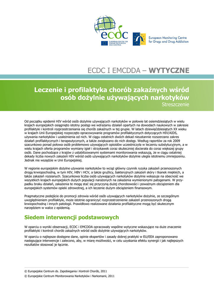 ECDC I EMCDDA – WYTYCZNE Leczenie i profilaktyka chorób zakaźnych wśród osób dożylnie używających narkotyków Streszczenie Od początku epidemii HIV wśród osób dożylnie używających narkotyków w połowie lat osiemdziesiątych w wielu krajach europejskich osiągnięto istotny postęp we wdrażaniu działań opartych na dowodach naukowych w zakresie profilaktyki i kontroli rozprzestrzeniania się chorób zakaźnych w tej grupie. W latach dziewięćdziesiątych XX wieku w krajach Unii Europejskiej rozpoczęto opracowywanie programów profilaktycznych dotyczących HIV/AIDS, używania narkotyków i uzależnienia od nich. W ciągu ostatnich dwóch dekad nieustannie rozszerzano zakres działań profilaktycznych i terapeutycznych, a także zwiększano do nich dostęp. Według raportów za rok 2009 szacunkowo ponad połowa osób problemowo używających opioidów uczestniczyła w leczeniu substytucyjnym, a w wielu krajach oferta programów wymiany igieł i strzykawek coraz skuteczniej docierała do coraz większej grupy osób. Dane pochodzące z krajów z ustabilizowanymi systemami monitorowania wskazują, że w ciągu ostatniej dekady liczba nowych zakażeń HIV wśród osób używających narkotyków dożylnie uległa istotnemu zmniejszeniu. Jednak nie wszędzie w Unii Europejskiej. W regionie europejskim dożylne używanie narkotyków to wciąż główny czynnik ryzyka zakażeń przenoszonych drogą krwiopochodną, w tym HIV, HBV i HCV, a także gruźlicy, bakteryjnych zakażeń skóry i tkanek miękkich, a także zakażeń rozsianych. Szacunkowa liczba osób używających narkotyków dożylnie wskazuje na obecność we wszystkich krajach europejskich dużych populacji narażonych na zakażenia wymienionymi patogenami. W przypadku braku działań, zakażenia te mogą stać się przyczyną dużej chorobowości i poważnym obciążeniem dla europejskich systemów opieki zdrowotnej, a ich leczenie dużym obciążeniem finansowym. Pragmatyczne podejście do promocji zdrowia wśród osób używających narkotyków dożylnie, ze szczególnym uwzględnieniem profilaktyki, może istotnie ograniczyć rozprzestrzenienie zakażeń przenoszonych drogą krwiopochodną i innych patologii. Prawidłowo realizowane działania profilaktyczne mogą być skutecznym narzędziem w walce z epidemią. Siedem interwencji podstawowych W oparciu o wyniki obserwacji, ECDC i EMCDDA opracowały wspólne wytyczne wskazujące na duże znaczenie profilaktyki i kontroli chorób zakaźnych wśród osób dożylnie używających narkotyków. W oparciu o najlepsze dostępne dane, opinie ekspertów i zasady dobrej praktyki w EU/EEA zaproponowano następujące interwencje i zalecono, aby, w miarę możliwości, w celu uzyskania efektu synergii i jak najlepszych rezultatów stosować je łącznie. © Europejskie Centrum ds. Zapobiegania i Kontroli Chorób, 2011 © Europejskie Centrum Monitorowania Narkotyków i Narkomanii, 2011 Leczenie i profilaktyka chorób zakaźnych wśród osób dożylnie używających narkotyków Interwencje podstawowe Sprzęt do wstrzyknięć: Dystrybucja i legalny dostęp do czystego sprzętu do wstrzyknięć, w tym do wystarczającej ilości bezpłatnych i sterylnych igieł i strzykawek, powinny stanowić jeden z elementów skojarzonych i wielokierunkowych działań programów redukcji szkód, poradnictwa i terapii. Szczepienia: HAV, HBV, tężec, grypa i, zwłaszcza w przypadku osób żyjących z HIV, przeciw pneumokokom. Terapia uzależnienia od narkotyków: Programy substytucji opioidowej i inne skuteczne metody leczenia uzależnienia od narkotyków. Diagnostyka: Rutynowy dostęp do dobrowolnej, poufnej i w pełni świadomej diagnostyki zakażeń HIV, HCV (HBV w przypadku osób niepoddanych szczepieniu), prątkiem gruźlicy i innymi patogenami, a także zapewnienie kontaktu z poradniami specjalistycznymi. Leczenie zakażeń: Leczenie zakażeń HIV, HBV lub HCV zgodnie z wytycznymi. Terapia tuberkulostatyczna w przypadku rozpoznania czynnej gruźlicy, natomiast w przypadku podejrzenia gruźlicy utajonej należy rozważyć wdrożenie profilaktyki. Inne zakażenia – zgodnie ze wskazaniami klinicznymi. Promocja zdrowia: Promocja bezpieczniejszych zachowań związanych ze wstrzyknięciami, zdrowia seksualnego (w tym stosowania prezerwatyw), profilaktyki, diagnostyki i dostępu do terapii. Działania celowane: Poszczególne programy powinny funkcjonować w sposób skojarzony i być zorganizowane i prowadzone zgodnie z potrzebami odbiorców i lokalnymi warunkami. Zarówno programy stacjonarne, jak i ruchome powinny uwzględniać dostęp do terapii uzależnień, redukcji szkód, poradnictwa i diagnostyki, a także poradni podstawowej i specjalistycznej opieki zdrowotnej. Efekt synergii a kojarzenie interwencji podstawowych Niedawne badania i doświadczenia zebrane podczas realizacji programów profilaktycznych wskazują na dodatkowe korzyści związane z jednoczesnym oferowaniem szeregu świadczeń dopasowanych do potrzeb klientów, korzyści pozwalających istotnie ograniczyć liczbę nowych zakażeń. Grupa docelowa Celem niniejszych wytycznych jest wsparcie lokalnych instytucji w Europie w tworzeniu rzetelnych, opartych na wynikach naukowych, pragmatycznych i racjonalnych programów zdrowia publicznego w zakresie profilaktyki i kontroli zakażeń wśród osób używających narkotyków dożylnie. Z wytycznych powinny korzystać osoby projektujące i wdrażające programy zdrowia publicznego w zakresie chorób zakaźnych, zdrowia publicznego, uzależnień i zdrowia psychicznego, opieki socjalnej i kontroli narkotyków, zarówno na poziomie krajowym jak i regionalnym. Niniejsze wytyczne są zgodne z aktualnie obowiązującymi na terenie całej Unii Europejskiej wytycznymi dotyczącymi kontroli narkotyków i chorób zakaźnych, dodatkowo wzmacniając ich przekaz. Mają również stanowić szczegółowy przegląd najbardziej aktualnej i rzetelnej wiedzy, uzupełniając wcześniejsze opracowania o