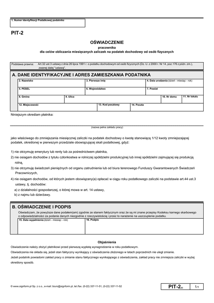 1. Numer Identyfikacji Podatkowej podatnika PIT-2 OŚWIADCZENIE pracownika dla celów obliczania miesięcznych zaliczek na podatek dochodowy od osób fizycznych Podstawa prawna: Art.32 ust.3 ustawy z dnia 26 lipca 1991 r. o podatku dochodowym od osób fizycznych (Dz. U. z 2000 r. Nr 14, poz.176 z późn. zm.), zwanej dalej "ustawą". A. DANE IDENTYFIKACYJNE I ADRES ZAMIESZKANIA PODATNIKA 2. Nazwisko 3. Pierwsze imię 4. Data urodzenia (dzień - miesiąc - rok) 5. PESEL 6. Województwo 7. Powiat 8. Gmina 9. Ulica 12. Miejscowość 11. Nr lokalu 10. Nr domu 13. Kod pocztowy 14. Poczta Niniejszym określam płatnika: (nazwa pełna zakładu pracy) jako właściwego do zmniejszania miesięcznej zaliczki na podatek dochodowy o kwotę stanowiącą 1/12 kwoty zmniejszającej podatek, określonej w pierwszym przedziale obowiązującej skali podatkowej, gdyż: 1) nie otrzymuję emerytury lub renty lub za pośrednictwem płatnika, 2) nie osiagam dochodów z tytułu członkostwa w rolniczej spółdzielni produkcyjnej lub innej spółdzielni zajmującej się produkcją rolną, 3) nie otrzymuję świadczeń pieniężnych od organu zatrudnienia lub od biura terenowego Funduszy Gwarantowanych Świadczeń Pracowniczych, 4) nie osiągam dochodów, od których jestem obowiązany(a) opłacać w ciągu roku podatkowego zaliczki na podstawie art.44 ust.3 ustawy, tj. dochodów: a) z działalności gospodarczej, o której mowa w art. 14 ustawy, b) z najmu lub dzierżawy. B. OŚWIADCZENIE I PODPIS Oświadczam, że powyższe dane podałem(am) zgodnie ze stanem faktycznym oraz że są mi znane przepisy Kodeksu karnego skarbowego o odpowiedzialności za podanie danych niezgodnie z rzeczywistością i przez to narażenie na uszczuplenie podatku. 15. Data wypełnienia (dzień - miesiąc - rok) 16. Podpis Objaśnienia Oświadczenie należy złożyć płatnikowi przed pierwszą wypłatą wynagrodzenia w roku podatkowym. Oświadczenia nie składa się, jeżeli stan faktyczny wynikający z oświadczenia złożonego w latach poprzednich nie uległ zmianie. Jeżeli podatnik powiadomi zakład pracy o zmianie stanu faktycznego wynikającego z oświadczenia, zakład pracy nie zmniejsza zaliczki w wyżej określony sposób. © www.signform.pl Sp. z o.o., e-mail: [email protected], tel./fax. (0-22) 337-11-51, (0-22) 337-11-52 PIT-2 (2) 1/1