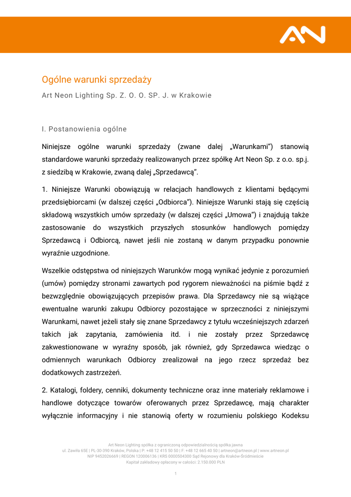Ogólne warunki sprzedaży Art Neon Lighting Sp. Z. O. O. SP. J. w Krakowie I. Postanowienia ogólne Niniejsze ogólne warunki sprzedaży (zwane dalej „Warunkami”) stanowią standardowe warunki sprzedaży realizowanych przez spółkę Art Neon Sp. z o.o. sp.j. z siedzibą w Krakowie, zwaną dalej „Sprzedawcą”. 1. Niniejsze Warunki obowiązują w relacjach handlowych z klientami będącymi przedsiębiorcami (w dalszej części „Odbiorca”). Niniejsze Warunki stają się częścią składową wszystkich umów sprzedaży (w dalszej części „Umowa”) i znajdują także zastosowanie do wszystkich przyszłych stosunków handlowych pomiędzy Sprzedawcą i Odbiorcą, nawet jeśli nie zostaną w danym przypadku ponownie wyraźnie uzgodnione. Wszelkie odstępstwa od niniejszych Warunków mogą wynikać jedynie z porozumień (umów) pomiędzy stronami zawartych pod rygorem nieważności na piśmie bądź z bezwzględnie obowiązujących przepisów prawa. Dla Sprzedawcy nie są wiążące ewentualne warunki zakupu Odbiorcy pozostające w sprzeczności z niniejszymi Warunkami, nawet jeżeli stały się znane Sprzedawcy z tytułu wcześniejszych zdarzeń takich jak zapytania, zamówienia itd. i nie zostały przez Sprzedawcę zakwestionowane w wyraźny sposób, jak również, gdy Sprzedawca wiedząc o odmiennych warunkach Odbiorcy zrealizował na jego rzecz sprzedaż bez dodatkowych zastrzeżeń. 2. Katalogi, foldery, cenniki, dokumenty techniczne oraz inne materiały reklamowe i handlowe dotyczące towarów oferowanych przez Sprzedawcę, mają charakter wyłącznie informacyjny i nie stanowią oferty w rozumieniu polskiego Kodeksu Art Neon Lighting spółka z ograniczoną odpowiedzialnością spółka jawna ul. Zawiła 65E | PL-30-390 Kraków, Polska | P: +48 12 415 50 50 | F: +48 12 665 40 50 | [email protected] | www.artneon.pl NIP 9452026669 | REGON 120006136 | KRS 0000504300 Sąd Rejonowy dla Kraków-Śródmieście Kapitał zakładowy opłacony w całości: 2.150.000 PLN 1 Cywilnego, a jedynie zaproszenie do negocjacji. Zawarte w nich informacje o właściwościach mają charakter orientacyjny i nie mogą być podstawą do wysuwania roszczeń. Wzorce mają wyłącznie charakter materiałów poglądowych oraz wystawowych. II. Zamówienia 1. Dostarczenie wszystkich informacji dotyczących poprawnej realizacji zamówienia, a w szczególności dotyczących: ilości, asortymentu, kolorystyki, warunków technicznych zamawianych towarów, dokładnej nazwy i adresu Odbiorcy oraz miejsca sprzedaży leżą po stronie Odbiorcy. 2. Sprzedaż następuje na podstawie zamówienia i potwierdzenia jego przyjęcia przez Sprzedawcę. Zamówienie to stanowi ofertę w rozumieniu kodeksu cywilnego, a Odbiorca związany jest złożonym zamówieniem tak długo jak długo go nie odwoła zgodnie z art. 66[2] KC, przy czym Odbiorca uprawniony jest do odwołania zamówienia nie wcześniej niż po upływie 14 (czternastu) dni od dnia jego wpływu u Sprzedawcy. Zamówienia składa się w formie pisemnej, pocztą elektroniczną, fax’em lub za pośrednictwem strony internetowej. W tej samej formie, w jakiej złożono zamówienie, następuje potwierdzenie przyjęcia zamówienia przez Sprzedawcę. Zamówienie złożone przez Odbiorcę w formie elektronicznej wiąże Odbiorcę bez względu na to, czy Sprzedawca potwierdzi jego otrzymanie. Wyłącza się zastosowanie przepisów art.66[1] §1-§3 KC. Ewentualne potwierdzenie przez Sprzedawcę faktu otrzymania zamówienia nie oznacza w żadnym przypadku potwierdzenia jego przyjęcia. 3. Zamówienia Odbiorcy wymagają każdorazowo wyraźnego potwierdzenia ich przyjęcia przez Sprzedawcę z zastrzeżeniem ust. 4 poniżej. Wyłącza się możliwość dorozumianego przyjęcia zamówienia przez Sprzedawcę, o którym mowa w art. 68[2] Art Neon Lighting spółka z ograniczoną odpowiedzialnością spółka jawna ul. Zawiła 65E | PL-30-390 Kraków, Polska | P: +48 12 415 50 50 | F: +48 12 665 40 50 | [email protected] | www.artneon.pl NIP 9452026669 | REGON 120006136 | KRS 0000504300 Sąd Rejonowy dla Kraków-Śródmieście Kapitał zakładowy opłacony w całości: 2.150.000 PLN 2 KC. Jeżeli potwierdzenie przyjęcia zamówienia przez Sprzedawcę różni się od treści zamówienia złożonego przez Odbiorcę zawarcie Umowy następuje na zaproponowanych przez Sprzedawcę warunkach, jeżeli Odbiorca najpóźniej w terminie 2 dni od dnia otrzymania tego potwierdzenia nie złoży na piśmie wyraźnego sprzeciwu. 4. Zawarcie Umowy sprzedaży następuje z chwilą otrzymania przez Odbiorcę potwierdzenia przez Sprzedawcę przyjęcia zamówienia, nie później jednak niż z chwilą realizacji sprzedaży. Jakiekolwiek zmiany warunków sprzedaży zawartych w potwierdzeniu zamówienia wymagają potwierdzenia przez Sprzedawcę w formie pisemnej pod rygorem nieważności. 5. Ustne lub telefoniczne ustalenia mają moc wiążącą z chwilą ich wyraźnego pisemnego potwierdzenia przez Sprzedawcę. 6. Składając zamówienie Odbiorca potwierdza swoją zdolność płatniczą oraz kredytową. 7. Odbiorca przyjmuje do wiadomości, że Sprzedawca może uzależnić realizację sprzedaży od wcześniejszego uregulowania przez Odbiorcę wszelkich ewentualnych zaległości Sprzedawcę płatniczych przedpłat wobec Sprzedawcy, względnie złożenie dokonania określonego wymaganych przez przez Sprzedawcę zabezpieczenia zapłaty, a na wypadek nieuczynienia zadość tym obowiązkom Sprzedawcy przysługuje prawo odstąpienia od Umowy w myśl Pkt. IV ust. 5 lub ust. 9 niniejszych Warunków. III. Wykonanie umowy 1. W przypadku braku odmiennych wyraźnych pisemnych uzgodnień sprzedaż towaru następuje na warunkach EXW magazyn Sprzedawcy w Krakowie (według Incoterms 2010). Art Neon Lighting spółka z ograniczoną odpowiedzialnością spółka jawna ul. Zawiła 65E | PL-30-390 Kraków, Polska | P: +48 12 415 50 50 | F: +48 12 665 40 50 | [email protected] | www.artneon.pl NIP 9452026669 | REGON 120