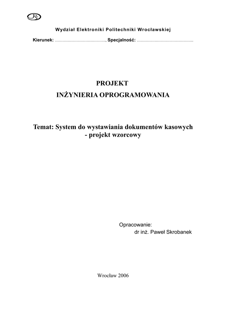 Wydział Elektroniki Politechniki Wrocławskiej Kierunek: …………………………………., Specjalność: …………….……………………….. PROJEKT INŻYNIERIA OPROGRAMOWANIA Temat: System do wystawiania dokumentów kasowych - projekt wzorcowy Opracowanie: dr inż. Paweł Skrobanek Wrocław 2006 2 Spis treści: 1. Opis projektowanego systemu................................................................................................ 3 1.2. Opis słowny......................................................................................................................3 1.2. Kontekst zewnętrzny projektowanego podsystemu......................................................... 4 1.3 Wzory dokumentów..........................................................................................................4 2. Diagram przypadków użycia – identyfikacja i opis usług świadczonych przez system.........6 3 1. Opis projektowanego systemu 1.2. Opis słowny Przedmiot działalności firmy – nie jest istotny, można wyobrazić sobie rejestracje wpłat i wypłat dla firmy prowadzącej loterie, firmy ubezpieczeniowej itp. Projekt będzie obejmował tylko system obsługujący wpłaty i wypłaty gotówkowe z kasy firmy. Przedmiotem projektowania jest system umożliwiający rejestrowanie operacji kasowych w firmie ZABAWA. Nie jest to typowy system kasowy. W naszej firmie kasy są „wirtualne”, to znaczy jest kilka osób, które pobierają opłaty od klientów lub wypłacają im pieniądze w tak zwanym „terenie” (np. u klienta, w oddziałach naszej firmy). Od systemu oczekuje się zatem, że poprzez terminale (np. laptopy) będące w posiadaniu takich pracowników, stworzy możliwość rejestracji operacji gotówkowych. Praca kasjera polega na przyjmowaniu lub wydawaniu gotówki z kasy, co jest potwierdzane dokumentami: KP (kasa przyjmie) oraz KW (kasa wypłaci) w dwóch egzemplarzach, jeden dla kasjera, a drugi dla klienta. Druki te są drukami „ścisłego zarachowania”, m. in. muszą być kolejno numerowane w okresie obrachunkowym (dopuszczalne jest kolejne numerowanie dla każdej z kas). Kasjer dodatkowo musi mieć możliwość wykonania raportu kończącego jego zmianę. Raport kasowy zawiera wykaz wszystkich dokumentów KP oraz KW wraz z podsumowaniem salda (ustaleniem ilości środków finansowych w kasie). Obecnie nie przewiduje się innych form płatności niż gotówka (w przyszłości – karta kredytowa). Ponieważ operacje muszą zawierać informację o tym, kto ich dokonał, zatem system musi „wiedzieć”, kto pracuje przy kasie, stąd potrzebna będzie autoryzacja kasjera przy rozpoczęciu pracy. Do tej pory w firmie funkcjonowało jedno „okienko kasowe” w oddziale macierzystym, a operacje były rejestrowane na jednym komputerze. Firma chciałaby, żeby system również zapisywał informacje o operacjach na jednym serwerze i dodatkowo, drukował w centrali po jednej kopii każdego wystawionego dokumentu (KP lub KW). Dodatkowo, w centrali będą drukowane raporty miesięczne dla każdej kasy. Wydruk raportu nastąpi automatycznie lub na życzenie kasjera (do ustalenia) w pierwszym dniu miesiąca następującego po miesiącu, dla którego drukowany jest raport. Do systemu będzie miał również dostęp tzw. administrator – zakładanie kont użytkownikom, modyfikowanie wzorów dokumentów, itp. Do jego zadań będzie należała również konserwacja systemu. 4 Oprócz niego, członkowie zarządu chcieliby otrzymywać w formie wydruku zestawienia okresowe, w jakie formie – to będzie jeszcze przedmiotem ustaleń. 1.2. Kontekst zewnętrzny projektowanego podsystemu Wstępnie opracowano diagram przestawiający kontekst zewnętrzny projektowanego podsystemu - rysunek 1. KASJER ADMINISTRATOR raporty KP (wpłaty do kasy), KW (wypłaty) Zarządzanie kontami użytkowników, konfiguracja parametrów potwierdzenia operacji, CZŁONEK ZARZĄDU raporty okresowe zestawienia (np. lista pracowników, lista terminali) Podsystem obsługi kasy raport miesięczny Rys.1. Kontekst zewnętrzny projektowanego podsystemu 1.3 Wzory dokumentów Dokumenty istotne ze względu na projektowany system, to: • KP, KSIĘGOWY 5 • • KW (analogicznie, zawiera pola jak KP), raport kasowy. WZÓR I Raport kasowy nr 1 za okres od 01. ................. do 10. ................. Lp. Nr dokumentu OPIS 1. KP 1/00 Czek got. AA 0345133 z Banku Zachodniego 2. KW 1/00 Za telefon tyt. Faktury F 123/RR, w tym 3. 4. 5. …. KP 2/00 KP 3/00 KW 2/00 ….. opłata poczt. 2,80 Spłata należności od ROLATOR Wpłata za telefon Janina Złotopolska Zaliczka na mater. Biur. Alek Kwach …… KWOTA 2500,00 zł 332,80 zł KONTO 600,00 zł 25,20 zł 1000,00 zł … WZÓR II (źródło: http://www.ksiegowosc.ngo.pl/x/15748;jsessionid=386DE713A60DB7AF6AC176E9C2C77729 ) pieczęć instytucji LP DATA NR DOKUMENTU DOKUMENTU RAPORT KASOWY NR za okres: miesiąc, rok OPIS RODZAJ KOSZTU PRZYCHÓD ROZCHÓD STAN KASY Z przeniesienia 1 2 3 0,00 0,00 0,00 6 2. Diagram przypadków użycia – identyfikacja i opis usług świadczonych przez system Przedmiotem projektowania jest moduł systemu umożliwiający obsługę kasy. Diagram PU został przedstawiony w szerszym kontekście ze względu na to, by pokazać całokształt projektu. W związku z powyższym, w rozdziale tym opisane zostały tylko przypadki użycia oraz aktorzy związani z modelowanym „fragmentem”. Diagram przypadków użycia przedstawia Rys.2. Rys.2. Diagram przypadków użycia projektowanego systemu 7 AKTOR KASJER OPIS Kasjer przyjmuje lub wypłaca gotówkę z kasy. Operacje takie są ewidencjonowane przy pomocy dokumentów KP (kasa przyjmie) lub KW (kasa wypłaci). PRZYPADKI UŻYCIA obsługa użytkownika, rejestracja wpłat, rejestracja wypłat Opis przypadków użycia: PU obsługa użytkownika rejestracja wpłaty do kasy OPIS CEL: obsługa kasjera WS (warunki wstępne): inicjalizacja przez uruchomienie programu (np. otwarcie strony WWW, star