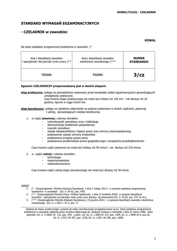 KOWAL722101 - CZELADNIK STANDARD WYMAGAŃ EGZAMINACYJNYCH - CZELADNIK w zawodzie: KOWAL Na bazie podstawy programowej kształcenia w zawodzie (* Kod z klasyfikacji zawodów i specjalności dla potrzeb rynku pracy (** Kod z klasyfikacji zawodów szkolnictwa zawodowego (*** NUMER STANDARDU 722101 722101 3/cz Egzamin CZELADNICZY przeprowadzany jest w dwóch etapach: etap praktyczny: polega na samodzielnym wykonaniu przez kandydata zadań egzaminacyjnych sprawdzających umiejętności praktyczne. Czas trwania etapu praktycznego nie może być krótszy niż 120 min i nie dłuższy niż 24 godziny, łącznie w ciągu trzech dni. etap teoretyczny: polega na udzieleniu odpowiedzi na pytania zestawione w dwóch częściach; pisemnej i ustnej, sprawdzających wiedzę teoretyczną: 1. w części pisemnej z zakresu tematów: rachunkowość zawodowa wraz z kalkulacją dokumentacja działalności gospodarczej rysunek zawodowy zasady bezpieczeństwa i higieny pracy oraz ochrony przeciwpożarowej, podstawowe zasady ochrony środowiska podstawowe przepisy prawa pracy podstawowa problematyka prawa gospodarczego i zarządzania przedsiębiorstwem Czas trwania części pisemnej nie może być krótszy niż 45 minut i nie dłuższy niż 210 minut. 2. w części ustnej z zakresu tematów: technologia maszynoznawstwo materiałoznawstwo Czas trwania części ustnej etapu teoretycznego nie może być dłuższy niż 30 minut. UWAGI 1. 2. 3. (* - Rozporządzenie Ministra Edukacji Narodowej z dnia 7 lutego 2012 r. w sprawie podstawy programowej kształcenia w zawodach (Dz. U. Nr 62, poz. 439) (** - Rozporządzenie Ministra Pracy i Polityki Społecznej z dnia 27 kwietnia 2010r. w sprawie klasyfikacji zawodów i specjalności na potrzeby rynku pracy oraz zakresu jej stosowania (Dz. U. Nr 82, poz. 537 ze zm.) (***- Rozporządzenie Ministra Edukacji Narodowej z 23 grudnia 2011 r. w sprawie klasyfikacji zawodów szkolnictwa zawodowego (Dz. U. z 2012 r. Nr 2, poz. 7) _________________________________________________________________________________________ Zadania do etapu praktycznego i pytania do etapu teoretycznego przygotowywane są na bazie podstawy programowej kształcenia w zawodzie ustalonej przez ministra właściwego ds. edukacji (Ustawa o rzemiośle z dnia 22 marca 1989, tekst jednolity: Dz. U. Z 2002r Nr 112, poz. 979, z późn. zm. Dz. U. z 2003 Nr 137, poz. 1304, Dz. U. z 2009 Nr 6, poz.33, Dz. U. z 2011 Nr 207, poz. 1230, Dz. U. z 2011 Nr 205, poz. 1206) 1 KOWAL722101 - CZELADNIK W efekcie pozytywnie zdanego egzaminu CZELADNICZEGO izba rzemieślnicza wystawia Świadectwoczeladnicze, które jest formalnym potwierdzeniem kwalifikacji zawodowych, uzyskanych w różnych ścieżkach edukacji oraz w procesie pracy. 1. PROFIL UMIEJĘTNOŚCI CZELADNIKA ZWIĄZANY Z ZAWODEM Czeladnik (posiadacz świadectwa czeladniczego) w zawodzie kowalpotrafi: posługiwać się dokumentacją techniczną oraz Dokumentacją Techniczno-Ruchową w zakresie wykonywanych zadań zawodowych, wykonywać szkice wyrobów kowalskich, dobierać materiały konstrukcyjne i eksploatacyjne zgodnie z dokumentacją, użytkować przyrządy pomiarowe, przyrządy specjalne, narzędzia oraz maszyny i urządzenia wykorzystywane w procesach technologicznych, wykonywać pomiary warsztatowe, wykonywać podstawowe prace ślusarskie, użytkować kowalskie urządzenia grzewcze, przygotowywać materiały wsadowe do kucia swobodnego ręcznego i mechanicznego, wykonywać kucie swobodne ręczne oraz kucie swobodne na prasach i młotach, wykonywać obróbkę cieplną, dokonywać konserwacji oraz naprawy narzędzi i urządzeń wykorzystywanych w procesach technologicznych, oceniać jakość wykonywanych prac, przestrzegać przepisów bezpieczeństwa i higieny pracy, ochrony przeciwpożarowej oraz ochrony środowiska podczas wykonywania zadań zawodowych, organizować i kontrolować roboty kowalskie, udzielać pierwszej pomocy poszkodowanym w wypadkach przy pracy. Czeladnik w zawodzie kowal jest przygotowany do wykonywania następujących zadań zawodowych: 1. wykonywanie i naprawa wyrobów kowalskich metodą kucia ręcznego, 2. Wykonywanie wyrobów kowalskich metodą kucia maszynowego. 2.WIEDZA I UMIEJĘTNOŚCI ZWIĄZANE Z WYKONYWANIEM WYŻEJ WYMIENIONYCH ZADAŃ ZAWODOWYCH Z ZAKRESU: 2.1. Bezpieczeństwo i higiena pracy Czeladnik: 1) rozróżnia pojęcia związane z bezpieczeństwem i higieną pracy, ochroną przeciwpożarową, ochroną środowiska i ergonomią; 2) rozróżnia zadania i uprawnienia instytucji oraz służb działających w zakresie ochrony pracy i ochrony środowiska w Polsce; 3) określa prawa i obowiązki pracownika oraz pracodawcy w zakresie bezpieczeństwa i higieny pracy; 4) przewiduje zagrożenia dla zdrowia i życia człowieka oraz mienia i środowiska związane z wykonywaniem zadań zawodowych; 5) określa zagrożenia związane z występowaniem szkodliwych czynników w środowisku pracy; 6) określa skutki oddziaływania czynników szkodliwych na organizm człowieka; 7) organizuje stanowisko pracy zgodnie z obowiązującymi wymaganiami ergonomii, przepisami bezpieczeństwa i higieny pracy, ochrony przeciwpożarowej i ochrony środowiska; 8) stosuje środki ochrony indywidualnej i zbiorowej podczas wykonywania zadań zawodowych; 9) przestrzega zasad bezpieczeństwa i higieny pracy oraz stosuje przepisy prawa dotyczące ochrony przeciwpożarowej i ochrony środowiska; 10) udziela pierwszej pomocy poszkodowanym w wypadkach przy pracy oraz w stanach zagrożenia zdrowia i życia. 2.2.Podejmowanie i prowadzenie działalności gospodarczej Czeladnik: 1) stosuje pojęcia z obszaru funkcjonowania gospodarki rynkowej; 2) stosuje przepisy prawa pracy, przepisy prawa dotyczące ochrony danych osobowychoraz przepisy prawa podatkowego i prawa autorskiego; 3) stosuje przepisy prawa dotyczące prowadzenia działalności gospodarczej; 4) rozróżnia przedsiębiorstwa i instytucje występujące w branży i powiązania między nimi; 2 KOWAL722101 - CZELADNIK 5) 6