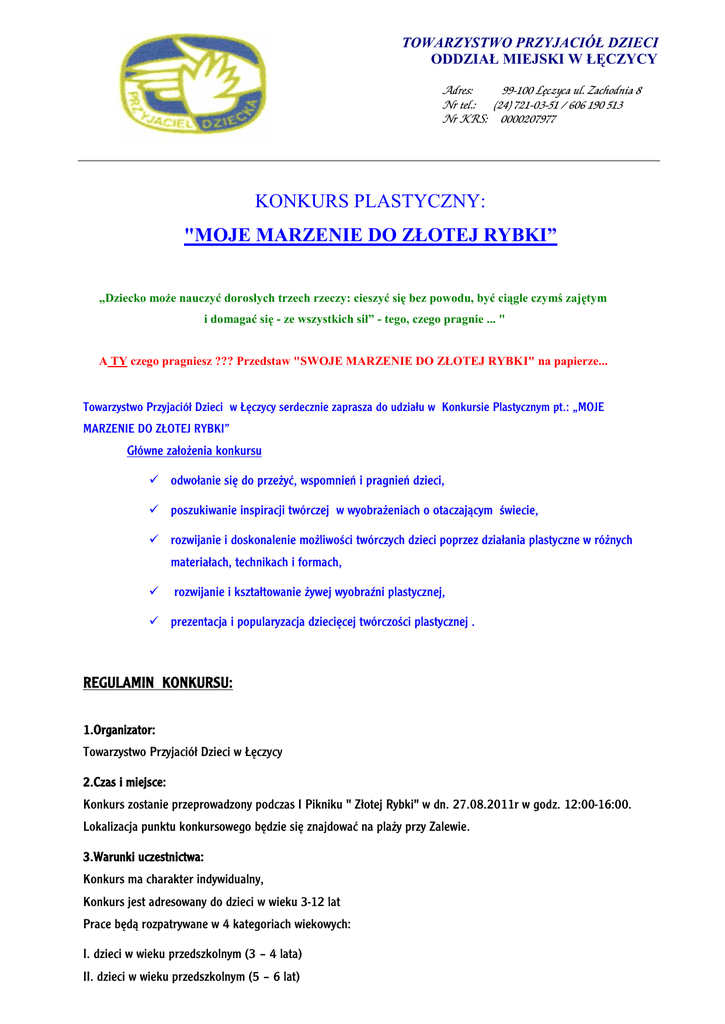 TOWARZYSTWO PRZYJACIÓŁ DZIECI ODDZIAŁ MIEJSKI W ŁĘCZYCY Adres: 99-100 Łęczyca ul. Zachodnia 8 Nr tel.: (24) 721-03-51 / 606 190 513 Nr KRS: 0000207977 KONKURS PLASTYCZNY: "MOJE MARZENIE DO ZŁOTEJ RYBKI” „Dziecko może nauczyć dorosłych trzech rzeczy: cieszyć się bez powodu, być ciągle czymś zajętym i domagać się - ze wszystkich sił” - tego, czego pragnie ... " A TY czego pragniesz ??? Przedstaw "SWOJE MARZENIE DO ZŁOTEJ RYBKI" na papierze... Towarzystwo Przyjaciół Dzieci w Łęczycy serdecznie zaprasza do udziału w Konkursie Plastycznym pt.: „MOJE MARZENIE DO ZŁOTEJ RYBKI” Główne założenia konkursu odwołanie się do przeżyć, wspomnień i pragnień dzieci, poszukiwanie inspiracji twórczej w wyobrażeniach o otaczającym świecie, rozwijanie i doskonalenie możliwości twórczych dzieci poprzez działania plastyczne w różnych materiałach, technikach i formach, rozwijanie i kształtowanie żywej wyobraźni plastycznej, prezentacja i popularyzacja dziecięcej twórczości plastycznej . REGULAMIN KONKURSU: 1.Organizator: Towarzystwo Przyjaciół Dzieci w Łęczycy 2.Czas i miejsce: Konkurs zostanie przeprowadzony podczas I Pikniku " Złotej Rybki" w dn. 27.08.2011r w godz. 12:00-16:00. Lokalizacja punktu konkursowego będzie się znajdować na plaży przy Zalewie. 3.Warunki uczestnictwa: Konkurs ma charakter indywidualny, Konkurs jest adresowany do dzieci w wieku 3-12 lat Prace będą rozpatrywane w 4 kategoriach wiekowych: I. dzieci w wieku przedszkolnym (3 – 4 lata) II. dzieci w wieku przedszkolnym (5 – 6 lat) III. uczniowie z klas I – III (7 – 9 lat) IV. uczniowie z klas IV – VI (10 – 12 lat) Każdy z uczestników składa do konkursu maksymalnie 1 pracę wykonaną samodzielnie w punkcie konkursowym w godz. 11:00-16:00. Technika plastyczna i format dowolny. Każda praca powinna być opisana w następujący sposób: imię, nazwisko i wiek autora. 4.Oceny i nagrody: -oceny prac dokona specjalnie do tego celu powołana komisja, -ocenie podlegać będą pomysłowość, wartości artystyczne i estetyczne prac, -przyznana zostanie Nagroda Główna oraz I, II i III miejsce w każdej kategorii wiekowej. Nagrodzone prace zostaną oficjalnie zaprezentowane w dniu 27.08.2011 r. podczas I Pikniku " Złotej Rybki" -zgłoszone do konkursu prace przechodzą na własność TPD w Łęczycy Dodatkowe informacje o konkursie można uzyskać w godz. 8:00 – 16:00 pod nr tel. (24) 721-03-51.