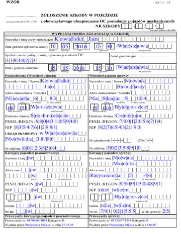 WZÓR KZ 1.1 1/5 .................................. ZGŁOSZENIE SZKODY W POJEŹDZIE pieczęć jednostki TUW „TUW” z obowiązkowego ubezpieczenia OC posiadaczy pojazdów mechanicznych NR SZKODY / / / *niepotrzebne skreślić WYPEŁNIA OSOBA ZGŁASZAJĄCA SZKODĘ |K|o|w|a|l|s|k|i|_|J|a|n|_|_|_|_|_|_|_|_|_|_|_|_|_|_|_|_|_| 16 05 2010 15 : 30 |W|a|r|s|z|a|w|a|_|_|_|_|_|_| Nazwisko i imię osoby zgłaszającej Data godzina zgłoszenia szkody Dzień, miesiąc, rok godzina Symbol i numer polisy, z której zgłaszana jest szkoda OC miejscowość Suma gwarancyjna .................................... |3|3|9|3|8|2|7|3| |_| Data i godzina zdarzenia 15 - Dzień, 05 - miesiąc, 2010 rok Poszkodowany (Właściciel pojazdu) : |W|a|r|s|z|a|w|a|_|_|_|_|_|_|_| 30 godzina miejscowość 15 Właściciel pojazdu sprawcy |K|o|w|a|l|s|k|i|_|_|_|_| Nazwisko i imię / Nazwa |N|o|w|a|k|_|_|_|_|_|_|_| |_|_|_|_|_|_|_|_|_|_|J|a|n|_|_|_|_|_|_|_|_| |_|_|_|_|_|_|_|B|o|n|i|f|a|c|y|_|_|_|_|_|_| Adres zamieszkania / Siedziba |_|_|_|_|_|_|_|_|_|_| Adres zamieszkania / Siedziba |_|_|_|_|_|_|_|_|_|_| |N|i|e|c|a|ł|a|_|6|_|_|_|8|3|_|_|_|_|_|_|_| |N|a|_|S|k|a|j|u|_|5|_|_|1|0|4|_|_|_|_|_|_| Nazwisko i imię / Nazwa ulica, nr domu, nr mieszkania ulica, nr domu, nr mieszkania |W|a|r|s|z|a|w|a|_|_|_|_|_|_|_ 15 - 010 |B|y|d|g|o|s|z|c|z|_|_|_|_|_|_| 00 155 Kod pocztowy miejscowość Kod pocztowy miejscowość Dzielnica /Gmina |Ś|r|ó|d|m|i|e|ś|c|i|e|_|_|_| Dzielnica /Gmina |C|e|n|t|r|u|m|_|_|_|_|_|_|_|_| PESEL/REGON |6|8|0|4|3|1|0|5|9|4|8| PESEL/REGON |7|0|0|1|2|0|5|6|7|1|4| NIP |8|3|5|4|7|6|1|2|9|8|1| NIP |8|2|7|6|5|4|3|2|1|9|0| URZĄD SKARBOWY |w|W|a|r|s|z|a|w|i|e|_|_| |N|o|r|w|i|d|a|_|3|8|/|8|6|_|_|_|_|_|_|_|_| Nr członkowski |-|-|-|-|_|_| ZWC |-|-| |6|0|1|2|3|8|5|6|4|_|_| Nr telefonu Kierujący pojazdem poszkodowanego |5|0|2|3|5|8|9|1|0|_|_| Nr telefonu Kierujący pojazdem sprawcy |N|o|w|a|k|_|_|_|_|_|_|_|_|_|_| |_|_|_|_|_|_|M|o|n|i|k|a|_|_|_|_|_|_|_|_|_| Adres zam. |_|_|j|w|_|_|_|_|_|_|_|_|_|_|_|_|_| Adres zam. |_|_|_|_|_|_|_|_|_|_|_|_|_|_|_|_|_| |_|_|_|_|_|_|j|w|_|_|_|_|_|_|_|_|_|_|_|_|_| |R|e|y|m|o|n|t|a|_|_|5|_|_|_|4|6|_|_|_|_|_| |j|w|_|_|_|_|_|_|_|_|_|_|_|_|_| |_|_|_|_|_|_|_|_|_|_|_|_|_|_|_|_|_|_|_|_|_| Nazwisko i imię ulica, nr domu, nr mieszkania PESEL/REGON |j|w|_|_|_|_|_|_|_|_|_| NIP |_|_|_|_|j|w|_|_|_|_|_| |_|j|w|_|_|_|_|_|_|_|_|_|_|_| Kod pocztowy Gmina Nazwisko i imię miejscowość |_|_|_|j|w|_|_|_|_|_|_|_|_|_|_|_|_| |_|_|j|w|_|_|_|_|_|_| Nr tel. Prawo jazdy kierującego pojazdem poszkodowanego Prawo jazdy nr 01708/04/1014 Kategoria B Wydane przez Prezydenta Miasta w dniu 27.07.05 ulica, nr domu, nr mieszkania PESEL/REGON |8|5|0|9|1|5|0|4|8|9|1| NIP |n|i|e|_|w|i|e|m|_|_|_| |B|y|d|g|o|s|z|c|z|_|_|_|_|_|_| Kod pocztowy Gmina miejscowość |n|i|e|_|w|i|e|m|_|_|_|_|_|_|_|_|_|_| |7|9|1| 0|2|1|5|5|5|_| Wiek sprawcy |2|5| Nr tel. Prawo jazdy sprawcy Prawo jazdy nr 03250/07/1354 Kategoria B Wydane przez Prezydenta Miasta w dniu 15.04.07 KZ 1.1 2/5 Pojazd poszkodowanego Pojazd sprawcy Numer rejestracyjny WU 92527 Pojemność silnika 1498 Numer rejestracyjny CB53527 Marka, typ, model Seat Toledo Numer nadwozia VSSZZZ1MZ4R072053 Marka, typ, model Audi A3 Kolor nadwozia Biały Przebieg w km 112.000 Rok produkcji 2004 Czy sprawca w chwili zdarzenia był w stanie po uŜyciu alkoholu, środków odurzających TAK / NIE /NIE WIEM* Data waŜności badania technicznego 19.12.2010r. Przeznaczenie uŜytek własny/słuŜbowy Polisa OC poszkodowanego Symbol i numer polisy .2500012055525................ Nazwa zakładu ubezpieczeń STU Ergo Hestia SA Okres ubezpieczenia od 01-01-2010 do 31-12.2010 Polisa AC poszkodowanego Symbol i numer polisy 2500012055525 Nazwa zakładu ubezpieczeń STU Ergo Hestia SA Okres ubezpieczenia 01-01-2010 do 31-12-2010 Suma ubezpieczenia 30.000,00 zł Świadkowie zdarzenia 1. Nazwisko i imię ........brak / nie było 2. Nazwisko i imię .................................................................... Adres zamieszkania ..........................-......................................... Adres zamieszkania ................................................................... ulica, nr domu, ulica, nr mieszkania nr domu, nr mieszkania Miejscowość ............................................................................. Miejscowość ............................................................................. tel. ............................................................... tel................................................................ Powiadomienie Policji Czy na miejscu interweniowała Policja ? TAK / NIE * Kto powiadomił Policję ? poszkodowany Data powiadomienia 15.05.2010r. godz. 15.30 Nazwa i adres jednostki policji: WRD ul. Waliców 15 Warszawa.................................................................. W jaki sposób ukarano kierowcę ? mandatem karnym w wysokości 250 zł ...................................................................... Zaistniałe zdarzenie zgłoszono następującym organom 1. Nazwa Wydział Ruchu Drogowego 2. Nazwa .................................................................................... Adres / Siedziba ul. Waliców 15 Adres / Siedziba ........................................................................ Miejscowość Warszawa Pozostali uczestnicy zdarzenia 1. Nazwisko i imię nie było Miejscowość ............................................................................. 1. Nazwisko i imię .................................................................... Adres zamieszkania ................................................................ ulica, nr domu, Adres zamieszkania ................................................................... nr mieszkania ulica, Miejscowość ........................................................................... Przyczyna powstania szkody nr domu, nr mieszkania Miejscowość ............................................................................. Przyczyna powstania szkody ................
