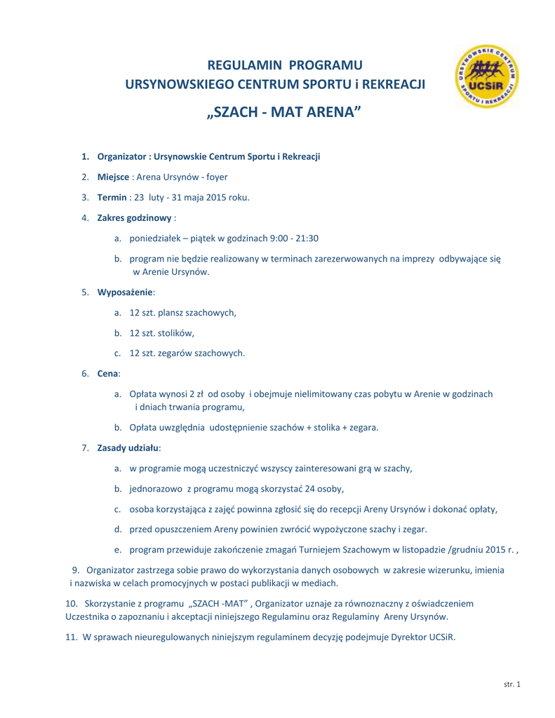 REGULAMIN PROGRAMU URSYNOWSKIEGO CENTRUM SPORTU i REKREACJI „SZACH - MAT ARENA” 1. Organizator : Ursynowskie Centrum Sportu i Rekreacji 2. Miejsce : Arena Ursynów - foyer 3. Termin : 23 luty - 31 maja 2015 roku. 4. Zakres godzinowy : a. poniedziałek – piątek w godzinach 9:00 - 21:30 b. program nie będzie realizowany w terminach zarezerwowanych na imprezy odbywające się w Arenie Ursynów. 5. Wyposażenie: a. 12 szt. plansz szachowych, b. 12 szt. stolików, c. 12 szt. zegarów szachowych. 6. Cena: a. Opłata wynosi 2 zł od osoby i obejmuje nielimitowany czas pobytu w Arenie w godzinach i dniach trwania programu, b. Opłata uwzględnia udostępnienie szachów + stolika + zegara. 7. Zasady udziału: a. w programie mogą uczestniczyć wszyscy zainteresowani grą w szachy, b. jednorazowo z programu mogą skorzystać 24 osoby, c. osoba korzystająca z zajęć powinna zgłosić się do recepcji Areny Ursynów i dokonać opłaty, d. przed opuszczeniem Areny powinien zwrócić wypożyczone szachy i zegar. e. program przewiduje zakończenie zmagań Turniejem Szachowym w listopadzie /grudniu 2015 r. , 9. Organizator zastrzega sobie prawo do wykorzystania danych osobowych w zakresie wizerunku, imienia i nazwiska w celach promocyjnych w postaci publikacji w mediach. 10. Skorzystanie z programu „SZACH -MAT” , Organizator uznaje za równoznaczny z oświadczeniem Uczestnika o zapoznaniu i akceptacji niniejszego Regulaminu oraz Regulaminy Areny Ursynów. 11. W sprawach nieuregulowanych niniejszym regulaminem decyzję podejmuje Dyrektor UCSiR. str. 1
