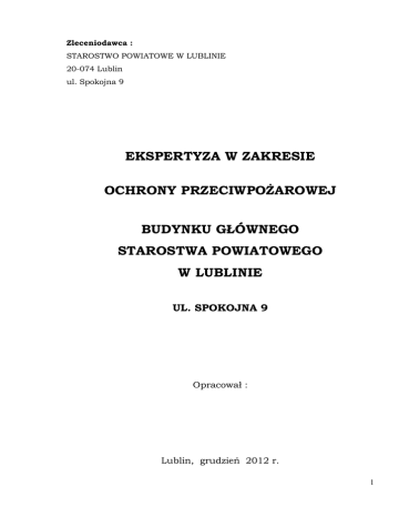 Zleceniodawca : STAROSTWO POWIATOWE W LUBLINIE 20-074 Lublin ul. Spokojna 9 EKSPERTYZA W ZAKRESIE OCHRONY PRZECIWPOŻAROWEJ BUDYNKU GŁÓWNEGO STAROSTWA POWIATOWEGO W LUBLINIE UL. SPOKOJNA 9 Opracował : Lublin, grudzień 2012 r. 1 1. PODSTAWA PRAWNA OPRACOWANIA. [ 1 ] - ustawa z dnia 24 sierpnia 1991 r. o ochronie przeciwpożarowej (jednolity tekst Dz.U. z 2009 r. nr 178, poz. 1380 ze zmianami). [ 2 ] - rozporządzenie Ministra Spraw Wewnętrznych i Administracji z dnia 7 czerwca 2010 r. w sprawie ochrony przeciwpożarowej budynków, innych obiektów budowlanych i terenów (Dz.U. z 2010 r. Nr 109, poz.719). [ 3 ] - rozporządzenie Ministra Infrastruktury z dnia 12 kwietnia 2002 r w sprawie warunków technicznych jakim powinny odpowiadać budynki i ich usytuowanie (Dz.U. z 2002 r. Nr 75, poz. 690 ze zmianami) [ 4 ] - rozporządzenie Ministra Spraw Wewnętrznych i Administracji z dnia 24 lipca 2009 r. w sprawie przeciwpożarowego zaopatrzenia w wodę oraz dróg pożarowych (Dz.U. z 2009 r. Nr 124, poz. 1030.). [ 5 ] - rozporządzenie Ministra Spraw Wewnętrznych i Administracji z dnia 16 czerwca 2003 r. w sprawie uzgadniania projektu budowlanego pod względem ochrony przeciwpożarowej (Dz.U. z 2003 r. Nr 121, poz.1137 ze zmianami). [ 6 ] - PN-BN 671-1. Stałe urządzenia gaśnicze. Hydranty wewnętrzne. Hydranty wewnętrzne z wężem półsztywnym. [ 7 ] - PN-B-02877-4:2001/Az1; 2006 Ochrona przeciwpożarowa budynków. Instalacje grawitacyjne do odprowadzania dymu i ciepła. Zasady projektowania. [ 8 ] - PN-EN 1838:2005. Oświetlenie awaryjne. [ 9 ] - Wytyczne VDS 2221:2001. Urządzenia do oddymiania klatek schodowych. Projektowanie i instalowanie. [10] - PN-92/N-1256/01 i PN-92/N-01256/02 — dotyczące znaków bezpieczeństwa [8], [11] -PN-86/E-05003/01, PN-IEC 61024-1, PN-IEC 62305-2 — dotyczące ochrony odgromowej. [12] – Inwentaryzacja architektoniczno- budowlana budynku Starostwa Powiatowego w Lublinie przy ul. Spokojnej 9 sporządzona przez Biuro Usług Projektowych „ Budoprojekt” inż. Janusz Fronczyk . 2 2. PRZEDMIOT I CEL OPRACOWANIA. Przedmiotem opracowania jest analiza i ocena warunków ochrony przeciwpożarowej budynku głównego Starostwa Powiatowego w Lublinie przy ul. Spokojnej 9. W związku z istniejącymi nieprawidłowościami w zabezpieczeniu przeciwpożarowym budynku, stwierdzonymi podczas czynności kontrolno-rozpoznawczych w zakresie ochrony przeciwpożarowej oraz wydaną decyzją przez Komendanta Miejskiego Państwowej Straży Pożarnej w Lublinie, nakazującą wykonanie zaleceń wynikających z przepisów prawa, obiekt wymaga gruntownej modernizacji i dostosowania do obowiązujących przepisów przeciwpożarowych. warunków Opracowanie ma na celu poprawę bezpieczeństwa pożarowego obiektu w zakresie istniejących warunków technicznych ewakuacji ludzi i zapewnienia możliwości wyjścia w bezpieczne miejsce na zewnątrz budynku lub do sąsiedniej strefy pożarowej osób znajdujących się w budynku. Istniejący układ komunikacyjny w budynku (długość korytarzy oraz obecność jednej nieobudowanej klatki schodowej nieposiadającej zamknięć drzwiowych i urządzeń zapobiegających zadymieniu lub służących do usuwania dymu z klatki powodują przekroczenie dopuszczalnej długości dojścia ewakuacyjnego (mierzonego przy jednym dojściu – 30 m, w tym 20 m na poziomej drodze ewakuacyjnej) dla pomieszczeń usytuowanych na kondygnacjach nadziemnych I i II piętra budynku oraz dla wyjścia z klatki schodowej przez hol główny na zewnątrz budynku i nie spełniają wymagań § 245 pkt 3 i § 256 ust. 3. rozporządzenia [3]. Zgodnie z § 16 ust. 1 i 2 rozporządzenia [2] występowanie w budynku w/w warunków technicznych nie zapewnia możliwości bezpiecznej ewakuacji i stanowi podstawę do uznania go za zagrażający życiu ludzi. Przeprowadzona inwentaryzacja budowlana wykazuje ponadto, że schody w jedynej istniejącej klatce schodowej łączącej parter z I i II piętrem budynku nie posiadają wymaganej szerokości spoczników międzykondygnacyjnych 3 1,5m. Aktualna szerokość spocznika pomiędzy parterem a I piętrem wynosi od 0,92 m do 1,06 m i jest dodatkowo zawężona w narożnikach spocznika poprzez skośne ściany wewnętrzne do min. szerokości 0,39 m w jednym narożniku i 0,47 m w drugim narożniku. Szerokość spocznika pomiędzy I piętrem a II piętrem wynosi 1,32 do 1.41 m, a dodatkowo szerokość spocznika zmniejszają do minimalnego wymiaru 1,22 m poręcze konstrukcyjne balustrady klatki schodowej. Szerokość biegu schodów jest także zmniejszona poprzez balustrady do 1,12 m wobec wymaganej 1,20 m w świetle. Ze względu na istniejący układ konstrukcyjny budynku poszerzenie spoczników do pełnych wymaganych wymiarów (1,5 m) jest niemożliwe, ponieważ zagrażałoby to bezpieczeństwu głównej konstrukcji nośnej obiektu. Ponadto istniejące stropy międzykondygnacyjne wydzielające parter od I pietra oraz na II piętrze budynku a także stropodach nie spełniają wymagań w zakresie wymaganej klasy odporności ogniowej odpowiednio REI 60 dla stropów i R 30 dla konstrukcji dachu i RE 30 dla przekrycia dachu, ponieważ zostały wykonane w konstrukcji drewnianej belkowej. W sali konferencyjnej na parterze – strop oddzielający parter od I piętra budynku jest wykonany w konstrukcji belkowej drewnianej i nie posiada wymaganej klasy odporności ogniowej REI 60. Docelowo zakłada się dostosowanie stropu w Sali konferencyjnej do wymagań rozporządzenia [3]. Dodatkowo szerokość drzwi stanowiących wyjście ewakuacyjne z pomieszczeń na parterze, I i II piętrze budynku jest mniejsza od wymaganej szerokości 0,90 m dla więcej niż 3 osób w pomieszczeniu. Drzwi stanowiące wyjście ewakuacyjne z Sali konferencyjnej na parterze i drzwi ewakuacyjne stanowiące wyjście z budynku na parterze i w piwnicy posiadają szerokość pojedynczego skrzydła otwieralnego mniejszą niż 0,9 m. Szerokość lokalnych zwężeń na korytarzu lewego