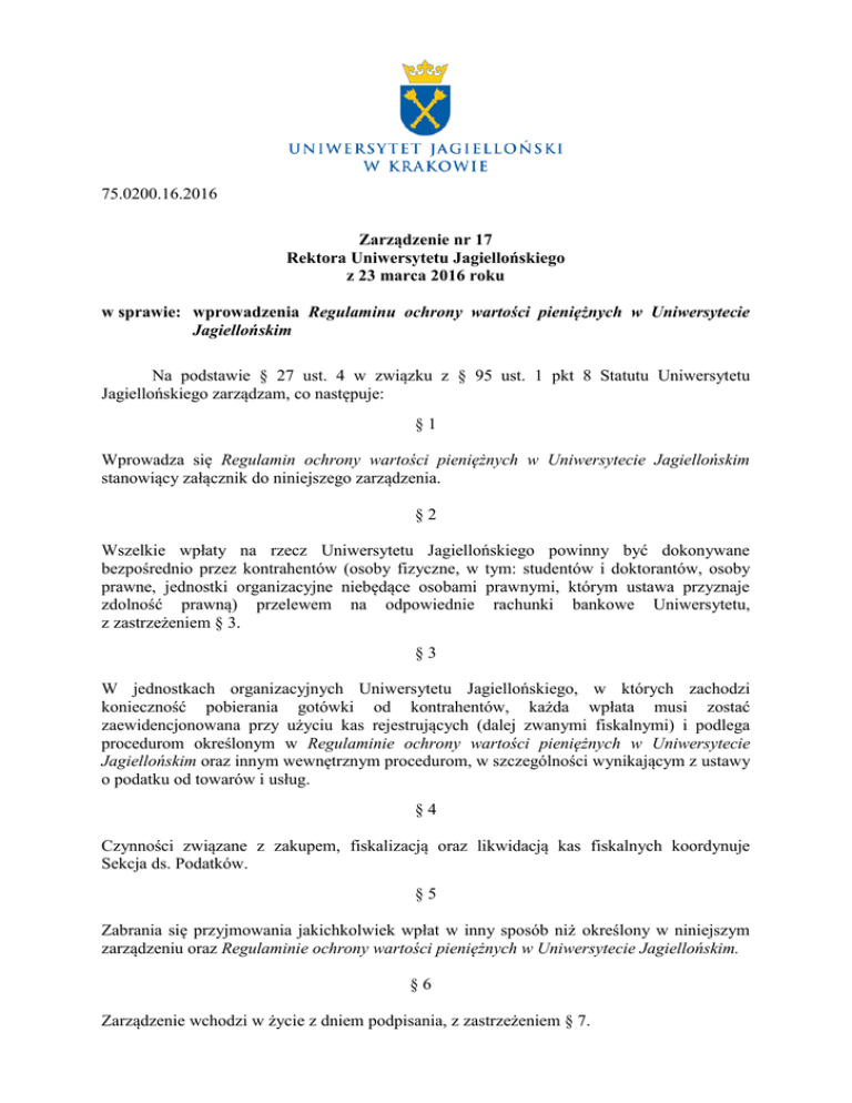 75.0200.16.2016 Zarządzenie nr 17 Rektora Uniwersytetu Jagiellońskiego z 23 marca 2016 roku w sprawie: wprowadzenia Regulaminu ochrony wartości pieniężnych w Uniwersytecie Jagiellońskim Na podstawie § 27 ust. 4 w związku z § 95 ust. 1 pkt 8 Statutu Uniwersytetu Jagiellońskiego zarządzam, co następuje: §1 Wprowadza się Regulamin ochrony wartości pieniężnych w Uniwersytecie Jagiellońskim stanowiący załącznik do niniejszego zarządzenia. §2 Wszelkie wpłaty na rzecz Uniwersytetu Jagiellońskiego powinny być dokonywane bezpośrednio przez kontrahentów (osoby fizyczne, w tym: studentów i doktorantów, osoby prawne, jednostki organizacyjne niebędące osobami prawnymi, którym ustawa przyznaje zdolność prawną) przelewem na odpowiednie rachunki bankowe Uniwersytetu, z zastrzeżeniem § 3. §3 W jednostkach organizacyjnych Uniwersytetu Jagiellońskiego, w których zachodzi konieczność pobierania gotówki od kontrahentów, każda wpłata musi zostać zaewidencjonowana przy użyciu kas rejestrujących (dalej zwanymi fiskalnymi) i podlega procedurom określonym w Regulaminie ochrony wartości pieniężnych w Uniwersytecie Jagiellońskim oraz innym wewnętrznym procedurom, w szczególności wynikającym z ustawy o podatku od towarów i usług. §4 Czynności związane z zakupem, fiskalizacją oraz likwidacją kas fiskalnych koordynuje Sekcja ds. Podatków. §5 Zabrania się przyjmowania jakichkolwiek wpłat w inny sposób niż określony w niniejszym zarządzeniu oraz Regulaminie ochrony wartości pieniężnych w Uniwersytecie Jagiellońskim. §6 Zarządzenie wchodzi w życie z dniem podpisania, z zastrzeżeniem § 7. §7 Jednostki organizacyjne Uniwersytetu Jagiellońskiego, które na dzień wejścia w życie zarządzenia nie posiadają kas fiskalnych, zobowiązane są dostosować zasady swojego działania do procedur określonych w niniejszym zarządzeniu w terminie do 30 czerwca 2016 roku. Rektor Prof. dr hab. med. Wojciech Nowak Załącznik do zarządzenia nr 17 Rektora UJ z 23 marca 2016 r. Regulamin ochrony wartości pieniężnych w Uniwersytecie Jagiellońskim §1 Postanowienia ogólne 1. Za ochronę wartości pieniężnych odpowiada kierownik jednostki organizacyjnej Uniwersytetu Jagiellońskiego, zwanej dalej jednostką organizacyjną UJ, w której użytkowane są kasy (drukarki) fiskalne, zwane dalej kasami fiskalnymi. 2. Kierownik jednostki organizacyjnej UJ, w której użytkowane są kasy fiskalne lub osoby przez niego upoważnione są odpowiedzialni za: a) rejestrowanie każdej wpłaty oraz wydruk paragonu fiskalnego i wydanie go kontrahentowi, b) sporządzanie dobowego i miesięcznego raportu fiskalnego, przy czym: dobowy raport fiskalny powinien być sporządzony po zakończeniu rejestracji wpłat w danym dniu, jednak nie później niż przed rozpoczęciem rejestracji w dniu następnym, miesięczny raport fiskalny powinien być sporządzony pierwszego dnia następnego miesiąca za miesiąc poprzedni, c) weryfikowanie poprawności pracy kasy fiskalnej ze szczególnym uwzględnieniem prawidłowego zaprogramowania danych oraz niezwłoczne zgłaszanie do firmy serwisującej każdej nieprawidłowości pracy kasy fiskalnej, d) udostępnianie kasy fiskalnej do kontroli stanu nienaruszalności i prawidłowości jej pracy na każde żądanie właściwych organów, e) prowadzenie książki rejestrującej i dokonywanie obowiązujących wpisów, f) eksploatację kasy fiskalnej zgodnie z obowiązującymi przepisami. 3. Do pracowników pobierających wpłaty, którzy przekazują je następnie pracownikom obsługującym kasy fiskalne postanowienia niniejszego Regulaminu stosuje się odpowiednio. §2 Ochrona wartości pieniężnych 1. Wartości pieniężne winny być przechowywane w warunkach zapewniających należytą ochronę przed zniszczeniem, utratą, w tym w szczególności przed kradzieżą. 2. Pomieszczenie, w którym przechowywane są wartości pieniężne powinno być właściwie zabezpieczone w sposób uniemożliwiający dostanie się do niego osób nieuprawnionych. 3. Wartości pieniężne gromadzone w jednostce organizacyjnej UJ powinny być przechowywane w specjalnych kasetkach przeznaczonych do przechowywania wartości pieniężnych. §3 Zabezpieczenie wartości pieniężnych w transporcie Przy transporcie wartości pieniężnych gromadzonych w jednostce organizacyjnej UJ należy stosować się do wymogów rozporządzenia Ministra Spraw Wewnętrznych i Administracji z dnia 7 września 2010 roku w sprawie wymagań, jakim powinna odpowiadać ochrona wartości pieniężnych przechowywanych i transportowanych przez przedsiębiorców i inne jednostki organizacyjne (Dz.U. Nr 166, poz. 1128, z późn.zm.). §4 Odpowiedzialność pracownika obsługującego kasę fiskalną 1. Osobą odpowiedzialną za stan gotówki oraz za prawidłowość operacji jest pracownik obsługujący kasę fiskalną. 2. Pracownikiem obsługującym kasę fiskalną może być wyłącznie osoba, która oprócz wymogów określonych przez przepisy ogólne: a) posiada nienaganną opinię, b) nie była karana za przestępstwa gospodarcze ani przestępstwa przeciwko mieniu, c) posiada pełną zdolność do czynności prawnych, d) jest zatrudniona w Uniwersytecie Jagiellońskim na podstawie umowy o pracę, e) złożyła pisemne oświadczenie o przyjęciu odpowiedzialności materialnej za powierzone mienie o treści zgodnej ze wzorem, stanowiącym załącznik nr 1 do niniejszego Regulaminu. Oryginał oświadczenia należy przechowywać w aktach osobowych pracownika. 3. Pracownik obsługujący kasę fiskalną ponosi odpowiedzialność w zakresie znajomości i stosowania obowiązujących przepisów dotyczących dokonywania operacji kasowych, zabezpieczenia i przechowywania gotówki oraz jej transportu. 4. Odpowiedzialność materialna pracownika obsługującego kasę fiskalną rozpoczyna się od chwili protokolarnego przekazania – przejęcia kasy, a kończy się z chwilą dokonania inwentaryzacji z