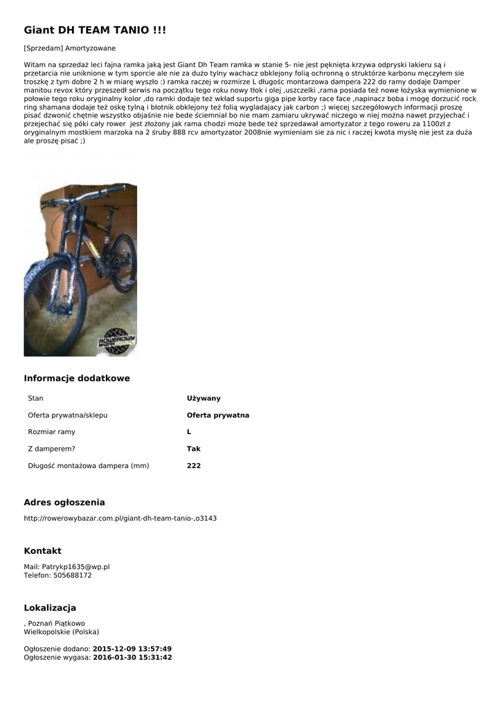 Giant DH TEAM TANIO !!! [Sprzedam] Amortyzowane Witam na sprzedaż leci fajna ramka jaką jest Giant Dh Team ramka w stanie 5- nie jest pęknięta krzywa odpryski lakieru są i przetarcia nie uniknione w tym sporcie ale nie za dużo tylny wachacz obklejony folią ochronną o struktórze karbonu męczyłem sie troszkę z tym dobre 2 h w miarę wyszło :) ramka raczej w rozmirze L długośc montarzowa dampera 222 do ramy dodaje Damper manitou revox który przeszedł serwis na początku tego roku nowy tłok i olej ,uszczelki ,rama posiada też nowe łożyska wymienione w połowie tego roku oryginalny kolor ,do ramki dodaje też wkład suportu giga pipe korby race face ,napinacz boba i mogę dorzucić rock ring shamana dodaje też oskę tylną i błotnik obklejony też folią wygladajacy jak carbon ;) więcej szczegółowych informacji proszę pisać dzwonić chętnie wszystko objaśnie nie bede ściemniał bo nie mam zamiaru ukrywać niczego w niej można nawet przyjechać i przejechać się póki cały rower jest złożony jak rama chodzi może bede też sprzedawał amortyzator z tego roweru za 1100zł z oryginalnym mostkiem marzoka na 2 śruby 888 rcv amortyzator 2008nie wymieniam sie za nic i raczej kwota myslę nie jest za duża ale proszę pisać ;) Informacje dodatkowe Stan Używany Oferta prywatna/sklepu Oferta prywatna Rozmiar ramy L Z damperem? Tak Długość montażowa dampera (mm) 222 Adres ogłoszenia http://rowerowybazar.com.pl/giant-dh-team-tanio-,o3143 Kontakt Mail: [email protected] Telefon: 505688172 Lokalizacja , Poznań Piątkowo Wielkopolskie (Polska) Ogłoszenie dodano: 2015-12-09 13:57:49 Ogłoszenie wygasa: 2016-01-30 15:31:42 Powered by TCPDF (www.tcpdf.org)