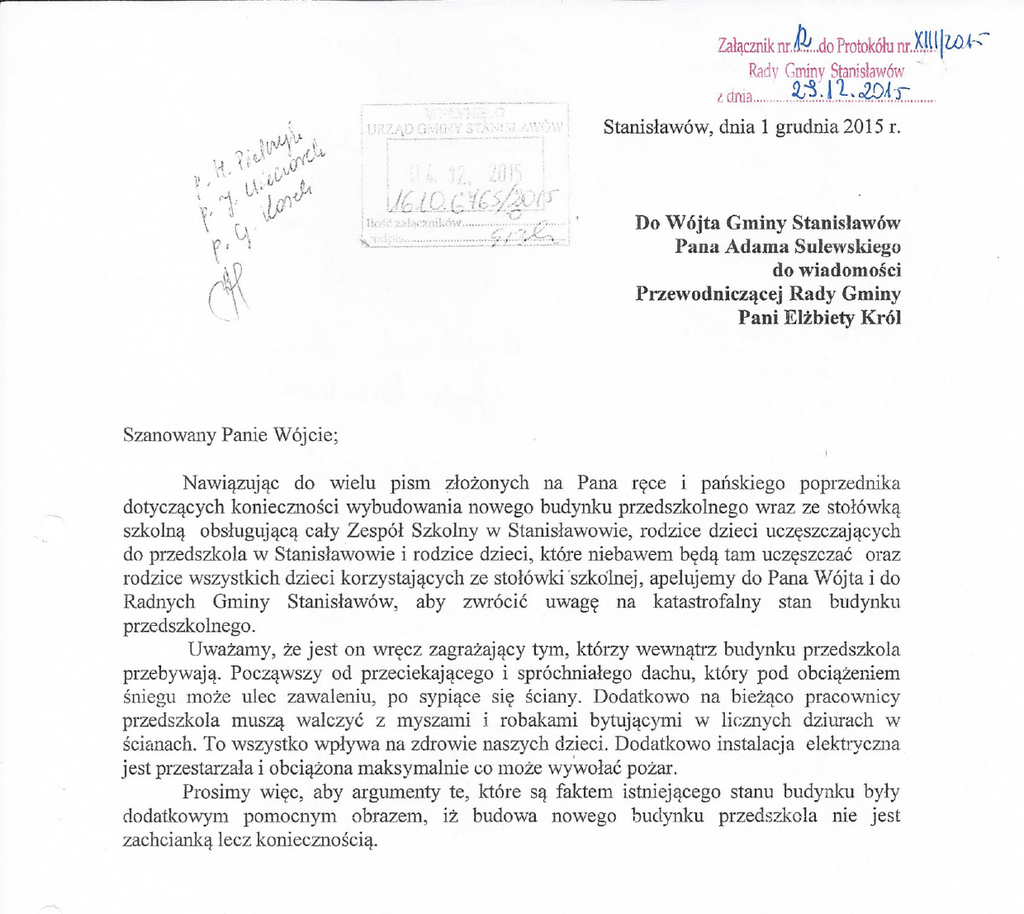 Załącznik m.~ ..do Protokółu m..XI\JłWk':Rady Gminy Stanisławów l dnia ~~ ..·.tl.~ .c:2P.J:f.: . Stanisławów, dnia 1 grudnia 2015 r. Do Wójta Gminy Stanisławów Pana Adama Sulewskiego do wiadomości Przewodniczącej Rady Gminy Pani Elżbiety Król Szanowany Panie Wójcie; Nawiązując do wielu pism złożonych na Pana ręce i pańskiego poprzednika dotyczących konieczności wybudowania nowego budynku przedszkolnego wraz ze stołówką szkolną obsługującą cały Zespół Szkolny w Stanisławowie, rodzice dzieci uczęszczających do przedszkola w Stanisławowie i rodzice dzieci, które niebawem będą tam uczęszczać oraz rodzice wszystkich dzieci korzystających ze stołówki 'szkolnej, apelujemy do Pana Wójta i do Radnych Gminy Stanisławów, aby zwrócić uwagę na katastrofalny stan budynku przedszkolnego. Uważamy, że jest on wręcz zagrażający tym, którzy wewnątrz budynku przedszkola przebywają. Począwszy od przeciekającego i spróchniałego dachu, który pod obciążeniem śniegu może ulec zawaleniu, po sypiące się ściany. Dodatkowo na bieżąco pracownicy przedszkola muszą walczyć z myszami i robakami bytującymi w licznych dziurach w ścianach. To wszystko wpływa na zdrowie naszych dzieci. Dodatkowo instalacja elektryczna jest przestarzała i obciążona maksymalnie (,;0 może wywołać pożar. Prosimy więc, aby argumenty te, które są faktem istniejącego stanu budynku były dodatkowym pomocnym obrazem, iż budowa nowego budynku przedszkola nie jest zachcianką lecz koniecznością. .