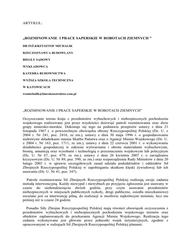 ARTYKUŁ: „ROZMINOWANIE I PRACE SAPERSKIE W ROBOTACH ZIEMNYCH ” DR INŻ.KRZYSZTOF MICHALIK RZECZOZNAWCA BUDOWLANY BIEGŁY SĄDOWY WYKŁADOWCA KATEDRA BUDOWNICTWA WYŻSZA SZKOŁA TECHNICZNA W KATOWICACH [email protected] „ROZMINOWANIE I PRACE SAPERSKIE W ROBOTACH ZIEMNYCH” Oczyszczanie terenu kraju z przedmiotów wybuchowych i niebezpiecznych pochodzenia wojskowego realizowane jest przez trzydzieści dziewięć patroli rozminowania oraz dwie grupy minersko-morskie. Dokonuje się tego na podstawie przepisów ustawy z dnia 21 listopada 1967 r. o powszechnym obowiązku obrony Rzeczypospolitej Polskiej (Dz. U. z 2004 r. Nr 241, poz. 2416, ze zm.), ustawy z dnia 30 maja 1996 r. o gospodarowaniu niektórymi składnikami mienia Skarbu Państwa oraz o Agencji Mienia Wojskowego (Dz. U. z 2004 r. Nr 163, poz. 1711, ze zm.), ustawy z dnia 22 czerwca 2001 r. o wykonywaniu działalności gospodarczej w zakresie wytwarzania i obrotu materiałami wybuchowymi, bronią, amunicją oraz wyrobami i technologią o przeznaczeniu wojskowym lub policyjnym (Dz. U. Nr 67, poz. 679, ze zm.), ustawy z dnia 26 kwietnia 2007 r. o zarządzaniu kryzysowym (Dz. U. Nr 89, poz. 590, ze zm.) oraz rozporządzenia Rady Ministrów z dnia 20 lutego 2003 r. w sprawie szczegółowych zasad udziału pododdziałów i oddziałów Sił Zbrojnych Rzeczypospolitej Polskiej w zapobieganiu skutkom klęski żywiołowej lub ich usuwaniu (Dz. U. Nr 41, poz. 347). Patrole rozminowania Sił Zbrojnych Rzeczypospolitej Polskiej realizują swoje zadania metodą interwencyjną. Każdy niewypał i niewybuch po przyjęciu zgłoszenia jest usuwany w czasie do siedemdziesięciu dwóch godzin, przy czym usuwanie przedmiotów niebezpiecznych w miejscach publicznych (szkoły, drogi publiczne, osiedla mieszkaniowe) uważane jest za interwencję pilną, do realizacji w możliwie najkrótszym terminie, lecz nie później niż w czasie 24 godzin. Ponadto Siły Zbrojne Rzeczypospolitej Polskiej mają również obowiązek oczyszczenia z przedmiotów wybuchowych i niebezpiecznych pochodzenia wojskowego terenów oraz obiektów zaplanowanych do przekazania Agencji Mienia Wojskowego. Realizacja tego zadania wykonywana jest głównie przez jednostki wojsk inżynieryjnych, zgodnie z opracowanymi w rodzajach Sił Zbrojnych Rzeczypospolitej Polskiej planami. Ogółem w 2009 r. na terenie kraju podjęto i zniszczono 346 739 przedmiotów wybuchowych oraz niebezpiecznych, w tym w gminie Gorlice 547 sztuk, co stanowi 0,16% ogólnej liczby zneutralizowanych przedmiotów. W pierwszej połowie br. na ogólną liczbę 116 987 przedmiotów wybuchowych i niebezpiecznych w gminie Gorlice podjęto 7 sztuk, co stanowi marginalną liczbę w zestawieniu z ogólną liczbą znalezisk. W jednostkach Sił Zbrojnych Rzeczypospolitej Polskiej nie są planowane żadne przedsięwzięcia zmierzające do prowadzenia przeszukiwania terenu na terenie gminy Gorlice, gdyż nie wynika to z postanowień aktów prawnych oraz wykracza poza kompetencje Sił Zbrojnych Rzeczypospolitej Polskiej. W dalszym ciągu realizowane będzie natomiast interwencyjne oczyszczanie terenu przez patrol rozminowania nr 30 stacjonujący w 21. Brygadzie Strzelców Podhalańskich w Rzeszowie. W przypadku realizacji inwestycji budowlanych na terenie gminy Gorlice, w rejonach, gdzie występuje podejrzenie występowania przedmiotów wybuchowych i niebezpiecznych, z jednostek wojsk inżynieryjnych można wydzielić specjalistyczny zespół do nadzoru saperskiego. Jednocześnie uprzejmie informuję, że podstawę prawną do realizacji zadań specjalistycznych w ramach nadzoru saperskiego stanowi art. 11 ust. 3 pkt 1 lit. b ustawy z dnia 25 maja 2001 r. o przebudowie i modernizacji technicznej oraz finansowaniu Sił Zbrojnych Rzeczypospolitej Polskiej (Dz. U. z 2009 r. Nr 67, poz. 570, ze zm.), w oparciu o sporządzoną umowę cywilnoprawną między dowódcą jednostki wojskowej i przedstawicielem władzy samorządowej. Polskie prawo nakłada na właścicieli nieruchomości oraz inwestorów i wykonawców prac budowlanych szereg zobowiązań związanych z zapewnieniem bezpieczeństwa osób przebywających lub wykonujących różne prace na terenie nieruchomości, a także obowiązków związanych z rekultywacją gruntu. Stosowne zapisy zawarte są między innymi w: Prawie Budowlanym (Dz. U. nr 89, poz. 414 z 1994r.), Kodeksie Pracy (Dz. U. nr 24, poz. 110 z 1996r.) czy w Prawie Ochrony Środowiska (Dz. U. nr 62, poz. 627 z 2001r.). Polska ziemia zawiera wiele niebezpiecznych pozostałości z czasów wojny. Wcześniejsze wykrycie ich, a następnie usunięcie znakomicie zmniejsza ryzyko związane z prowadzeniem wszelkich prac ziemnych. Ponadto, właściwe saperskie zabezpieczenie inwestycji zapobiega poważnym kosztom związanym z przestojami spowodowanymi występującymi na jej terenie niewypałami lub niewybuchami. Podczas prowadzenia robót ziemnych konieczne jest wykonanie prac związanych z saperskim sprawdzaniem terenu i oczyszczaniem go z niewypałów, niewybuchów oraz innych przedmiotów niebezpiecznych. W uzasadnionych przypadkach konieczny jest również nadzór saperski w trakcie prowadzonych inwestycji, który obejmuje: 1. Sprawdzenie terenu na obecność niewybuchów, niewypałów i innych przedmiotów niebezpiecznych do głębokości określonej w zawartej umowie. 2. Wydobycie z ziemi oraz usunięcie wykrytych przedmiotów z terenu kontrahenta poprzez przekazanie ich wojskowemu patrolowi rozminowania lub grupie niszczenia niewybuchów, niewypałów i innych przedmiotów niebezpiecznych. 3. Nadzór saperski w trakcie prowadzonych inwestycji. 4. Wykonanie stosownej dokumentacji potwierdzającej sprawdzenie i oczyszczenie terenu oraz przekazanie jej kontrahentowi. Przedsiębiorcom i inwestorom oferujemy prowadzenie nadzoru saperskiego. Jest on realizowany w trakcie inwestycji. Nadzór saperski jest realizowany przez stałą obecność saperów na placu budowy, którzy nadzorując prowadzone prace – szczegól
