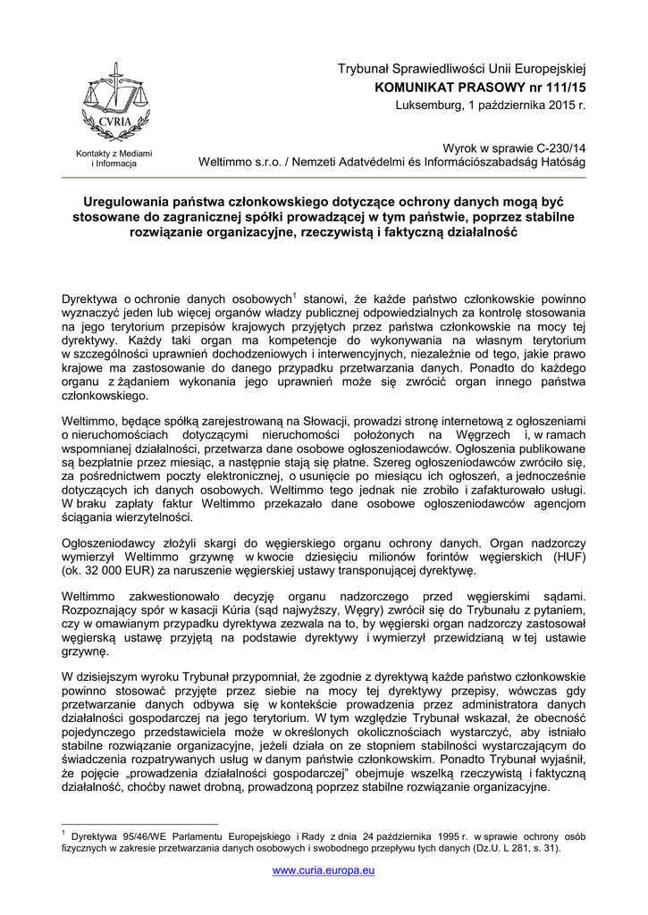 Trybunał Sprawiedliwości Unii Europejskiej KOMUNIKAT PRASOWY nr 111/15 Luksemburg, 1 października 2015 r. Kontakty z Mediami i Informacja Wyrok w sprawie C-230/14 Weltimmo s.r.o. / Nemzeti Adatvédelmi és Információszabadság Hatóság Uregulowania państwa członkowskiego dotyczące ochrony danych mogą być stosowane do zagranicznej spółki prowadzącej w tym państwie, poprzez stabilne rozwiązanie organizacyjne, rzeczywistą i faktyczną działalność Dyrektywa o ochronie danych osobowych1 stanowi, że każde państwo członkowskie powinno wyznaczyć jeden lub więcej organów władzy publicznej odpowiedzialnych za kontrolę stosowania na jego terytorium przepisów krajowych przyjętych przez państwa członkowskie na mocy tej dyrektywy. Każdy taki organ ma kompetencje do wykonywania na własnym terytorium w szczególności uprawnień dochodzeniowych i interwencyjnych, niezależnie od tego, jakie prawo krajowe ma zastosowanie do danego przypadku przetwarzania danych. Ponadto do każdego organu z żądaniem wykonania jego uprawnień może się zwrócić organ innego państwa członkowskiego. Weltimmo, będące spółką zarejestrowaną na Słowacji, prowadzi stronę internetową z ogłoszeniami o nieruchomościach dotyczącymi nieruchomości położonych na Węgrzech i, w ramach wspomnianej działalności, przetwarza dane osobowe ogłoszeniodawców. Ogłoszenia publikowane są bezpłatnie przez miesiąc, a następnie stają się płatne. Szereg ogłoszeniodawców zwróciło się, za pośrednictwem poczty elektronicznej, o usunięcie po miesiącu ich ogłoszeń, a jednocześnie dotyczących ich danych osobowych. Weltimmo tego jednak nie zrobiło i zafakturowało usługi. W braku zapłaty faktur Weltimmo przekazało dane osobowe ogłoszeniodawców agencjom ściągania wierzytelności. Ogłoszeniodawcy złożyli skargi do węgierskiego organu ochrony danych. Organ nadzorczy wymierzył Weltimmo grzywnę w kwocie dziesięciu milionów forintów węgierskich (HUF) (ok. 32 000 EUR) za naruszenie węgierskiej ustawy transponującej dyrektywę. Weltimmo zakwestionowało decyzję organu nadzorczego przed węgierskimi sądami. Rozpoznający spór w kasacji Kúria (sąd najwyższy, Węgry) zwrócił się do Trybunału z pytaniem, czy w omawianym przypadku dyrektywa zezwala na to, by węgierski organ nadzorczy zastosował węgierską ustawę przyjętą na podstawie dyrektywy i wymierzył przewidzianą w tej ustawie grzywnę. W dzisiejszym wyroku Trybunał przypomniał, że zgodnie z dyrektywą każde państwo członkowskie powinno stosować przyjęte przez siebie na mocy tej dyrektywy przepisy, wówczas gdy przetwarzanie danych odbywa się w kontekście prowadzenia przez administratora danych działalności gospodarczej na jego terytorium. W tym względzie Trybunał wskazał, że obecność pojedynczego przedstawiciela może w określonych okolicznościach wystarczyć, aby istniało stabilne rozwiązanie organizacyjne, jeżeli działa on ze stopniem stabilności wystarczającym do świadczenia rozpatrywanych usług w danym państwie członkowskim. Ponadto Trybunał wyjaśnił, że pojęcie „prowadzenia działalności gospodarczej” obejmuje wszelką rzeczywistą i faktyczną działalność, choćby nawet drobną, prowadzoną poprzez stabilne rozwiązanie organizacyjne. 1 Dyrektywa 95/46/WE Parlamentu Europejskiego i Rady z dnia 24 października 1995 r. w sprawie ochrony osób fizycznych w zakresie przetwarzania danych osobowych i swobodnego przepływu tych danych (Dz.U. L 281, s. 31). www.curia.europa.eu W omawianym przypadku Trybunał stwierdził, że Weltimmo bezsprzecznie prowadzi rzeczywistą i faktyczną działalność na Węgrzech. Ponadto z wyjaśnień udzielonych przez węgierski organ nadzorczy wynika, że Weltimmo ma na Węgrzech przedstawiciela, który jest wpisany do słowackiego rejestru spółek pod adresem na Węgrzech i który próbował negocjować z ogłoszeniodawcami kwestię uregulowania niespłaconych należności. Przedstawiciel ten służył jako kontakt Weltimmo ze skarżącymi i reprezentował tę spółkę w postępowaniu administracyjnym i sądowym. Weltimmo otworzyło także rachunek w banku na Węgrzech do celów ściągania swoich należności i korzysta na terytorium tego państwa członkowskiego ze skrzynki pocztowej do prowadzenia bieżących spraw. Informacje te, które powinien zweryfikować sąd krajowy, mogą wykazać fakt „prowadzenia działalności gospodarczej” w rozumieniu dyrektywy na terytorium Węgier. W takim przypadku działalność Weltimmo podlegać będzie węgierskim uregulowaniom dotyczącym ochrony danych. Trybunał podkreślił, że każdy organ nadzorczy powołany przez państwo członkowskie powinien czuwać nad przestrzeganiem na terytorium tego państwa przepisów wydanych przez wszystkie państwa członkowskie w celu wykonania dyrektywy. W związku z tym, do każdego organu nadzorczego może zwrócić się każdy z wnioskiem dotyczącym ochrony swoich praw i wolności w zakresie przetwarzania danych osobowych, nawet jeśli właściwe w sprawie przetwarzania tych danych jest prawo innego państwa członkowskiego. Jednakże w przypadku stosowania prawa innego państwa członkowskiego uprawnienia interwencyjne organu nadzorczego muszą być wykonywane z poszanowaniem w szczególności suwerenności terytorialnej innych państw członkowskich, zatem krajowy organ nie może nałożyć sankcji poza terytorium państwa, któremu podlega. W związku z tym, gdyby sąd odsyłający stwierdził, że Weltimmo nie „prowadzi działalności gospodarczej” w rozumieniu dyrektywy na terytorium Węgier i że do rozpatrywanego przetwarzania danych właściwe jest tym samym prawo innego państwa członkowskiego, węgierski organ nadzorczy nie mógłby wykonywać uprawnień do nakładania sankcji nadanych mu w prawie węgierskim. Na mocy ustanowionego dyrektywą obowiązku współpracy wskazany organ powinien jednak zwrócić się do organu n