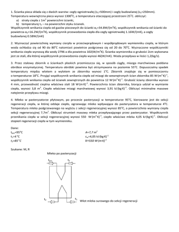 1. Ścianka pieca składa się z dwóch warstw: cegły ogniotrwałej (s1=500mm) i cegły budowlanej (s2=250mm). Temperatura wewnętrzna pieca wynosi 1300oC, a temperatura otaczającej przestrzeni 25oC. obliczyć: a) straty ciepła z 1m2 powierzchni ścianki, b) temperaturę t3 – na powierzchni styku ścianek. Współczynnik wnikania ciepła od gazów piecowych do ścianki α1=34.8W/(m2K), współczynnik wnikania od ścianki do powietrza α2=16.2W/(m2K), współczynnik przewodzenia ciepła dla cegły ogniotrwałej 1.16W/(mK), a cegły budowlanej 0.58W/(mK) 2. Wyznaczyć powierzchnię wymiany cierpła w przeciwprądowym i współprądowym wymienniku ciepła, w którym woda ochładza się od 90 do 80oC natomiast powietrze podgrzewa się od 20 do 70oC. Wyznaczone współczynniki wnikania ciepła wynoszą dla wody 2796 a dla powietrza 102(W/m2K). Ścianka wymiennika o grubości 2cm wykonana jest ze stali, dla której współczynnik przewodzenia ciepła wynosi 46(W/mK). Woda przepływa w ilości 1,2(kg/s). 3. Przez stalowy zbiornik o ściankach płaskich przemieszcza się, w sposób ciągły, miazga marchwiowa poddana obróbce enzymatycznej. Temperatura obróbki powinna byś otrzymywana na poziomie 55oC. Dopuszczalny spadek temperatury między wlotem a wylotem ze zbiornika wynosi 1oC. Zbiornik znajduje się w pomieszczeniu o temperaturze 18oC. Przyjąć współczynnik wnikania ciepła od miazgi do wewnętrznych ścian zbiornika 85 W.(m2.K)-1, współczynnik wnikania ciepła od ścianek zewnętrznych do powietrza 12 W.(m2.K)-1. Grubość ściany zbiornika wynosi 4 mm, przewodność cieplna właściwa stali 18 W.(m.K)-1. Powierzchnia ścian zbiornika, biorąca udział w wymianie ciepła, wynosi 3,8 m2. Ciepło właściwe miazgi marchwiowej wynosi 3,91 kJ.(kg.K)-1. Obliczyć minimalne masowe natężenie przepływu miazgi. 4. Mleko w pasteryzatorze płytowym, po procesie pasteryzacji w temperaturze 95oC, kierowane jest do sekcji regeneracji ciepła, w której oddaje ciepło, ogrzewając mleko wpływające do pasteryzatora w temperaturze 4oC. Temperatura mleka podgrzewanego na wyjściu z sekcji regeneracyjnej wynosi 85oC, a powierzchnia wymiany ciepła sekcji regeneracyjnej 7,7m2. Obliczyć strumień masowy mleka przepływającego przez pasteryzator. Współczynnik przenikania ciepła w sekcji regeneracyjnej wynosi 550 W.(m2.K)-1, ciepło właściwe mleka 4,05 kJ.(kg.K)-1. Obliczyć stopień regeneracji ciepła w tym wymienniku. Dane: tpas=95oC t1=4 oC t2=85 oC A=7,7 m2 cw=4,05 kJ.(kg.K)-1 k=550 W.(m.K)-1 Szukane: M, R Mleko po pasteryzacji tpas t2 t3 t1 Wlot mleka surowego do sekcji regeneracji