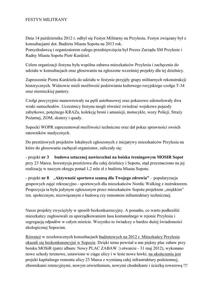 FESTYN MILITRANY Dnia 14 października 2012 r. odbył się Festyn Militarny na Przylesiu. Festyn związany był z konsultacjami dot. Budżetu Miasta Sopotu na 2013 rok. Pomysłodawcą i organizatorem całego przedsięwzięcia był Prezes Zarządu SM Przylesie i Radny Miasta Sopotu Piotr Kurdziel. Celem organizacji festynu była wspólna zabawa mieszkańców Przylesia i zachęcenie do udziału w konsultacjach oraz głosowaniu na zgłoszone wcześniej projekty dla tej dzielnicy. Zaproszenie Piotra Kurdziela do udziału w festynie przyjęły grupy militarnych rekonstrukcji historycznych. Widzowie mieli możliwość podziwiania kultowego rosyjskiego czołgu T-34 oraz niemieckiej pantery. Czołgi precyzyjnie manewrowały na pętli autobusowej oraz pokazowo zdemolowały dwa wraki samochodów. Uczestnicy festynu mogli również zwiedzać wojskowe pojazdy zabytkowe, potężnego KRAZa, kolekcję broni i amunicji, motocykle, wozy Policji, Straży Pożarnej, ZOM, skutery i quady. Sopocki WOPR zaprezentował możliwości techniczne oraz dał pokaz sprawności swoich ratowników medycznych. Do prestiżowych projektów lokalnych zgłoszonych z inicjatywy mieszkańców Przylesia na które do głosowania zachęcał organizator, zaliczały się: - projekt nr 3 budowa sztucznej nawierzchni na boisku treningowym MOSIR Sopot przy 23 Marca. Inwestycja prestiżowa dla całej dzielnicy i Sopotu, stąd przeznaczono na jej realizację w naszym okręgu ponad 1,2 mln zł z budżetu Miasta Sopotu. - projekt nr 8 „Aktywność sportowa szansą dla Twojego zdrowia” – popularyzacja grupowych zajęć rekreacyjno - sportowych dla mieszkańców Nordic Walking z instruktorem. Propozycja ta była jedynym zgłoszonym przez mieszkańców Sopotu projektem „miękkim” tzn. społecznym, niezwiązanym z budową czy remontem infrastruktury technicznej. Nasze projekty zwyciężyły w sposób bezkonkurencyjny. A ponadto, co warto podkreślić mieszkańcy zagłosowali za uporządkowaniem lasu komunalnego w rejonie Przylesia i segregacją odpadów w całym mieście. Wszystko to świadczy o bardzo dużej świadomości ekologicznej Sopocian. Również w zeszłorocznych konsultacjach budżetowych na 2012 r. Mieszkańcy Przylesia okazali się bezkonkurencyjni w Sopocie. Dzięki temu powstał u nas piękny plac zabaw przy boisku MOSiR (patrz album: Nowy PLAC ZABAW :) otwarcie - 31 maj 2012), wykonano nowe schody terenowe, ustawiono w ciągu ulicy i w lesie nowe ławki, na ukończeniu jest projekt kapitalnego remontu ulicy 23 Marca z wymianą całej infrastruktury podziemnej, zbiornikami retencyjnymi, nowym oświetleniem, nowymi chodnikami i ścieżką rowerową !!! Duża frekwencja w głosowaniu i skoncentrowanie głosów na w/w inicjatywach, pozwoli na jeszcze większe efekty pracy pana Piotra Kurdziela w Radzie Miasta Sopotu dla dzielnicy Przylesie i Sopotu. Dla radnego wsparcie wyborców w czasie trwania kadencji jest bezcenne. Atrakcyjny, nietuzinkowy program festynu połączony z degustacją frontowego posiłku z kuchni polowej przyciągnęły tłumy z całego miasta, nie tylko z Osiedla. Przylesie pokazało, że jest nie tylko dynamicznie rozwijającym się, pięknym zakątkiem miasta, ale również integruje społeczność lokalną i Sopocian. Służy temu właśnie proponowane projektów do tegorocznego i ubiegłorocznego budżetu miasta Sopotu: (ścieżka rowerowa, modernizacja boiska czy zajęcia rekreacyjno-ruchowe Nordic Walking). Udana militarna impreza pokazuje, że Mieszkańcy chętnie uczestniczą w tego typu wydarzeniach. Mamy nadzieję, że nie zabraknie Państwa również na kolejnych festynach będących inicjatywą Zarządu SM Przylesie. Dziękujemy Państwu za rekordową frekwencję w porównaniu do innych okręgów Sopotu, udzielone poparcie i okazane zaufanie. Sukces organizacyjny i sukcesy naszych projektów jak i rekordowa frekwencja są dla nas motywacją do kolejnych inicjatyw :) ………………………………………………………………………………………………… Prezes Zarządu SM Przylesie i Radny Miasta Sopotu Piotr Kurdziel dziękuje następującym osobom i instytucjom za udział w imprezie i udzielone wsparcie: - Panu Marianowi Koteckiemu właścicielowi firmy „GRYF” z Żukowa; - Grupie Militarnej Rekonstrukcji Historycznej z Żukowa; - Przedstawicielom Komendy Miejskiej Straży Pożarnej w Sopocie; - Przedstawicielom Komendy Miejskiej Policji i Straży Miejskiej w Sopocie a w szczególności Andrzejowi Śliwskiemu – Z-cy Komendanta SM w Sopocie, mieszkańcowi Przylesia; - Panu Marcinowi Warginowi Dyrektorowi MOSiR Sopot; - Panu Januszowi Kupcewiczowi Dyrektorowi Zakładu Oczyszczania Miasta w Sopocie - Pracownikom MOSiR: Kazimierzowi Zelewskiemu, Danielowi Zelewskiemu, Józefowi Kamińskiemu i Januszowi Wiatrowskiemu, - Ratownikom wodnym i medycznym sopockiego oddziału WOPR; - Radnym Sopotu: Wojciechowi Fułkowi, Jarosławowi Kempie, Piotrowi Bagińskiemu.