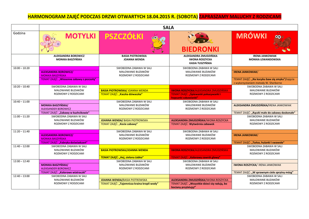 HARMONOGRAM ZAJĘĆ PODCZAS DRZWI OTWARTYCH 18.04.2015 R. (SOBOTA) ZAPRASZAMY MALUCHY Z RODZICAMI SALA Godzina MOTYLKI MRÓWKI PSZCZÓŁKI BIEDRONKI ALEKSANDRA BOROWICZ MONIKA BASZYŃSKA 10:00 – 10:20 ALEKSANDRA BOROWICZ/ MONIKA BASZYŃSKA TEMAT ZAJĘĆ: „Wiosenne zabawy z pszczołą” 10:20 – 10:40 SWOBODNA ZABAWA W SALI MALOWANIE BUZIAKÓW ROZMOWY Z RODZICAMI 10:40 – 11:00 11:00 – 11:20 MONIKA BASZYŃSKA/ ALEKSANDER BOROWICZ TEMAT ZAJĘĆ: „Zabawy w kuchcikowie” SWOBODNA ZABAWA W SALI MALOWANIE BUZIAKÓW ROZMOWY Z RODZICAMI 11:20 – 11:40 11:40 – 12:00 ALEKSANDRA BOROWICZ/ MONIKA BASZYŃSKA TEMAT ZAJĘĆ: „Fabryka doświadczeń” SWOBODNA ZABAWA W SALI MALOWANIE BUZIAKÓW ROZMOWY Z RODZICAMI 12:00 – 12:40 12:40 – 13:00 MONIKA BASZYŃSKA/ ALEKSANDER BOROWICZ TEMAT ZAJĘĆ: „Kolorowe wiatraczki” SWOBODNA ZABAWA W SALI MALOWANIE BUZIAKÓW ROZMOWY Z RODZICAMI BASIA PIOTROWSKA JOANNA WENDA ALEKSANDRA ZMUDZIŃSKA IWONA ROSZYCKA KASIA TUSZYŃSKA SWOBODNA ZABAWA W SALI MALOWANIE BUZIAKÓW ROZMOWY Z RODZICAMI SWOBODNA ZABAWA W SALI MALOWANIE BUZIAKÓW ROZMOWY Z RODZICAMI BASIA PIOTROWSKA/ JOANNA WENDA TEMAT ZAJĘĆ: „Kaczka dziwaczka” SWOBODNA ZABAWA W SALI MALOWANIE BUZIAKÓW ROZMOWY Z RODZICAMI JOANNA WENDA/ BASIA PIOTROWSKA TEMAT ZAJĘĆ: „Kocie zabawy” SWOBODNA ZABAWA W SALI MALOWANIE BUZIAKÓW ROZMOWY Z RODZICAMI IWONA ROSZYCKA/ALEKSANDRA ZMUDZIŃSKA TEMAT ZAJĘĆ: „Śpiewanki pokazywanki i hopsanki zabawianki” SWOBODNA ZABAWA W SALI MALOWANIE BUZIAKÓW ROZMOWY Z RODZICAMI ALEKSANDRA ZMUDZIŃSKA/IWONA ROSZYCKA TEMAT ZAJĘĆ: Wytwórnia zabawek SWOBODNA ZABAWA W SALI MALOWANIE BUZIAKÓW ROZMOWY Z RODZICAMI BASIA PIOTROWSKA/JOANNA WENDA IWONA ROSZYCKA/ALEKSANDRA ZMUDZIŃSKA TEMAT ZAJĘĆ: „Hej, zielona żabko” SWOBODNA ZABAWA W SALI MALOWANIE BUZIAKÓW ROZMOWY Z RODZICAMI TEMAT ZAJĘĆ: „Kolorowy zawrót głowy” SWOBODNA ZABAWA W SALI MALOWANIE BUZIAKÓW ROZMOWY Z RODZICAMI JOANNA WENDA/BASIA PIOTROWSKA TEMAT ZAJĘĆ: „Tajemnicza kraina kropli wody” ALEKSANDRA ZMUDZIŃSKA/IWONA ROSZYCKA TEMAT ZAJĘĆ: „Wszystkie dzieci się radują, bo bociany przylatują!” IRENA JANKOWIAK MONIKA LEWANDOWSKA IRENA JANKOWIAK/ TEMAT ZAJĘĆ: „Na kocyku baw się smyku”/zajęcia z wykorzystaniem metody W. Sherborne SWOBODNA ZABAWA W SALI MALOWANIE BUZIAKÓW ROZMOWY Z RODZICAMI ALEKSANDRA ZMUDZIŃSKA/IRENA JANKOWIAK TEMAT ZAJĘĆ: „Rączki małe do zabawy doskonałe” SWOBODNA ZABAWA W SALI MALOWANIE BUZIAKÓW ROZMOWY Z RODZICAMI IRENA JANKOWIAK/ TEMAT ZAJĘĆ: „Tańce, hulanki i swawole” SWOBODNA ZABAWA W SALI MALOWANIE BUZIAKÓW ROZMOWY Z RODZICAMI IWONA ROSZYCKA/ IRENA JANKOWIAK TEMAT ZAJĘĆ: „W sprawnym ciele sprytny mózg” SWOBODNA ZABAWA W SALI MALOWANIE BUZIAKÓW ROZMOWY Z RODZICAMI