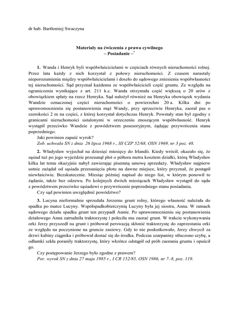 dr hab. Bartłomiej Swaczyna Materiały na ćwiczenia z prawa cywilnego – Posiadanie –* 1. Wanda i Henryk byli współwłaścicielami w częściach równych nieruchomości rolnej. Przez lata każdy z nich korzystał z połowy nieruchomości. Z czasem narastały nieporozumienia między współwłaścicielami i doszło do sądowego zniesienia współwłasności tej nieruchomości. Sąd przyznał każdemu ze współwłaścicieli część gruntu. Ze względu na ograniczenia wynikające z art. 211 k.c. Wanda otrzymała część większą o 20 arów z obowiązkiem spłaty na rzecz Henryka. Sąd nałożył również na Henryka obowiązek wydania Wandzie oznaczonej części nieruchomości o powierzchni 20 a. Kilka dni po uprawomocnieniu się postanowienia mąż Wandy, przy sprzeciwie Henryka, zaorał pas o szerokości 2 m na części, z której korzystał dotychczas Henryk. Powstały stan był zgodny z granicami nieruchomości ustalonymi w orzeczeniu znoszącym współwłasność. Henryk wystąpił przeciwko Wandzie z powództwem posesoryjnym, żądając przywrócenia stanu poprzedniego. Jaki powinien zapaść wyrok? Zob. uchwała SN z dnia 26 lipca 1968 r., III CZP 52/68, OSN 1969, nr 3 poz. 48. 2. Władysław wyjechał na dziesięć miesięcy do Irlandii. Kiedy wrócił, okazało się, że sąsiad tuż po jego wyjeździe przesunął płot o półtora metra kosztem działki, którą Władysław kilka lat temu okazyjnie nabył zawierając pisemną umowę sprzedaży. Władysław najpierw ustnie zażądał od sąsiada przesunięcia płotu na dawne miejsce, który przyznał, że postąpił niewłaściwie. Bezskutecznie. Miesiąc później napisał do niego list, w którym ponowił to żądanie, także bez odzewu. Po kolejnych dwóch miesiącach Władysław wystąpił do sądu z powództwem przeciwko sąsiadowi o przywrócenie poprzedniego stanu posiadania. Czy sąd powinien uwzględnić powództwo? 3. Lucyna nieformalnie sprzedała Jerzemu grunt rolny, którego własność należała do spadku po matce Lucyny. Współspadkobierczynią Lucyny była jej siostra, Anna. W ramach sądowego działu spadku grunt ten przypadł Annie. Po uprawomocnieniu się postanowienia działowego Anna zatrudniła traktorzystę i poleciła mu zaorać grunt. W trakcie wykonywania orki Jerzy przyszedł na grunt i próbował perswazją skłonić traktorzystę do zaprzestania orki ze względu na poczynione na gruncie zasiewy. Gdy to nie poskutkowało, Jerzy chwycił za drzwi kabiny ciągnika i próbował dostać się do środka. Podczas szarpaniny stłuczono szybę, a odłamki szkła poraniły traktorzystę, który wkrótce odstąpił od prób zaorania gruntu i opuścił go. Czy postępowanie Jerzego było zgodne z prawem? Por. wyrok SN z dnia 27 maja 1985 r., I CR 152/85, OSN 1986, nr 7–8, poz. 119. 4. Paweł, mężczyzna o okazałej, wręcz olimpijskiej budowie ciała, korzystał z laptopa podczas podróży pociągiem do Warszawy. Praca tak go pochłonęła, że nie zauważył, kiedy pociąg przyjechał do Warszawy. Błyskawicznie spakował się i wybiegł na peron. Dopiero pod Pałacem Kultury zorientował się, że nie ma laptopa. Wieczorem znowu jechał pociągiem, tym razem z powrotem do Krakowa. Wsiadł do przedziału. Naprzeciwko siedział mężczyzna, który pisał coś na laptopie. Paweł był pewien, że jest to jego laptop, ponieważ miał charakterystycznie zarysowaną obudowę. Mężczyzna, który używał laptopa był nader skromnej postury, a w przedziale nie było nikogo innego ... Jak powinien postąpić Paweł, aby zgodnie z prawem odzyskać laptopa? 5. Rafał był użytkownikiem działki pracowniczej, na której uprawiał głównie drzewa i krzewy owocowe. Po przeprowadzeniu zbiorów Rafał wyjechał 1. września na miesięczny urlop. Po powrocie zastał na swojej działce, tuż przy granicy z sąsiednią działką świeżo wzniesiony kompostownik, do którego dostęp był możliwy jedynie od strony sąsiedniej działki. Następnego dnia Rafał przyszedł ze swoim bratem na działkę z zamiarem zburzenia kompostownika. Na ściance urządzenia siedział sąsiad i wykrzykiwał, że nie dopuści do tego, ponieważ ta część działki Rafała i tak zawsze leżała odłogiem, a on wreszcie ją sensownie zagospodarował. Nie namyślając się długo Rafał przy pomocy brata obezwładnił sąsiada i przeniósł go na schody altanki. Następnie bracia kilofami zburzyli ściany kompostownika. Zbulwersowany sąsiad wystąpił przeciwko Rafałowi z pozwem o przywrócenie posiadania tej części działki, na której znajdował się kompostownik. W trakcie procesu okazało się, że urządzenie to wzniesiono w dniach 3–5 września. Czy powództwo sąsiada powinno zostać uwzględnione? Por. wyrok SN z dnia 27 marca 1968 r., II CR 69/68, Lex nr 6305; wyrok SN z dnia 24 lutego 2005 r., V KK 435/04, Lex nr 147241. 6. Spółka akcyjna Eurobud postanowiła wznieść budynek o łącznej pow. użytkowej 15 000 m2. Inwestor zamierzał w budynku tym wynajmować lokale biurowe. Wykonawcą inwestycji została firma budowlana Polinterbudex. W związku z opóźnieniem w wykonywaniu robót Eurobud odstąpił od umowy o roboty budowlane i powierzył kontynuowanie budowy innemu wykonawcy: firmie Budeximp. Rankiem 21 kwietnia 2011 r. pracownicy Budeximpu usunęli kłódkę na bramie wjazdowej na plac budowy, wprowadzili tam swoje urządzenia i przystąpili do wykonywania robót budowlanych. Polinterbudex uważa jednak, że odstąpienie przez Eurobud od umowy o roboty budowlane jest bezskuteczne, a Budeximp bezprawnie wtargnął na plac budowy. Polinterbudex, niezależnie od procesu wytoczonego Eurobudowi ze względu na niewykonanie umowy o roboty budowlane, wystąpił 20 kwietnia 2012 r. z powództwem posesoryjnym przeciwko Budeximpowi, żądając przywrócenia mu posiadania placu budowy i zaniechania przez pozwanego dalszych naruszeń. Czy powództwo posesoryjne powinno zostać uwzględnione? Por. wyrok SN z 12 grudnia 1990 