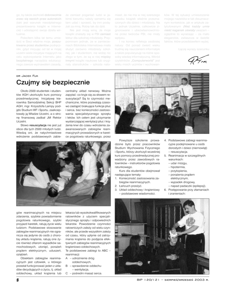 go, by tak¿e zechcieli dobrowolnie zrzec siê swoich praw autorskich (taki jest warunek nieodp³atnego prezentowania ksi¹¿ki w Internecie) i udostêpniæ swoje dzie³a wirtualnie. Poleci³em kilka lat temu umieœciæ w Sieci w³aœnie moje, poszukiwane przez studentów podrêczniki, gdy¿ inicjuj¹c od lat w mojej uczelni wiele inicjatyw maj¹cych na celu wykorzystanie Internetu jako bezp³atnego narzêdzia edukacyjnego zawsze wyznawa³em zasadê, ¿e zamiast poganiaæ ludzi w jakimœ kierunku nale¿y samemu siê tam udaæ i sprawiæ, by inni pod¹¿ali za mn¹. Robiê tak do dziœ. Nie jest moj¹ win¹, ¿e moje ksi¹¿ki znalaz³y siê w PBI zamiast lektur dla szkolnej m³odzie¿y. Przypominam jednak, ¿e w zamierzeniach Biblioteka Internetowa mia³a s³u¿yæ zarówno m³odzie¿y szkolnej, jak i studentom, nie widzê nic z³ego w tym, ¿e s¹ w niej miêdzy innymi ksi¹¿ki naukowe lub orygina³y starodruków – szkoda nato- miast, ¿e nie ma w niej szerszego zasobu ksi¹¿ek w³aœnie przeznaczonych dla dzieci i m³odzie¿y. Na to jednak Uczelnie, ca³kowicie zignorowane i ubezw³asnowolnione przez twórców PBI, nie mia³y wp³ywu. I na koniec refleksja osobistej natury: Od ponad æwieræ wieku trudniê siê nauczaniem informatyki a tak¿e popularyzujê na ró¿ne sposoby wiedzê informatyczn¹. Wœród czytelników „Computerworld” jest wielu moich uczniów i wychowan- ków. W tej sytuacji umieszczanie mojego nazwiska w tak dwuznacznym kontekœcie, jak w artykule zatytu³owanym (Nie) ka¿dy umie nieœæ kaganek oœwiaty uwa¿am – oglêdnie to wyra¿aj¹c – za ma³o eleganckie, zw³aszcza w œwietle faktów, które przedstawi³em wy¿ej. Powy¿sze szkolenie prowadzone by³o przez pracowników Studium Wychowania Fizycznego i Sportu, którzy ukoñczyli wczeœniej kurs pomocy przedmedycznej prowadzony przez zawodowych ratowników – instruktorów pogotowia ratunkowego. Kurs dla studentów obejmowa³ nastêpuj¹ce tematy: 1. Koniecznoœæ zastosowania zabiegów reanimacyjnych. 2. £añcuch prze¿yæ. 3. Uk³ad oddechowy i kr¹¿eniowy – podstawowe wiadomoœci. 4. Podstawowe zabiegi reanimacyjne podejmowane u osób doros³ych i dzieci (niemowl¹t) – resuscytacja. 5. Reanimacja w szczególnych warunkach: – udar mózgu, – hipotermia, – przytopienia, – pora¿enia pr¹dem elektrycznym, – wypadek drogowy, – napad padaczki (epilepsji). 6. Postêpowanie przy z³amaniach i zranieniach: £¹czê wyrazy szacunku dr Jacek Fuk Czujmy siê bezpiecznie Oko³o 2500 studentek i studentów AGH ukoñczy³o kurs pomocy przedmedycznej. Inicjatywê kierownika Samodzielnej Sekcji BHP AGH, mgr. Krzysztofa Lampy podjê³o Studium WF i Sportu, zaakceptowa³y j¹ W³adze Uczelni, a o stronê finansow¹ zadba³ JM Rektor Uczelni. S³owo resuscytacja nie jest ju¿ obce dla tych 2500 m³odych ludzi. Wiedz¹ oni, ¿e natychmiastowe wdro¿enie podstawowych zabie- gów reanimacyjnych na miejscu zdarzenia, szybkie powiadomienie pogotowia ratunkowego, szybki przyjazd karetek, ratuj¹ ¿ycie wielu ludziom. Podstawowe stosowanie zabiegów reanimacyjnych nie ogranicza siê jedynie do osób z chorob¹ uk³adu kr¹¿enia, ratuj¹ one ¿ycie równie¿ ofiarom wypadków samochodowych, utoniêæ, pora¿eñ pr¹dem elektrycznym, uduszeñ, oziêbieñ. Obiektem zabiegów reanimacyjnych jest cz³owiek, u którego przesta³ funkcjonowaæ jeden z uk³adów decyduj¹cych o ¿yciu, tj. uk³ad oddechowy, uk³ad kr¹¿enia lub 8 centralny uk³ad nerwowy. Mo¿na zapytaæ: co kryje siê za s³owem resuscytacja? S¹ to czynnoœci mechaniczne, które pozwalaj¹ czasowo zast¹piæ brakuj¹ce funkcje p³uc i serca, bez koniecznoœci zastosowania specjalistycznego sprzêtu i leków. Ich celem jest utrzymanie wystarczaj¹cej wentylacji p³uc i kr¹¿enia krwi do czasu wdro¿enia zaawansowanych zabiegów reanimacyjnych prowadzonych w karetce pogotowia ratunkowego, przez lekarza lub wysokokwalifikowanych ratowników z u¿yciem specjalistycznego sprzêtu i odpowiednich lekarstw. Powodzenie czynnoœci ratowniczych zale¿y od wielu czynników, ale przede wszystkim zale¿y od czasu, który up³ynie od zatrzymania kr¹¿enia do podjêcia efektywnych zabiegów reanimacyjnych kr¹¿eniowo-oddechowych. Te podstawowe zabiegi to ABC – reanimacji: A – udro¿nienie dróg oddechowych, B – sprawdzenie oddechu – wentylacja, C – poœredni masa¿ serca. BIP 120/121 – sierpieñ/wrzesieñ 2003 r. – unieruchomienie z³amanej koñczyny, – tamowanie krwotoków, – opatrywanie ran. 7. Pozycje – uk³adanie chorego: – pozycja boczna ustalona, – szokowa – omdlenia, – pó³siedz¹ca – zranienia g³owy, udar s³oneczny. Szkolenie zosta³o przeprowadzone ze studentami II roku, którzy w semestrze letnim ukoñczyli zajêcia z WF-u (GGiOŒ, WZ, WPiE, GiG, WNiG, IMiC, WMN, MS, Odlewnictwa). Na pocz¹tku roku akademickiego 2003/2004 planujemy przeprowadzenie podobnego szkolenia ze studentami nastêpu- j¹cych wydzia³ów: MiIM, GGiIŒ, EAIiE, IMiR, FiTJ, NSS. Statystyki podaj¹, ¿e 2/3 nag³ych zgonów z powodu choroby uk³adu kr¹¿enia nastêpuje poza szpitalem, przewa¿nie w ci¹gu 2 pierwszych godzin po wyst¹pieniu objawów choroby. Natychmiastowa pomoc reanimacyjna (resu- dr in¿. Wac³aw Muzykiewicz – Prodziekan Wydzia³u Metali Nie¿elaznych AGH, Wiceprezes Oddzia³u Metali Nie¿elaznych SITPH Kszta³cenie kadr dla przemys³u Spotkanie mened¿erów i kadry naukowo-dydaktycznej Metali Nie¿elaznych Tu¿ przed wakacjami, pod koniec maja, odby³o siê w Krakowie w AGH, spotkanie Klubu Mened¿era Przemys³u Metali Nie¿elaznych. Klub powsta³ z gór¹ dziesiêæ lat temu, w³aœnie w AGH, podczas jednej z Kwartalnych Konferencji Oddzia³u Metali Nie¿elaznych Stowarzyszenia In¿ynierów i Techników Przemys³u Hutniczego, z inicjatywy Prezesa Oddzia³u dr in¿. Józefa Zbigniewa Szymañskiego. St¹d spotkanie to mia³o charakter jubileuszowy. Jubileusz w ¿adnym stopniu nie przes³oni³ jednak wiod¹cego tematu spotka