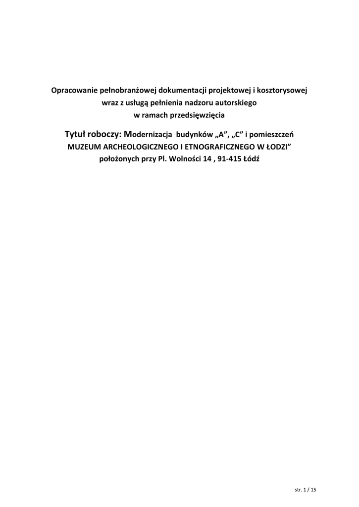 Opracowanie pełnobranżowej dokumentacji projektowej i kosztorysowej wraz z usługą pełnienia nadzoru autorskiego w ramach przedsięwzięcia Tytuł roboczy: Modernizacja budynków „A”, „C” i pomieszczeo MUZEUM ARCHEOLOGICZNEGO I ETNOGRAFICZNEGO W ŁODZI” położonych przy Pl. Wolności 14 , 91-415 Łódź str. 1 / 15 ROZDZIAŁ 1. OPIS PRZEDMIOTU ZAMÓWIENIA I. ZAKRES Dokumentacja stanowiąca przedmiot zamówienia obejmuje zakresem następujące obiekty MUZEUM ARCHEOLOGICZNEGO I ETNOGRAFICZNEGO W ŁODZI: 1. Budynek „A” 2. Budynek „C” zlokalizowane w Łodzi przy pl. Wolności 14, na działce o nr ewid. 127/1 obr. S-1. II. ETAPY W zakres szczegółowego opracowania stanowiącego przedmiot zamówienia, z podziałem na poszczególne etapy, wchodzą: II.a. ETAP PROJEKTOWY: 1. Uzyskanie w imieniu Zamawiającego warunków przyłączeniowych lub zwiększających moc, ewentualnie na usunięcie kolizji, w szczególności dotyczących: 1.1.Istniejącego przyłącza energetycznego, 1.2.Projektowanego przyłącza do sieci cieplnej i projektowanego węzła cieplnego, 1.3.Przebudowy istniejącego przyłącza gazowego, 1.4.Istniejącego przyłącza wodociągowego i kanalizacyjnego, 1.5.Przyłącza telekomunikacyjnego, 2. Projekt budowlano - wykonawczy zagospodarowania terenu, 3. Projekt architektoniczno - budowlany w zakresie branż: 3.1.Architektonicznej, 3.2.Konstrukcyjnej, 3.3.Drogowej, 3.4.Instalacyjnej obejmującej instalacje: 3.4.1. Wodociągową oraz kanalizacji sanitarnej i deszczowej, wewnętrzne i zewnętrzne, w tym przeciwpożarowa instalacja wodociągowa, 3.4.2. Wentylacji mechanicznej, klimatyzacji i rekuperacji pomieszczeo wystawowych i ekspozycyjnych, magazynowych, pracowni, biurowych, sanitarnego, szatni, archiwum, sali konferencyjnej, audiowizualnej, biblioteki, czytelni, serwerowni oraz piwnic w tym klimatyzacji precyzyjnej wskazanych przez Zamawiającego pomieszczeo, 3.4.3. Centralnego ogrzewania i ciepła technologicznego, 3.4.4. Gazową, 3.4.5. Przebudowy istniejącej kotłowni, str. 2 / 15 3.5.Elektrycznej obejmującej instalacje: 3.5.1. Wewnętrzne siły i oświetlenia, w tym oświetlenia awaryjnego i ewakuacyjnego wraz z ich centralnym monitorowaniem, zawierającego oznakowanie bezpieczeostwa i ewakuacyjne, 3.5.2. Dedykowane zasilania sieci komputerowych okablowania strukturalnego wraz z centralnym zasilaczem awaryjnym UPS, 3.5.3. Rozdzielnię główną i układ pomiarowy, 3.5.4. Wewnętrzne linie zasilające, 3.5.5. Zasilania awaryjnego dźwigów osobowo – towarowych, 3.5.6. Zasilania i automatyki rolet zaciemniających sale wystawowe i ekspozycyjne oraz konferencyjne oraz ekranów projekcyjnych, 3.5.7. Zewnętrzne oświetlenia i iluminacji elewacji, 3.5.8. Odgromową, 3.5.9. Podgrzewania koszy, rynien, wpustów, schodów, pochylni, 3.6.Teletechnicznej obejmującej systemy i instalacje oraz urządzenia i sprzęt, w tym: 3.6.1. Multimedialne (m in. interaktywne wystawy; systemy projekcyjne; tablice interaktywne; nagłośnienie w częściach ogólnodostępnych dla zwiedzających, komunikacji, salach wystawowych, sali konferencyjnej, zaplecza gastronomicznego, szatni; wyposażenie sali audiowizualnej) 3.6.2. Sieci komputerowych (LAN / WLAN), w tym światłowodowych, 3.6.3. Systemu sygnalizacji włamania i napadu (SSWiN), w szczególności z uwzględnieniem rozporządzenia, o którym mowa w pkt. 7 ppkt. 14.1, 3.6.4. Kontroli dostępu (KD) do wybranych pomieszczeo, w szczególności z uwzględnieniem rozporządzenia, o którym mowa w pkt. 7 ppkt. 14.1, 3.6.5. Telefoniczną, 3.6.6. Telewizyjną, 3.6.7. System detekcji wycieku wody w kluczowych częściach budynków, o ile będą zagrożone zalaniem np. dla ochrony zbiorów muzeum, archiwum, serwerowni, 3.6.8. Wideo - domofonu, 3.6.9. Telewizji dozorowej wewnętrznej i zewnętrznej (CCTV), w szczególności z uwzględnieniem rozporządzenia, o którym mowa w pkt. 7 ppkt. 14.1, 3.6.10. Systemu sygnalizacji pożaru (SSP) z uwzględnieniem połączenia z zewnętrzną jednostką monitorującą i Komendą Paostwowej Straży Pożarnej oraz z uwzględnieniem rozporządzenia, o którym mowa w pkt. 7 ppkt. 14.1, 3.6.11. Przeciwpożarowe jeśli wymagane wg przepisów lub ekspertyz np. oddymiania, napowietrzania, dźwiękowy system ostrzegania, 4. Projekt określający sposób przemieszczenia zbiorów muzeum (w szczególności wielkogabarytowych) na czas prowadzenia robót budowlanych, w szczególności z uwzględnieniem rozporządzenia, o którym mowa w pkt. 7 ppkt. 14.1, 5. Projekty wykonawcze, wraz z zatwierdzeniem przez Miejskiego Konserwatora Zabytków, uzupełniające wszystkie w/w projekty budowlane (jeżeli nie zostały opracowane w ramach projektu budowlanego) oraz dodatkowo obejmujące : 5.1.Projekty konserwatorskie uzupełniające projekty wykonane w etapie przedprojektowym, str. 3 / 15 5.2.Projekt odgrzybienia, osuszenia, odsolenia oraz izolacji przeciwwodnych poziomych i pionowych murów i fundamentów, 5.3.Projekt iluminacji elewacji, 5.4.Projekty aranżacji wnętrz dla komunikacji i części ogólnodostępnych dla zwiedzających, wejścia głównego, szatni w tym m.in. projekty posadzek, okładzin ściennych, sufitów, wnętrza dźwigów osobowo – towarowych, 5.5.Projekt wyposażenia i mebli, zawierający rzuty i specyfikację, 5.6.Projekt kompleksowej identyfikacji wizualnej, w tym: kierunkowskazy, plany budynków, oznakowania pomieszczeo, gabloty informacyjne, numerki do kluczy, numerki szatniowe, numerki drzwiowe, tablice informacyjne, numer policyjny, logotypy itp. 6. Specyfikacje techniczne wykonania i odbioru robót dla wszystkich branż, 7. Przedmiary, kosztorysy nakładcze i inwestorskie dla wszystkich branż, 8. Wystąpienie z wnioskami i uzyskanie w imieniu Zamawiającego zgód na odstępstwa od przepisów technicznych, w tym w szczególności: 8.1.Paostwowego Wojewódzkiego Inspektora Sanitarnego w Łodzi, 8.2.Okręgowego Inspektora Pracy Paostwowej Inspekcji Pracy, 8.3.Łódzkiego Wojewódzkiego 