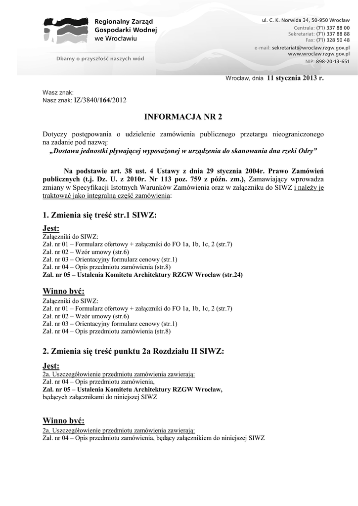 Wrocław, dnia 11 stycznia 2013 r. Wasz znak: Nasz znak: IZ/3840/164/2012 INFORMACJA NR 2 Dotyczy postępowania o udzielenie zamówienia publicznego przetargu nieograniczonego na zadanie pod nazwą: „Dostawa jednostki pływającej wyposażonej w urządzenia do skanowania dna rzeki Odry” Na podstawie art. 38 ust. 4 Ustawy z dnia 29 stycznia 2004r. Prawo Zamówień publicznych (t.j. Dz. U. z 2010r. Nr 113 poz. 759 z późn. zm.), Zamawiający wprowadza zmiany w Specyfikacji Istotnych Warunków Zamówienia oraz w załączniku do SIWZ i należy je traktować jako integralną część zamówienia: 1. Zmienia się treść str.1 SIWZ: Jest: Załączniki do SIWZ: Zał. nr 01 – Formularz ofertowy + załączniki do FO 1a, 1b, 1c, 2 (str.7) Zał. nr 02 – Wzór umowy (str.6) Zał. nr 03 – Orientacyjny formularz cenowy (str.1) Zał. nr 04 – Opis przedmiotu zamówienia (str.8) Zał. nr 05 – Ustalenia Komitetu Architektury RZGW Wrocław (str.24) Winno być: Załączniki do SIWZ: Zał. nr 01 – Formularz ofertowy + załączniki do FO 1a, 1b, 1c, 2 (str.7) Zał. nr 02 – Wzór umowy (str.6) Zał. nr 03 – Orientacyjny formularz cenowy (str.1) Zał. nr 04 – Opis przedmiotu zamówienia (str.8) 2. Zmienia się treść punktu 2a Rozdziału II SIWZ: Jest: 2a. Uszczegółowienie przedmiotu zamówienia zawierają: Zał. nr 04 – Opis przedmiotu zamówienia, Zał. nr 05 – Ustalenia Komitetu Architektury RZGW Wrocław, będących załącznikami do niniejszej SIWZ Winno być: 2a. Uszczegółowienie przedmiotu zamówienia zawierają: Zał. nr 04 – Opis przedmiotu zamówienia, będący załącznikiem do niniejszej SIWZ 3. Zmienia się treść str. 6 załącznika nr 04 do SIWZ pod nazwą - Opis przedmiotu zamówienia: Jest: Dodatkowy sprzęt. 1. Komputer PC (work station) z powszechnie stosowanym systemem operacyjnym np./Windows, Linux/. 2. Ploter A0. 3. Monitor LCD, 1 szt. na jednostce pływającej ( rozmiar minimalny przekątnej ekranu dopasowany do wymiarów sterówki), 1szt. o przekątnej > 42 cali – do przeglądania danych w bazie. Razem 2 szt. 4. Przenośne dyski twarde do komputerów PC o pojemności minimum 500 Gbajt – 4 szt. 5. Blue Ray z kompletem 50 szt. Dysków. Jednostkę należy przystosować do montażu oprzyrządowania związanego z aparaturą do prowadzenia pomiarów batymetrycznych poprzez zamontowanie po obu burtach jednostki pływającej głowic sonarów na końcach wysięgników. Zapewnić należy możliwość zmiany odległości pomiędzy głowicami sonarów poprzez zmienne ustawienie wysięgników względem osi geometrycznej (a tym samym burt) jednostki pływającej. Należy także uwzględnić możliwość przenoszenia jednej sondy z wysięgnika na samodzielne, pojedyncze stanowisko w części dziobowej /wraz z niezbędnym okablowaniem i dostępem do stanowiska / w celu realizacji zadań inspekcyjnych. Oferta powinna zawierać pełny koszt wykonania i montażu mechanicznego i hydraulicznego wysięgników do zamocowania głowic sonarów przy burtach jednostki pływającej /wraz z robotami i kosztami koniecznymi/. Jednostkę należy wyposażyć w środki łączności kompatybilne ze sprzętem używanym przez Zamawiającego na innych jednostkach pływających i lądzie, zgodnie z „Ustaleniami Komitetu Architektury RZGW Wrocław” z dnia 11.08.2011r. /w załączeniu/. Winno być: Dodatkowy sprzęt. 1. Komputer PC (work station) z powszechnie stosowanym systemem operacyjnym np./Windows, Linux/. 2. Ploter A0. 3. Monitor LCD, 1 szt. na jednostce pływającej ( rozmiar minimalny przekątnej ekranu dopasowany do wymiarów sterówki), 1szt. o przekątnej > 42 cali – do przeglądania danych w bazie. Razem 2 szt. 4. Przenośne dyski twarde do komputerów PC o pojemności minimum 500 Gbajt – 4 szt. 5. Blue Ray z kompletem 50 szt. Dysków. Jednostkę należy przystosować do montażu oprzyrządowania związanego z aparaturą do prowadzenia pomiarów batymetrycznych poprzez zamontowanie po obu burtach jednostki pływającej głowic sonarów na końcach wysięgników. Zapewnić należy możliwość zmiany odległości pomiędzy głowicami sonarów poprzez zmienne ustawienie wysięgników względem osi geometrycznej (a tym samym burt) jednostki pływającej. Należy także uwzględnić możliwość przenoszenia jednej sondy z wysięgnika na samodzielne, pojedyncze stanowisko w części dziobowej /wraz z niezbędnym okablowaniem i dostępem do stanowiska / w celu realizacji zadań inspekcyjnych. Oferta powinna zawierać pełny koszt wykonania i montażu mechanicznego i hydraulicznego wysięgników do zamocowania głowic sonarów przy burtach jednostki pływającej /wraz z robotami i kosztami koniecznymi/. Jednostkę należy wyposażyć w środki łączności kompatybilne ze sprzętem używanym przez Zamawiającego na innych jednostkach pływających i lądzie.