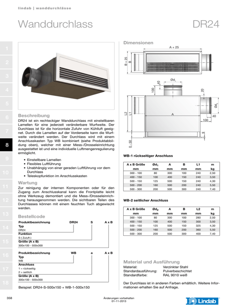 lindab | wanddurch lässe Wanddurchlass DR24 Dimensionen A + 25 B + 25 B 1 2 3 4 20 100 40 Ød1 8 9 • Einstellbare Lamellen • Flexibles Luftführung • Unabhängig von einer geraden Luftführung vor dem Durchlass • Teleskopfunktion im Anschlusskasten 10 11 12 13 14 L2 L1 DR24 ist ein rechteckiger Wanddurchlass mit einstellbaren Lamellen für eine jederzeit veränderbare Wurfweite. Der Durchlass ist für die horizontale Zufuhr von Kühlluft geeignet. Durch die Lamellen auf der Vorderseite kann die Wurfweite verändert werden. Der Durchlass wird mit einem Anschlusskasten Typ WB kombiniert (siehe Produktabbildung oben), welcher mit einer Mess-/Drosseleinrichtung ausgestattet ist und eine individuelle Luftmengenregulierung ermöglicht. Wartung Zur reinigung der internen Komponenten oder für den Zugang zum Anschlusskanal kann die Frontplatte leicht ohne Werkzeug demontiert und die Mess-/Drosseleinrichtung herausgenommen werden. Die sichtbaren Teilen des Durchlasses können mit einem feuchten Tuch abgewischt werden. Bestellcode Produktbezeichnung Typ DR24 S AxB A 40 100 9 7 Beschreibung 0 - 50 6 Ød2 5 WB-1 rückseitiger Anschluss A x B Größe Ød1 A B L1 m mm mm mm mm mm kg 300 - 100 80 300 100 240 2,50 400 - 150 100 400 150 240 3,50 500 - 150 125 500 150 240 4,30 500 - 200 160 500 200 240 5,50 500 - 300 200 500 300 240 7,40 WB-2 seitlicher Anschluss A x B Größe Ød2 A B L2 m mm mm mm mm mm kg 300 - 100 80 300 100 280 2,50 400 - 150 100 400 150 300 3,50 500 - 150 125 500 150 325 4,30 DR24 500 - 200 160 500 200 360 5,50 Funktion 500 - 300 200 500 300 400 7,40 S ( Zuluft ) 15 Größe (A x B) 16 Produktbezeichnung Typ 300x100 - 500x300 WB WB Anschluss 17 1 = rückseitig 2 = seitlich Größe (A x B) 18 358 300x100 - 500x300 Beispiel: DR24-S-500x150 + WB-1-500x150 a AxB Material und Ausführung Material: Standardausführung: Standardfarbe: Verzinkter Stahl Pulverbeschichtet RAL 9010 weiß Der Durchlass ist in anderen Farben erhältlich. Weitere Informationen erhalten Sie auf Anfrage. Änderungen vorbehalten 01-11-2013 lindab | wanddurchl ässe Wanddurchlass DR24 Technische Daten 1 Leistung Eigendämpfung Die Diagramme zeigen den Gesamtdruckverlust Δpt [Pa], Wurfweite l0,2 [m] sowie Schallleistungspegel LWA [dB(A)] als Funktion des Volumenstromes qv [l/s, m³/h] Eigendämpfung des Durchlasses ΔL zwischen Rohr-/Kanalsystem und Raum, einschließlich Mündungsreflexion. Frequenzabhängiger Schallleistungspegel WB-1 rückseitiger Anschluss Der Schallleistungspegel im Frequenzbereich wird durch LWOK= LWA+ Kok definiert. Die Werte für Kok werden in Tabellen unter den folgenden Diagrammen angegeben. Schnellauswahl WB-1 rückseitiger Anschluss AxB Minimum pt = 50 Pa pt = 50 Pa Pi>5 Pa LWA=30 dB(A) LWA=35 dB(A) mm l/s m3/h l/s m3/h l/s m3/h 300 - 100 16 58 - - 29 104 400 - 150 33 119 - - 38 137 500 - 150 44 158 - - 60 216 500 - 200 50 180 62 223 86 310 500 - 300 61 221 84 302 109 392 WB-2 seitlicher Anschluss AxB Minimum pt = 50 Pa pt = 50 Pa Pi>5 Pa LWA=30 dB(A) LWA=35 dB(A) m3/h l/s 14 49 29 106 500 - 150 35 500 - 200 47 500 - 300 56 mm l/s 300 - 100 400 - 150 m3/h l/s 20 72 26 94 39 140 50 180 126 - - 56 202 169 - - 83 299 200 - - - - AxB 2 3 Mittelfrequenz Hz mm 63 125 250 500 1K 2K 4K 8K 300 - 100 24 18 14 7 9 11 11 12 400 - 150 21 19 7 6 9 11 11 11 10 500 - 150 20 19 7 9 8 10 10 500 - 200 17 15 5 10 8 12 10 10 500 - 300 15 12 4 13 9 11 10 10 4 5 WB-2 seitlicher Anschluss AxB 6 Mittelfrequenz Hz mm 63 125 250 500 1K 2K 4K 8K 300 - 100 22 17 11 8 10 13 11 11 400 - 150 21 16 5 9 8 12 11 11 500 - 150 19 18 5 8 8 10 10 10 500 - 200 18 13 3 9 11 6 8 7 500 - 300 15 10 4 4 12 12 11 11 7 8 9 m3/h 10 11 12 Wurfweite l0,2 Die Wurfweite wird bei einer Endgeschwindigkeit von 0,2 m/s (90-%-Fraktil) angegeben. L;M= X X X X $224 13 14 X 15 16 L; M = Q6;LS= Q6;MH= 17 18 Änderungen vorbehalten 01-11-2013 359 lindab | wanddurch lässe Wanddurchlass DR24 Technische Daten 1 2 Strahlausbreitung WB Drossel lb = Abstand vom Durchlass bis zum Punkt der maximalen Strahlspreizung bv = Strahldicke in vertikaler Ebene. bh = Strahlbreite horizontaler Ebene. bv 3 4 l0,2 bh 5 6 7 8 9 10 l0,2 Normale Wurfweite 45° nach oben l02: Diagrammwert bv: 0,05 × l0,2 bh: 1,8 × l0,2 Lange Wurfweite 0° l02: 1,5 × Diagrammwert bv: 0,1 × l0,2 bh: 0,5 × l0,2 11 12 13 14 15 16 17 18 360 Änderungen vorbehalten 01-11-2013 lindab | wanddurchl ässe Wanddurchlass DR24 WB 1 - rückseitiger Anschluss WB 2 - seitlicher Anschluss 1 ǻp t [Pa ] DR-24-S-300-100+WB-1-300x100 250 200 ǻp t [Pa ] DR-24-S-300x100+WB-2-300x100 250 200 50 150 45 100 45 70 35 50 50 100 40 70 2 150 3 40 50 35 30 30 30 4 30 25 20 20 20 15 25 15 LWA dB(A) 10 5 10 20 15 30 40 50 20 60 30 70 80 40 100 150 LWA dB(A) 20 q V [l/ s] 50 60 70 q V [m 3/h] 200 10 5 10 20 15 30 40 50 20 60 30 70 80 100 5 q V [l/ s] 60 70 q V [m 3/h] 200 40 50 150 6 Hz 63 125 250 500 1K 2K 4K 8K Hz 63 125 250 500 1K 2K 4K 8K Kok 3 -5 1 -1 -4 -14 -23 -27 Kok -2 1 4 -1 -6 -17 -22 -26 7 ǻp t [Pa ] DR-24-S-400x150+WB-1-400x150 250 200 ǻp t [Pa ] DR-24-S-400x150+WB-2-400x150 250 200 150 8 50 150 45 50 100 100 40 45 70 40 50 35 50 30 35 30 30 25 30 20 20 25 15 LWA dB(A) LWA dB(A) q V [l/ s] 10 15 10 20 15 20 10 9 70 20 30 40 50 60 10 70 80 90 q V [l/ s] 10 15 20 30 40 50 60 70 80 90 q V [m 3/h] 40 50 60 70 80 100 150 200 q V [m 3/h] 300 40 50 60 70 80 100 150 200 11 300 Hz 63 125 250 500 1K 2K 4K 8K Hz 63 125 250 500 1K 2K 4K 8K Kok 7 -1 1 0 -6 -17 -20 -26 Kok 1 3 2 -1 -6 -14 -20 -25 12 13 ǻp t [Pa ] DR-24-S-500x150+WB-1-500x150 250 200 ǻp t [Pa ] DR-24-S-500x150+WB-2-500x150 250 200 150 14 150 50 100 100 50 45 70 70 45 15 40 50 50 40 35 30 20 LWA dB(A) 10 q V [l/ s] 15 20 30 40 50 60 70 80 90 16 25 15 20 10 30 20 25 15 35 30 30 LWA dB(A) 20 10 q V [l/ s] 10 15 20 30 40 50 60 70 80 90 q V [m 3/h] 40 50 60 70 80 100 150 200 300 400 q V [m 3/h] 40 50 60 70 80 100 150 200 300 Hz 63 125 250 500 1K 2K 4K 8K Hz 63 125 250 500 1K 2K 4K 8K Kok 0 -1 2 1 -8 -15 -21 -28 Kok 2 0 -1 -2 -3 -13 -22 -32 Änd