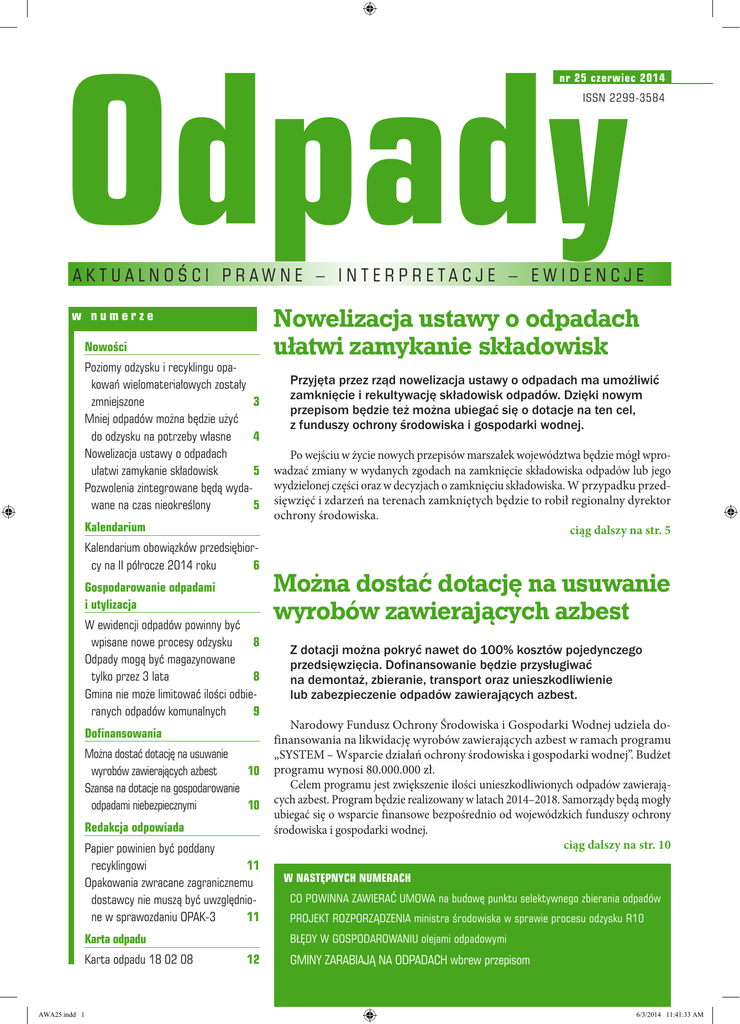 Odpady nr 25 czerwiec 2014 issn 2299-3584 AKTUA L NO Ś C I PRAWNE – INTERPRETA C JE – EWIDEN C JE w numerze Nowości Poziomy odzysku i recyklingu opakowań wielomateriałowych zostały zmniejszone 3 Mniej odpadów można będzie użyć do odzysku na potrzeby własne 4 Nowelizacja ustawy o odpadach ułatwi zamykanie składowisk 5 Pozwolenia zintegrowane będą wydawane na czas nieokreślony 5 Kalendarium Kalendarium obowiązków przedsiębiorcy na II półrocze 2014 roku 6 Gospodarowanie odpadami i utylizacja W ewidencji odpadów powinny być wpisane nowe procesy odzysku 8 Odpady mogą być magazynowane tylko przez 3 lata 8 Gmina nie może limitować ilości odbieranych odpadów komunalnych 9 Dofinansowania Można dostać dotację na usuwanie wyrobów zawierających azbest 10 Szansa na dotacje na gospodarowanie odpadami niebezpiecznymi 10 Redakcja odpowiada Papier powinien być poddany recyklingowi 11 Opakowania zwracane zagranicznemu dostawcy nie muszą być uwzględnione w sprawozdaniu OPAK-3 11 Karta odpadu Karta odpadu 18 02 08 AWA25.indd 1 Nowelizacja ustawy o odpadach ułatwi zamykanie składowisk Przyjęta przez rząd nowelizacja ustawy o odpadach ma umożliwić zamknięcie i rekultywację składowisk odpadów. Dzięki nowym przepisom będzie też można ubiegać się o dotacje na ten cel, z funduszy ochrony środowiska i gospodarki wodnej. Po wejściu w życie nowych przepisów marszałek województwa będzie mógł wprowadzać zmiany w wydanych zgodach na zamknięcie składowiska odpadów lub jego wydzielonej części oraz w decyzjach o zamknięciu składowiska. W przypadku przedsięwzięć i zdarzeń na terenach zamkniętych będzie to robił regionalny dyrektor ochrony środowiska. ciąg dalszy na str. 5 Można dostać dotację na usuwanie wyrobów zawierających azbest Z dotacji można pokryć nawet do 100% kosztów pojedynczego przedsięwzięcia. Dofinansowanie będzie przysługiwać na demontaż, zbieranie, transport oraz unieszkodliwienie lub zabezpieczenie odpadów zawierających azbest. Narodowy Fundusz Ochrony Środowiska i Gospodarki Wodnej udziela dofinansowania na likwidację wyrobów zawierających azbest w ramach programu „SYSTEM – Wsparcie działań ochrony środowiska i gospodarki wodnej”. Budżet programu wynosi 80.000.000 zł. Celem programu jest zwiększenie ilości unieszkodliwionych odpadów zawierających azbest. Program będzie realizowany w latach 2014–2018. Samorządy będą mogły ubiegać się o wsparcie finansowe bezpośrednio od wojewódzkich funduszy ochrony środowiska i gospodarki wodnej. ciąg dalszy na str. 10 W NASTĘPNYCH NUMERACH Co powinna zawierać umowa na budowę punktu selektywnego zbierania odpadów Projekt rozporządzenia ministra środowiska w sprawie procesu odzysku R10 Błędy w gospodarowaniu olejami odpadowymi 12 Gminy zarabiają na odpadach wbrew przepisom 6/3/2014 11:41:33 AM Od redakcji OD REDAKCJI Zmiany prawne 30 maja Drogi Czytelniku Wejście w życie ustawy o odpadach z 14 grudnia 2012 r. spowodowało konieczność wprowadzenia nowych rozporządzeń wykonawczych. Część z nich udało się już wdrożyć, ale niektóre są jeszcze w fazie projektów. Dostępny jest m.in. projekt rozporządzenia w sprawie listy odpadów, które można poddawać odzyskowi na potrzeby własne. O tym, jakie zmiany nas czekają po wejściu w życie tego rozporządzenia, piszemy na str. 4. Sama ustawa o odpadach również została już znowelizowana. Nowe przepisy mają bowiem umożliwić zamknięcie i rekultywację 233 składowisk odpadów oraz pozyskanie środków na ten cel. Po więcej szczegółów na ten temat zapraszam na str. 5. Zachęcam do lektury całego numeru, a jeżeli mają Państwo jakieś sugestie dotyczące miesięcznika, proszę je zgłaszać do redakcji. Rozporządzenie ministra środowiska z 16 kwietnia 2014 r. w sprawie minimalnych rocznych poziomów odzysku i recyklingu dla opakowań wielomateriałowych oraz dla opakowań po środkach niebezpiecznych, w poszczególnych latach, poniżej których nie mogą zostać określone poziomy w porozumieniu zawieranym z marszałkiem województwa. Rozporządzenie określa minimalne roczne poziomy odzysku i recyklingu odpadów opakowaniowych pochodzących z opakowań wielomateriałowych oraz opakowań po środkach niebezpiecznych, które organizacja samorządu gospodarczego – reprezentująca grupę przedsiębiorców wprowadzających powyższe produkty w opakowaniach – zobowiązuje się osiągnąć do 31 grudnia 2020 r. oraz w latach następnych, w porozumieniu zawieranym z marszałkiem województwa. 12 czerwca Ustawa z 4 kwietnia 2014 r. o zmianie ustawy o odpadach. Nowelizacja pozwoli na aktualizację harmonogramów rekultywacji składowisk odpadów. Dzięki temu samorządy oraz spółki zarządzające składowiskami będą mogły skorzystać z pieniędzy z funduszu ochrony środowiska i gospodarki wodnej na ich zamknięcie i rekultywację. Znakowanie opakowań Anna Kolasa redaktor prowadząca Odpady Redaktor prowadząca: Anna Kolasa Redaktor naczelna grupy wydawniczej: Aldona Kapica Menedżer produktu: Mariusz Miętusiewicz Kierownik grupy wydawniczej: Julita Lewandowska-Tomasiuk Druk: Paper&Tinta Skład: 6AN Studio Nakład: 1600 egz. Ostrzegawcze oznaczenia ADR – materiały utleniające Do klasy 5.1 zalicza się materiały, przez które inne materiały mogą podlegać zapaleniu lub ich spalanie może się zintensyfikować. Materiałami utleniającymi są przykładowo azotan amonowy (saletra amonowa), azotyn sodowy czy też nadtlenek potasowy. Ich transport wymaga szczególnej ostroż- ności i procedur postępowania zgodnie z przepisami ADR, gdyż niektóre z tych materiałów pod wpływem zanieczyszczeń mogą się rozkładać wybuchowo, jak zdarza się to w przypadku nadtlenku wodoru czy kwasu nadchlorowego. Do oznaczania przesyłek i transportów zawierających materiały utleniające stosuje się znak w postaci czarnego płomienia nad czarnym kołem na żółtym 