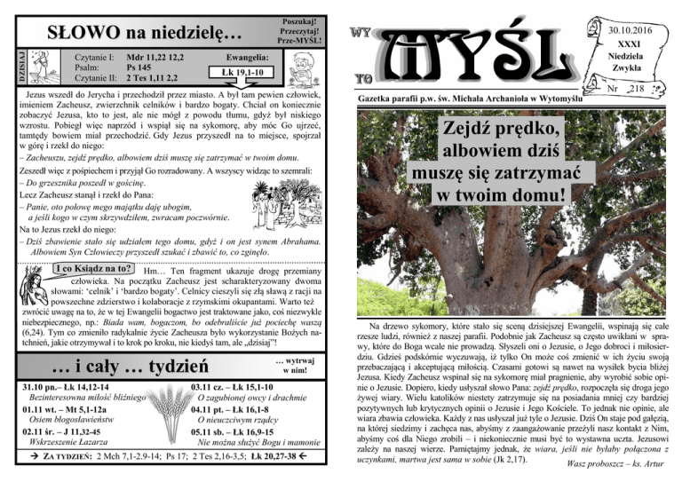 D Z I S I AJ SŁOWO na niedzielę… Czytanie I: Psalm: Czytanie II: Mdr 11,22 12,2 Ps 145 2 Tes 1,11 2,2 Poszukaj! Przeczytaj! Prze-MYŚL! 30.10.2016 XXXI Niedziela Zwykła Ewangelia: Łk 19,1-10 Jezus wszedł do Jerycha i przechodził przez miasto. A był tam pewien człowiek, imieniem Zacheusz, zwierzchnik celników i bardzo bogaty. Chciał on koniecznie zobaczyć Jezusa, kto to jest, ale nie mógł z powodu tłumu, gdyż był niskiego wzrostu. Pobiegł więc naprzód i wspiął się na sykomorę, aby móc Go ujrzeć, tamtędy bowiem miał przechodzić. Gdy Jezus przyszedł na to miejsce, spojrzał w górę i rzekł do niego: – Zacheuszu, zejdź prędko, albowiem dziś muszę się zatrzymać w twoim domu. Zeszedł więc z pośpiechem i przyjął Go rozradowany. A wszyscy widząc to szemrali: – Do grzesznika poszedł w gościnę. Lecz Zacheusz stanął i rzekł do Pana: – Panie, oto połowę mego majątku daję ubogim, a jeśli kogo w czym skrzywdziłem, zwracam poczwórnie. Na to Jezus rzekł do niego: – Dziś zbawienie stało się udziałem tego domu, gdyż i on jest synem Abrahama. Albowiem Syn Człowieczy przyszedł szukać i zbawić to, co zginęło. Gazetka parafii p.w. św. Michała Archanioła w Wytomyślu Nr 218 Zejdź prędko, albowiem dziś muszę się zatrzymać w twoim domu! I co Ksiądz na to? Hm… Ten fragment ukazuje drogę przemiany człowieka. Na początku Zacheusz jest scharakteryzowany dwoma słowami: ‘celnik’ i ‘bardzo bogaty’. Celnicy cieszyli się złą sławą z racji na powszechne zdzierstwo i kolaboracje z rzymskimi okupantami. Warto też zwrócić uwagę na to, że w tej Ewangelii bogactwo jest traktowane jako, coś niezwykle niebezpiecznego, np.: Biada wam, bogaczom, bo odebraliście już pociechę waszą (6,24). Tym co zmieniło radykalnie życie Zacheusza było wykorzystanie Bożych natchnień, jakie otrzymywał i to krok po kroku, nie kiedyś tam, ale „dzisiaj”! … i cały … tydzień 31.10 pn.– Łk 14,12-14 Bezinteresowna miłość bliźniego 01.11 wt. – Mt 5,1-12a Osiem błogosławieństw 02.11 śr. – J 11,32-45 Wskrzeszenie Łazarza … wytrwaj w nim! 03.11 cz. – Łk 15,1-10 O zagubionej owcy i drachmie 04.11 pt. – Łk 16,1-8 O nieuczciwym rządcy 05.11 sb. – Łk 16,9-15 Nie można służyć Bogu i mamonie ZA TYDZIEŃ: 2 Mch 7,1-2.9-14; Ps 17; 2 Tes 2,16-3,5; Łk 20,27-38 Na drzewo sykomory, które stało się sceną dzisiejszej Ewangelii, wspinają się całe rzesze ludzi, również z naszej parafii. Podobnie jak Zacheusz są często uwikłani w sprawy, które do Boga wcale nie prowadzą. Słyszeli oni o Jezusie, o Jego dobroci i miłosierdziu. Gdzieś podskórnie wyczuwają, iż tylko On może coś zmienić w ich życiu swoją przebaczającą i akceptującą miłością. Czasami gotowi są nawet na wysiłek bycia bliżej Jezusa. Kiedy Zacheusz wspinał się na sykomorę miał pragnienie, aby wyrobić sobie opinie o Jezusie. Dopiero, kiedy usłyszał słowo Pana: zejdź prędko, rozpoczęła się droga jego żywej wiary. Wielu katolików niestety zatrzymuje się na posiadania mniej czy bardziej pozytywnych lub krytycznych opinii o Jezusie i Jego Kościele. To jednak nie opinie, ale wiara zbawia człowieka. Każdy z nas usłyszał już tyle o Jezusie. Dziś On staje pod gałęzią, na której siedzimy i zachęca nas, abyśmy z zaangażowanie przeżyli nasz kontakt z Nim, abyśmy coś dla Niego zrobili – i niekoniecznie musi być to wystawna uczta. Jezusowi zależy na naszej wierze. Pamiętajmy jednak, że wiara, jeśli nie byłaby połączona z uczynkami, martwa jest sama w sobie (Jk 2,17). Wasz proboszcz – ks. Artur Konserwacja ołtarza Matki Bożej Różańcowej . Na wstępie chciałbym odpowiedzieć na pytanie: czym tak właściwie jest ołtarz ? Po łacinie altare, we wszystkich religiach świata kojarzy się tylko i wyłącznie z jednym: miejsce składania ofiar. W starożytności były to zwyczajne wzniesienia i wszelkie naturalne ukształtowania terenu, które z biegiem czasu zaczęto „ulepszać” przez układanie głazów lub kamieni, czy też ręczne obrabianie skały jeżeli takowa się zdarzyła przy ołtarzu. Takie miejsce miało szczególne znaczenie dla ludzi, ponieważ odznaczało się wyjątkową obecnością jakiegoś bóstwa. W Piśmie Świętym mamy kilka przykładów gdy patriarchowie Izraela zaraz po tym jak objawił im się Bóg, stawiali w to miejsce kilka kamieni, tworząc tym samym ołtarz poświęcony Panu (Abram Rdz 12, 7; Jakub Rdz 28, 10-19). Obecnie w naszej religii ołtarz jest miejscem sprawowania Wieczerzy Pańskiej, a więc największej ofiary w dziejach świata. Wracając do tematu głównego, czyli do konserwacji naszego ołtarza MB Różańcowej, oto czego się dowiedziałem: W 2011 roku Pan mgr Arkadiusz Wypych otrzymał zlecenie zabezpieczenia, znajdującego się w południowej kaplicy, ołtarza klasycystycznego z I ćw. XIX w. Niestety nie ma żadnych danych na temat autora oraz wcześniejszych prac konserwacyjnych, które niewątpliwie były prowadzone. Konserwator po wnikliwych badaniach stwierdził, że głównym celem prac będzie przywrócenie ołtarzowi pierwotnej formy kolorystycznej. Nie było to jednak łatwe zadanie, ponieważ brakowało jakichkolwiek materiałów fotograficznych z okresu powstania omawianego dzieła, dlatego w celu ustalenia oryginalnych kolorów należało zdjąć powstałe w późniejszym czasie kolejne warstwy farby. Rekonstrukcji zostały poddane także gipsowe aniołki, które miały uszkodzone podstawy i były delikatnie zabrudzone. Do wymiany nadawał się blat stołu ołtarzowego, który nie był oryginalną częścią obiektu renowacji, a także nie posiadał żadnych specjalnych zdobień. Nowy blat dostosowano kształtem do formy murowanej mensy (w łuk). Najpóźniejszym elementem ołtarza okazało się drewniane tabernakulum, będące wielokrotnie przemalowywane. Wykonawca prac stworzył nową aranżację tego elementu, pasującą d