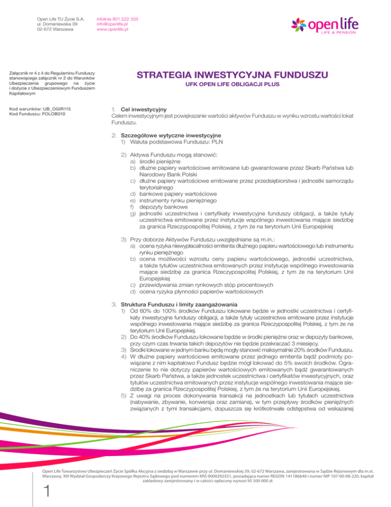 Open Life TU Życie S.A. ul. Domaniewska 39 02-672 Warszawa Załącznik nr 4 z 4 do Regulaminu Funduszy stanowiącego załącznik nr 2 do Warunków Ubezpieczenia grupowego na życie i dożycie z Ubezpieczeniowym Funduszem Kapitałowym Kod warunków: UB_OGIR115 Kod Funduszu: FOLOB010 infolinia 801 222 333 [email protected] www.openlife.pl STRATEGIA INWESTYCYJNA FUNDUSZU UFK OPEN LIFE OBLIGACJI PLUS 1. Cel inwestycyjny Celem inwestycyjnym jest powiększanie wartości aktywów Funduszu w wyniku wzrostu wartości lokat Funduszu. 2. Szczegółowe wytyczne inwestycyjne 1) Waluta podstawowa Funduszu: PLN 2) Aktywa Funduszu mogą stanowić: a) środki pieniężne b) dłużne papiery wartościowe emitowane lub gwarantowane przez Skarb Państwa lub Narodowy Bank Polski c) dłużne papiery wartościowe emitowane przez przedsiębiorstwa i jednostki samorządu terytorialnego d) bankowe papiery wartościowe e) instrumenty rynku pieniężnego f) depozyty bankowe g) jednostki uczestnictwa i certyfikaty inwestycyjne funduszy obligacji, a także tytuły uczestnictwa emitowane przez instytucje wspólnego inwestowania mające siedzibę za granica Rzeczypospolitej Polskiej, z tym że na terytorium Unii Europejskiej 3) Przy doborze Aktywów Funduszu uwzględniane są m.in.: a) ocena ryzyka niewypłacalności emitenta dłużnego papieru wartościowego lub instrumentu rynku pieniężnego b) ocena możliwości wzrostu ceny papieru wartościowego, jednostki uczestnictwa, a także tytułów uczestnictwa emitowanych przez instytucje wspólnego inwestowania mające siedzibę za granica Rzeczypospolitej Polskiej, z tym że na terytorium Unii Europejskiej c) przewidywania zmian rynkowych stóp procentowych d) ocena ryzyka płynności papierów wartościowych 3. Struktura Funduszu i limity zaangażowania 1) Od 60% do 100% środków Funduszu lokowane będzie w jednostki uczestnictwa i certyfikaty inwestycyjne funduszy obligacji, a także tytuły uczestnictwa emitowane przez instytucje wspólnego inwestowania mające siedzibę za granica Rzeczypospolitej Polskiej, z tym że na terytorium Unii Europejskiej. 2) Do 40% środków Funduszu lokowane będzie w środki pieniężne oraz w depozyty bankowe, przy czym czas trwania takich depozytów nie będzie przekraczać 3 miesięcy. 3) Środki lokowane w jednym banku będą mogły stanowić maksymalnie 20% środków Funduszu. 4) W dłużne papiery wartościowe emitowane przez jednego emitenta bądź podmioty powiązane z nim kapitałowo Fundusz będzie mógł lokować do 5% swoich środków. Ograniczenie to nie dotyczy papierów wartościowych emitowanych bądź gwarantowanych przez Skarb Państwa, a także jednostek uczestnictwa i certyfikatów inwestycyjnych, oraz tytułów uczestnictwa emitowanych przez instytucje wspólnego inwestowania mające siedzibę za granica Rzeczypospolitej Polskiej, z tym że na terytorium Unii Europejskiej. 5) Z uwagi na proces dokonywania transakcji na jednostkach lub tytułach uczestnictwa (nabywanie, zbywanie, konwersja oraz zamiana), w tym przepływy środków pieniężnych związanych z tymi transakcjami, dopuszcza się krótkotrwałe odstępstwa od wskazanej Open Life Towarzystwo Ubezpieczeń Życie Spółka Akcyjna z siedzibą w Warszawie przy ul. Domaniewskiej 39, 02-672 Warszawa, zarejestrowana w Sądzie Rejonowym dla m.st. Warszawy, XIII Wydział Gospodarczy Krajowego Rejestru Sądowego pod numerem KRS 0000292551, posiadająca numer REGON 141186640 i numer NIP 107-00-08-220, kapitał zakładowy zarejestrowany i w całości opłacony wynosi 95 500 000 zł. 1 Open Life TU Życie S.A. ul. Domaniewska 39 02-672 Warszawa infolinia 801 222 333 [email protected] www.openlife.pl powyżej struktury Funduszu oraz Limitów zaangażowania, jeśli wynikają one z zawartych a nierozliczonych transakcji lub ze zmian alokacji w Funduszu pomiędzy poszczególnymi Funduszami inwestycyjnymi lub instytucjami wspólnego inwestowania. W przypadku przekroczenia opisanych powyżej limitów zaangażowania Towarzystwo Ubezpieczeń w terminie 14 dni doprowadzi strukturę lokat do zgodności z opisanymi Limitami zaangażowania. 4. Postanowienia końcowe 1) Zmiany niniejszej strategii w części, o której mowa w pkt 2 - 3 nie stanowią zmiany Warunków Ubezpieczenia pod warunkiem, że nie naruszają Celu inwestycyjnego i nie zmieniają profilu ryzyka inwestycyjnego. 2) Niniejsza strategia inwestycyjna wchodzi w życie z dniem 11 marca 2013 roku. Open Life Towarzystwo Ubezpieczeń Życie Spółka Akcyjna z siedzibą w Warszawie przy ul. Domaniewskiej 39, 02-672 Warszawa, zarejestrowana w Sądzie Rejonowym dla m.st. Warszawy, XIII Wydział Gospodarczy Krajowego Rejestru Sądowego pod numerem KRS 0000292551, posiadająca numer REGON 141186640 i numer NIP 107-00-08-220, kapitał zakładowy zarejestrowany i w całości opłacony wynosi 95 500 000 zł. 2