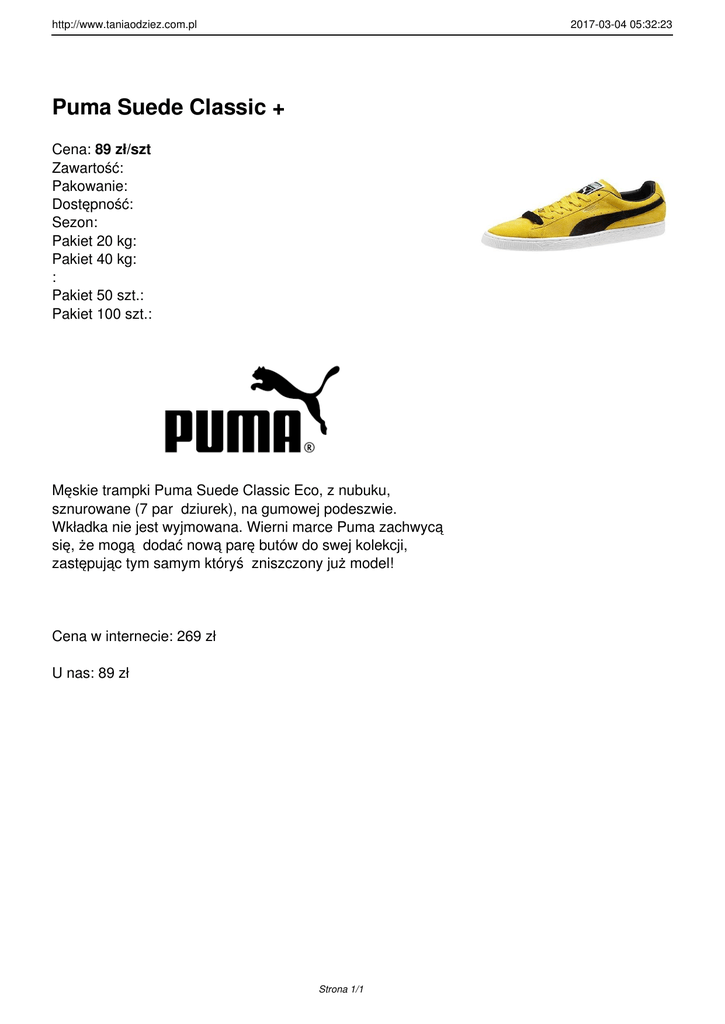 http://www.taniaodziez.com.pl 2017-03-04 05:32:23 Puma Suede Classic + Cena: 89 zł/szt Zawartość: Pakowanie: Dostępność: Sezon: Pakiet 20 kg: Pakiet 40 kg: : Pakiet 50 szt.: Pakiet 100 szt.: Męskie trampki Puma Suede Classic Eco, z nubuku, sznurowane (7 par dziurek), na gumowej podeszwie. Wkładka nie jest wyjmowana. Wierni marce Puma zachwycą się, że mogą dodać nową parę butów do swej kolekcji, zastępując tym samym któryś zniszczony już model! Cena w internecie: 269 zł U nas: 89 zł Strona 1/1