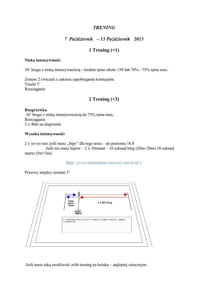 TRENING 7 Październik – 13 Październik 2013 1 Trening (+1) Niska intensywność: 30’ biegu z niską intensywnością - średnie tętno około 150 lub 70% - 75% tętna max. Zestaw 2 ćwiczeń z zakresu zapobiegania kontuzjom. Trucht 5’ Rozciąganie 2 Trening (+3) Rozgrzewka 10’ biegu z niską intensywnością do 75% tętna max. Rozciąganie 3 x 40m na dogrzanie Wysoka intensywność: 2 x yo-yo test: jeśli masz „bipy” dla tego testu – do poziomu 16.8 Jeśli nie masz bipów – 2 x 10minut – 10 sekund bieg (20m+20m) 10 sekund marsz (5m+5m). Bipy: yo-yo intermittent recovery test level 1 Przerwy między seriami 5’ Jeśli masz taką możliwość zrób trening na boisku – najlepiej sztucznym. Jeśli biegasz bez bipów dobierz prędkość biegu tak aby była to dla ciebie praca między ciężką a bardzo ciężką ale nie maksymalna. Tętno do około 90% tętna maksymalnego. Zestaw 2 ćwiczeń z zakresu zapobiegania kontuzjom. Trucht 5’Rozciąganie 3 Trening (-3 lub -2) Rozgrzewka 10’ biegu z niską intensywnością do 75% tętna max. Rozciąganie 3 x 40m na dogrzanie RSA/Wytrzymałość szybkościowa: 3 serie:( -3) lub 2 serie: (-2) na każdej stacji Przerwy między powtórzeniami – 90 sekund Trucht 5’ Rozciąganie 4 Trening (-1 lub -2) Rozgrzewka 10’ biegu z niską intensywnością do 75% tętna max. Rozciąganie 3 x 40m na dogrzanie Szybkość: 4 serie: Jedna seria to 4 przyspieszenia na odcinku 12m poprzedzone dynamicznym startem na odcinku 10m. Dynamiczny start – rozstaw pachołki co 1,5 do 2m. Pomiędzy pachołkami – zyg-zak przodem, zyg zak tyłem, bieg – przód-tył, krok dostawny za zmianą kierunku (2 pachołki do przodu – 1 pachołek do tyłu Przerwa między seriami: 3 minuty sprint 12 m Trucht 5’; Rozciąganie Jeżeli nie sędziujesz żadnego meczu lub sparingu – zrób dodatkowy trening na siłowni lub fitnessie poprzedzony wysiłkiem niskiej intensywności – rozbieganiem około 15’ Jeśli czujesz się przemęczony zamiast treningu skorzystaj z odnowy biologicznej poprzedzonej 15 minutowym wysiłkiem bardzo niskiej intensywności może być to bieg, rower, basen (pływanie lub bieg) lub inne ćwiczenia o podobnej intensywności w fitnessie. Rekomendowany dzień wykonania treningu: (+1) – jeden dzień po meczu (+3) – trzy dni po meczu (-3 lub -2) – dwa lub 3 dni przed meczem (-1 lub -2) – dzień przed meczem lub dwa dni przed meczem