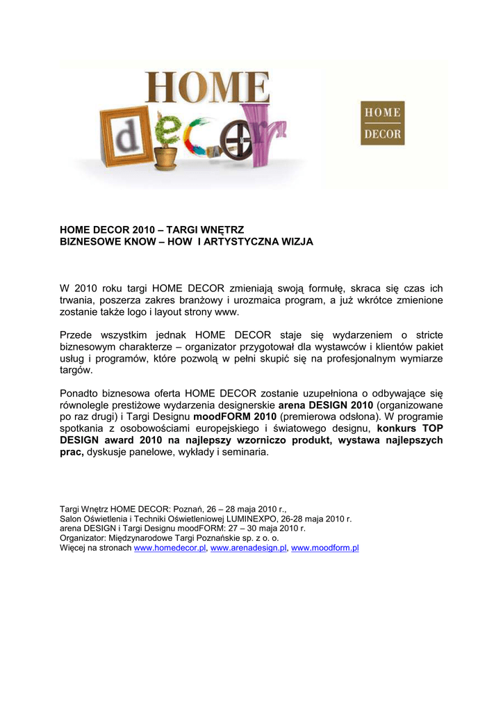 HOME DECOR 2010 – TARGI WNĘTRZ BIZNESOWE KNOW – HOW I ARTYSTYCZNA WIZJA W 2010 roku targi HOME DECOR zmieniają swoją formułę, skraca się czas ich trwania, poszerza zakres branŜowy i urozmaica program, a juŜ wkrótce zmienione zostanie takŜe logo i layout strony www. Przede wszystkim jednak HOME DECOR staje się wydarzeniem o stricte biznesowym charakterze – organizator przygotował dla wystawców i klientów pakiet usług i programów, które pozwolą w pełni skupić się na profesjonalnym wymiarze targów. Ponadto biznesowa oferta HOME DECOR zostanie uzupełniona o odbywające się równolegle prestiŜowe wydarzenia designerskie arena DESIGN 2010 (organizowane po raz drugi) i Targi Designu moodFORM 2010 (premierowa odsłona). W programie spotkania z osobowościami europejskiego i światowego designu, konkurs TOP DESIGN award 2010 na najlepszy wzorniczo produkt, wystawa najlepszych prac, dyskusje panelowe, wykłady i seminaria. Targi Wnętrz HOME DECOR: Poznań, 26 – 28 maja 2010 r., Salon Oświetlenia i Techniki Oświetleniowej LUMINEXPO, 26-28 maja 2010 r. arena DESIGN i Targi Designu moodFORM: 27 – 30 maja 2010 r. Organizator: Międzynarodowe Targi Poznańskie sp. z o. o. Więcej na stronach www.homedecor.pl, www.arenadesign.pl, www.moodform.pl
