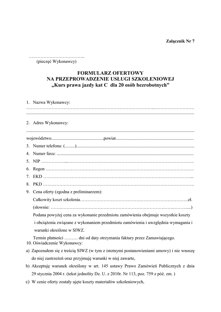 Załącznik Nr 7 ……………………………….. (pieczęć Wykonawcy) FORMULARZ OFERTOWY NA PRZEPROWADZENIE USŁUGI SZKOLENIOWEJ „Kurs prawa jazdy kat C dla 20 osób bezrobotnych” 1. Nazwa Wykonawcy: …………………………………………….……………………………..……………………… ....................................................................................................................................................... 2. Adres Wykonawcy: ....................................................................................................................................................... województwo...............................................powiat...................................................................... 3. Numer telefonu: (.........).......................................................................................................... 4. Numer faxu: ........................................................................................................................... 5. NIP ……………....…………………………………………………………………………. 6. Regon ………………………………………………………………………………………. 7. EKD ………………………………………………………………………………………... 8. PKD ………………………………………………………………………………………… 9. Cena oferty (zgodna z preliminarzem): Całkowity koszt szkolenia……………………………………………………………….zł. (słownie: …….………………………………………………………………….………....) Podana powyżej cena za wykonanie przedmiotu zamówienia obejmuje wszystkie koszty i obciążenia związane z wykonaniem przedmiotu zamówienia i uwzględnia wymagania i warunki określone w SIWZ. Termin płatności ……… dni od daty otrzymania faktury przez Zamawiającego. 10. Oświadczenie Wykonawcy: a) Zapoznałem się z treścią SIWZ (w tym z istotnymi postanowieniami umowy) i nie wnoszę do niej zastrzeżeń oraz przyjmuję warunki w niej zawarte, b) Akceptuję warunek określony w art. 145 ustawy Prawo Zamówień Publicznych z dnia 29 stycznia 2004 r. (tekst jednolity Dz. U. z 2010r. Nr 113, poz. 759 z póź. zm. ) c) W cenie oferty zostały ujęte koszty materiałów szkoleniowych, d) Na czas trwania szkolenia zapewnię dla uczestników szkolenia odpowiednie warunki lokalowe do przeprowadzenia szkolenia (t. j. dostęp do toalety, dostęp do pomieszczenia socjalnego), e) osoba do kontaktu ze strony Wykonawcy (tj. kierownik kursu, imię i nazwisko, numer telefonu) …………………………………………………………………………………….. f) Uważam się za związanego niniejszą ofertą na czas wskazany w SIWZ; g) Zamówienie zostanie wykonane w terminie wymaganym przez Zamawiającego. 11. Szkolenie obejmować będzie …………………………… godzin zegarowych, w tym: ………………………………. godzin zajęć teoretycznych, ………………………………. godzin zajęć praktycznych, Zajęcia teoretyczne będą się odbywać w ………………………………………………………. …………………………………………………………………………………………………... Zajęcia praktyczne będą się odbywać w ……………………………………………………….. 12. Termin szkolenia : …………………do …………………………………………………… …………………………………………………………………………………………………... 12. Pełnomocnik w przypadku składania oferty wspólnej Nazwisko, imię ………………………………………………………………………………. Stanowisko……………………………………………………………………………………… Telefon ……………………………………... Fax …………………………………………… Zakres*: - do reprezentowania w postępowaniu, - do reprezentowania w postępowaniu i zawarcia umowy. ........................................ (miejscowość i data) * zakreślić właściwe ………………….…................................................... (podpis i pieczęć Wykonawcy/osoby upoważnionej do reprezentowania Wykonawcy