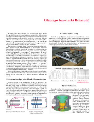 PREZENTACJE Dlaczego barwiarki Brazzoli? Włoska firma Brazzoli Spa, dziś wchodząca w skład Arioli Group, dzięki wręcz rewolucyjnej innowacyjności swoich maszyn, której głównym celem jest optymalizacja procesów barwiarskich oraz uzyskiwanie oszczędności w procesach barwienia dzianin i tkanin, przy zachowaniu jak najwyższych standardów jakościowych i środowiskowych, w ciągu ostatnich 15 lat zbudowała i ugruntowała swoją pozycję światowego lidera wśród producentów maszyn do barwienia dzianin i tkanin w paśmie. Drogę, którą przeszła firma Brazzoli można nazwać ewolucyjną, prowadzącą w ostatnich latach do prawdziwej rewolucji w dziedzinie barwienia dzianin. W latach 1990–2000, produktem flagowym była maszyna Saturno, osiągająca krotność kąpieli 1:7, barwiąca reaktywnie w czasie około 9 h i zużywająca 90 litrów wody na 1 kg dzianiny. Stałe udoskonalenia Brazzoli doprowadziły jednak do tego, iż 10 lat później na rynek wprowadzona została maszyna InnoEcology, redukująca te parametry do odpowiednio: 1:3, 5,5 h i 36 l/kg dzianiny. Dziś wiemy, że to nie krotność kąpieli, tak często podkreślana przez wielu producentów maszyn barwiarskich, jest istotą ograniczenia zużycia wody w maszynach barwiarskich, ale właśnie litry wody potrzebne do wybarwienia 1 kg dzianiny, tak wyróżniają maszyny Brazzoli. Dzięki szeregowi udoskonaleń i efektywnych rozwiązań technologicznych, barwiarki Brazzoli są obecnie najoszczędniejszymi maszynami na świecie. Oszczędności jak i jakość wybarwień to domena Brazzoli. Połączenie kilku czynników konstrukcyjnych i technologicznych dało barwiarkom Brazzoli wymierne rezultaty, dzięki czemu śmiało można stwierdzić, że to najoszczędniejsze maszyny na świecie. System ruchomej cyrkulacji kąpieli Innotechnology System ten nie tylko wprowadza kąpiel do maszyny, ale cały czas, za pomocą pompy pomocniczej, podtrzymuje jej ruch w dolnej części koszy, co pozwala na szybszą i bardziej jednolitą przenikalność kąpieli przez dzianinę. Pozwala to na wybarwienie dzianiny bez konieczności pełnego zanurzania jej w kąpieli, co z kolei zapobiega splątaniom i nadmiernym naprężeniom podczas wyciągania dzianiny przez haspel. Zamontowany w górnej części kolektor dystrybuujący, gwarantuje równomierne ciśnienie kąpieli we wszystkich dyszach maszyny, niezależnie od ich liczby. System przepływu kąpieli Brazzoli 8 System przepływ kąpieli w klasycznej maszynie Układacz hydrauliczny Pozwala na praktycznie stuprocentowe załadowanie kosza barwiarki bez ryzyka splątań, pilingu powodowanego szarpnięciami i naprężeniami dzianiny ułożonej tradycyjnymi układaczami, wyciąganej z dużą prędkością przez hasple. Dzianina układana w maszynach Brazzoli jest zrelaksowana, a na jedną warstwę w koszu przypadać może nawet 40 m dzianiny. Układanie dzianiny wewnątrz kosza barwiarki Bez układacza Z klasycznym układaczem Z hydraulicznym układaczem Brazzoli Dysza Turbovario Dysza jest całkowicie automatyczna i prosta w obsłudze dla operatora. Ustawiana z pulpitu sterowniczego precyzyjna szerokość szczeliny podającej kąpiel, umożliwia podanie zarówno dużej ilości kąpieli pod niskim ciśnieniem, jak i minimalną konieczną ilość pod ciśnieniem bardzo wysokim. Zwiększa to pole zastosowania barwiarki oraz daje przewagę nad maszynami, które mają np. 8-stopniową regulację szczeliny. Standardowa dysza Brazzoli ma średnicę 168 mm, oraz zakres regulacji szczeliny od min. 2 mm do maks. 10 mm. Przegląd – WOS 1/2015 PREZENTACJE Haspel Jest w pełni perforowany, co zapobiega tzw. efektowi Acqua Planing oraz pozwala na przepływ większej ilości kąpieli. Wyposażony został w antypilingowe grzybkowe nakładki silikonowe, które dodatkowo zapewniają lepszy kontakt z dzianiną. i mydlenia. To maszyna, a nie operator, decyduje o zużyciu wody, na podstawie rodzaju dzianiny i zadanej receptury, dzięki temu możemy być pewni, iż zużycie to nie będzie większe niż absolutnie konieczne, a nie jest tajemnicą, iż te dwie fazy mają znaczący wpływ na cały koszt barwienia. Diagram barwienia na kolor ciemny z wykorzystaniem systemu INNOWASH Brazzoli Wraz z wprowadzeniem na rynek maszyny ECO-LOGIC rozpoczęła się prawdziwa rewolucja. Żeby jednak w pełni ją docenić, należy wyjaśnić samą nazwę: Dlaczego ECO? Ponieważ najnowsza generacja maszyn Brazzoli zdecydowanie obniża koszty produkcji oraz zużycie energii elektrycznej, przy jednoczesnym wzroście produkcyjności. Dlaczego LOGIC? Ponieważ po raz pierwszy proces barwienia, ustawienia maszyny oraz faza prania są w pełni automatycznie sterowane przez maszynę, eliminując czynności ręczne oraz dowolność operatora!!! Na przykład: krotność kąpieli – 3,8, całkowity czas procesu – 4,5 h – 5 h, całkowite zużycie pary – 1,7 kg/1 kg dzianiny, całkowite zużycie wody – 28 – 32/1 kg dzianiny, całkowite zużycie energii elektrycznej – 0,13 kW /1 kg dzianiny. Z parametrów mających kluczowe znaczenie podczas obliczania opłacalności produkcji, dotychczas tylko krotność kąpieli oraz czas procesu były częściowo zarządzane przez maszynę. Zużycia wody, pary, liczba powtórzeń oraz realny załadunek pozostawały w gestii operatora. Jeżeli to jeszcze nie jest wystarczający obraz rewolucji, idźmy dalej. To, czym charakteryzuje się dzisiejsza praca farbiarni, to duża różnorodność wsadów, często nie pozwalająca na pełne wykorzystanie pojemności maszyny i na to odpowiedzią są powyższe cechy ECO-LOGIC. Co jednak zrobić, jeżeli wsad będzie metrażowo duży, natomiast gramatura dzianiny będzie bardzo niska? W klasycznej maszynie skończy się to niedoładowaniem i w konsekwencji wzrostem kosztów barwienia. Brazzoli znalazło remedium i na to zjawisko. Dzięki zastosowaniu hydraulicznego układacza, który umożliwia płynny załadunek, a następnie niemalże beznapięciow