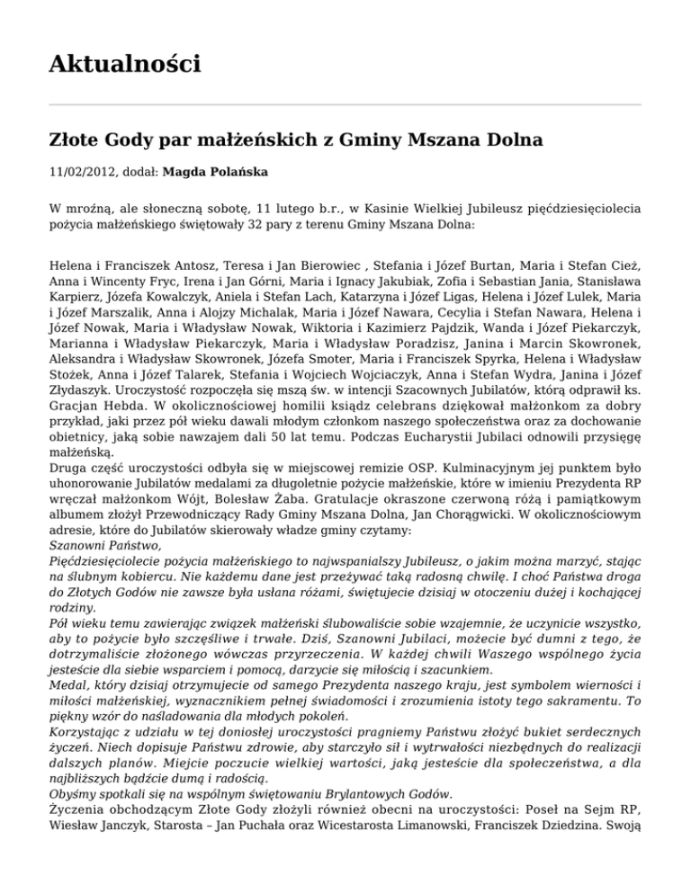 Aktualności Złote Gody par małżeńskich z Gminy Mszana Dolna 11/02/2012, dodał: Magda Polańska W mroźną, ale słoneczną sobotę, 11 lutego b.r., w Kasinie Wielkiej Jubileusz pięćdziesięciolecia pożycia małżeńskiego świętowały 32 pary z terenu Gminy Mszana Dolna: Helena i Franciszek Antosz, Teresa i Jan Bierowiec , Stefania i Józef Burtan, Maria i Stefan Cież, Anna i Wincenty Fryc, Irena i Jan Górni, Maria i Ignacy Jakubiak, Zofia i Sebastian Jania, Stanisława Karpierz, Józefa Kowalczyk, Aniela i Stefan Lach, Katarzyna i Józef Ligas, Helena i Józef Lulek, Maria i Józef Marszalik, Anna i Alojzy Michalak, Maria i Józef Nawara, Cecylia i Stefan Nawara, Helena i Józef Nowak, Maria i Władysław Nowak, Wiktoria i Kazimierz Pajdzik, Wanda i Józef Piekarczyk, Marianna i Władysław Piekarczyk, Maria i Władysław Poradzisz, Janina i Marcin Skowronek, Aleksandra i Władysław Skowronek, Józefa Smoter, Maria i Franciszek Spyrka, Helena i Władysław Stożek, Anna i Józef Talarek, Stefania i Wojciech Wojciaczyk, Anna i Stefan Wydra, Janina i Józef Złydaszyk. Uroczystość rozpoczęła się mszą św. w intencji Szacownych Jubilatów, którą odprawił ks. Gracjan Hebda. W okolicznościowej homilii ksiądz celebrans dziękował małżonkom za dobry przykład, jaki przez pół wieku dawali młodym członkom naszego społeczeństwa oraz za dochowanie obietnicy, jaką sobie nawzajem dali 50 lat temu. Podczas Eucharystii Jubilaci odnowili przysięgę małżeńską. Druga część uroczystości odbyła się w miejscowej remizie OSP. Kulminacyjnym jej punktem było uhonorowanie Jubilatów medalami za długoletnie pożycie małżeńskie, które w imieniu Prezydenta RP wręczał małżonkom Wójt, Bolesław Żaba. Gratulacje okraszone czerwoną różą i pamiątkowym albumem złożył Przewodniczący Rady Gminy Mszana Dolna, Jan Chorągwicki. W okolicznościowym adresie, które do Jubilatów skierowały władze gminy czytamy: Szanowni Państwo, Pięćdziesięciolecie pożycia małżeńskiego to najwspanialszy Jubileusz, o jakim można marzyć, stając na ślubnym kobiercu. Nie każdemu dane jest przeżywać taką radosną chwilę. I choć Państwa droga do Złotych Godów nie zawsze była usłana różami, świętujecie dzisiaj w otoczeniu dużej i kochającej rodziny. Pół wieku temu zawierając związek małżeński ślubowaliście sobie wzajemnie, że uczynicie wszystko, aby to pożycie było szczęśliwe i trwałe. Dziś, Szanowni Jubilaci, możecie być dumni z tego, że dotrzymaliście złożonego wówczas przyrzeczenia. W każdej chwili Waszego wspólnego życia jesteście dla siebie wsparciem i pomocą, darzycie się miłością i szacunkiem. Medal, który dzisiaj otrzymujecie od samego Prezydenta naszego kraju, jest symbolem wierności i miłości małżeńskiej, wyznacznikiem pełnej świadomości i zrozumienia istoty tego sakramentu. To piękny wzór do naśladowania dla młodych pokoleń. Korzystając z udziału w tej doniosłej uroczystości pragniemy Państwu złożyć bukiet serdecznych życzeń. Niech dopisuje Państwu zdrowie, aby starczyło sił i wytrwałości niezbędnych do realizacji dalszych planów. Miejcie poczucie wielkiej wartości, jaką jesteście dla społeczeństwa, a dla najbliższych bądźcie dumą i radością. Obyśmy spotkali się na wspólnym świętowaniu Brylantowych Godów. Życzenia obchodzącym Złote Gody złożyli również obecni na uroczystości: Poseł na Sejm RP, Wiesław Janczyk, Starosta – Jan Puchała oraz Wicestarosta Limanowski, Franciszek Dziedzina. Swoją obecnością świętujących zaszczycili również Radni Gminy Mszana Dolna. Nie zabrakło toastu i chóralnie odśpiewanego „Sto lat”. Specjalnie dla Szacownych Jubilatów koncertowała orkiestra dęta „Echo Zagórzan” z Kasiny Wielkiej. Do tych par, które z różnych przyczyn nie mogły uczestniczyć w dzisiejszej uroczystości, z medalami uda się delegacja z Gminy Mszana Dolna. Magda Polańska zdjęcia