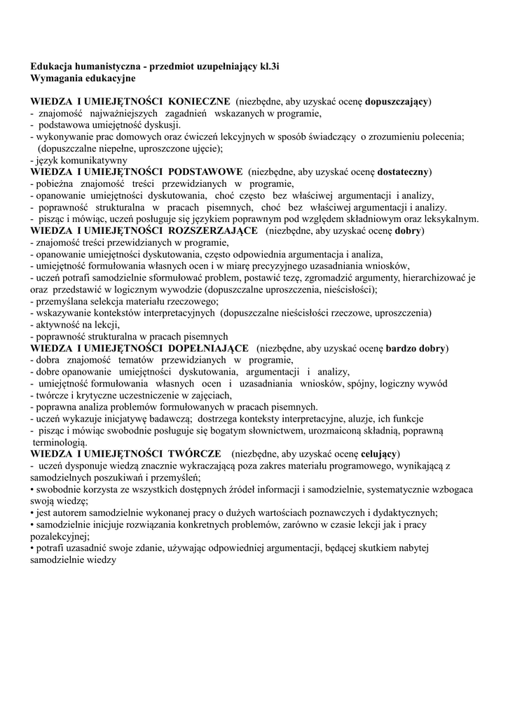 Edukacja humanistyczna - przedmiot uzupełniający kl.3i Wymagania edukacyjne WIEDZA I UMIEJĘTNOŚCI KONIECZNE (niezbędne, aby uzyskać ocenę dopuszczający) - znajomość najważniejszych zagadnień wskazanych w programie, - podstawowa umiejętność dyskusji. - wykonywanie prac domowych oraz ćwiczeń lekcyjnych w sposób świadczący o zrozumieniu polecenia; (dopuszczalne niepełne, uproszczone ujęcie); - język komunikatywny WIEDZA I UMIEJĘTNOŚCI PODSTAWOWE (niezbędne, aby uzyskać ocenę dostateczny) - pobieżna znajomość treści przewidzianych w programie, - opanowanie umiejętności dyskutowania, choć często bez właściwej argumentacji i analizy, - poprawność strukturalna w pracach pisemnych, choć bez właściwej argumentacji i analizy. - pisząc i mówiąc, uczeń posługuje się językiem poprawnym pod względem składniowym oraz leksykalnym. WIEDZA I UMIEJĘTNOŚCI ROZSZERZAJĄCE (niezbędne, aby uzyskać ocenę dobry) - znajomość treści przewidzianych w programie, - opanowanie umiejętności dyskutowania, często odpowiednia argumentacja i analiza, - umiejętność formułowania własnych ocen i w miarę precyzyjnego uzasadniania wniosków, - uczeń potrafi samodzielnie sformułować problem, postawić tezę, zgromadzić argumenty, hierarchizować je oraz przedstawić w logicznym wywodzie (dopuszczalne uproszczenia, nieścisłości); - przemyślana selekcja materiału rzeczowego; - wskazywanie kontekstów interpretacyjnych (dopuszczalne nieścisłości rzeczowe, uproszczenia) - aktywność na lekcji, - poprawność strukturalna w pracach pisemnych WIEDZA I UMIEJĘTNOŚCI DOPEŁNIAJĄCE (niezbędne, aby uzyskać ocenę bardzo dobry) - dobra znajomość tematów przewidzianych w programie, - dobre opanowanie umiejętności dyskutowania, argumentacji i analizy, - umiejętność formułowania własnych ocen i uzasadniania wniosków, spójny, logiczny wywód - twórcze i krytyczne uczestniczenie w zajęciach, - poprawna analiza problemów formułowanych w pracach pisemnych. - uczeń wykazuje inicjatywę badawczą; dostrzega konteksty interpretacyjne, aluzje, ich funkcje - pisząc i mówiąc swobodnie posługuje się bogatym słownictwem, urozmaiconą składnią, poprawną terminologią. WIEDZA I UMIEJĘTNOŚCI TWÓRCZE (niezbędne, aby uzyskać ocenę celujący) - uczeń dysponuje wiedzą znacznie wykraczającą poza zakres materiału programowego, wynikającą z samodzielnych poszukiwań i przemyśleń; • swobodnie korzysta ze wszystkich dostępnych źródeł informacji i samodzielnie, systematycznie wzbogaca swoją wiedzę; • jest autorem samodzielnie wykonanej pracy o dużych wartościach poznawczych i dydaktycznych; • samodzielnie inicjuje rozwiązania konkretnych problemów, zarówno w czasie lekcji jak i pracy pozalekcyjnej; • potrafi uzasadnić swoje zdanie, używając odpowiedniej argumentacji, będącej skutkiem nabytej samodzielnie wiedzy Edukacja humanistyczna - przedmiot uzupełniający kl.3i Zasady oceniania; zasady poprawiania oceny przewidywanej 1. Sprawdzanie i ocenianie osiągnięć odbywa się na bieżąco. 2. Ocenie podlega: aktywność na lekcji, prawidłowe stosowanie pojęć w odpowiednim kontekście i posługiwanie się terminami fachowymi, wykonywanie ćwiczeń redakcyjnych, analitycznych itp., sposoby argumentacji, poprawne formułowanie wniosków, umiejętność dyskusji, umiejętność posługiwania się zdobytą wiedzą, prace pisemne w formie prac domowych lub klasowych; umiejętność krytycznej analizy tekstów; prezentacje; projekty, prace domowe – przygotowanie materiałów do lekcji, przeczytanie zadanej lektury, tekstu źródłowego, samodzielne uzyskanie informacji z wykorzystaniem różnych źródeł informacji (korzystanie z Internetu, biblioteki, zrobienie wywiadu itp.), wykonanie ćwiczeń językowo kompozycyjnych 3. Przedmiotem śródrocznej i końcoworocznej oceny osiągnięć edukacyjnych uczniów jest zarówno zasób wiadomości teoretycznych, jak i umiejętności praktycznych uczniów. 4. Uczeń zobowiązany jest posiadać na lekcji systematycznie, starannie prowadzony zeszyt, w terminie odrabiać zadania domowe. 5. Prace klasowe i sprawdziany z większej partii materiału są obowiązkowe i zapowiedziane z tygodniowym wyprzedzeniem. 6. Uczeń, który nie pisał zapowiedzianego sprawdzianu, jest zobowiązany do jego zaliczenia w dodatkowym terminie (do tygodnia od powrotu do szkoły po nieobecności lub w terminie ustalonym z nauczycielem). Jeżeli uczeń nie przystąpi do napisania pracy, otrzyma ocenę niedostateczną. 7. Uczeń raz w semestrze może być nieprzygotowany do lekcji bez względu na powód (nieprzygotowanie musi być zgłoszone przed rozpoczęciem lekcji). Możliwość zgłoszenia nieprzygotowania w klasach programowo wyższych uzależniona jest od frekwencji ucznia po klasyfikacji końcoworocznej. 8. W ciągu semestru uczeń ma możliwość jednorazowego poprawiania jednej oceny z dużego sprawdzianu 9.. Oceny wystawione przez nauczyciela są jawne i na prośbę ucznia lub rodziców nauczyciel uzasadni swą decyzję. 11. Sprawdziany oceniane są zgodnie z następującym przelicznikiem procentowym: celujący - 98 - 100 % bardzo dobry - 88 - 97 % dobry - 76 - 87 % dostateczny - 58 - 75 % dopuszczający - 48 - 57 % niedostateczny - 0 - 47 % 12. Wystawiając ocenę na koniec danego okresu lub roku szkolnego nauczyciel bierze pod uwagę frekwencję uzyskiwanych ocen. 13. Uczeń, który uzyskał w danym okresie / roku szkolnym / ponad 50 % ocen niedostatecznych, otrzymuje ocenę niedostateczną na koniec okresu /roku szkolnego. Edukacja humanistyczna - przedmiot uzupełniający kl.3i ZASADY POPRAWIANIA OCENY PRZEWIDYWANEJ 1. Uczeń ma możliwość poprawy przewidywanej oceny rocznej, jeśli w trakcie roku szkolnego spełnił następujące warunki: solidnie przygotowywał się do zajęć (np. na bieżąco prowadził notatki, odrabiał na bieżąco zadania domowe) jego frekwencja na zajęcia nie budzi