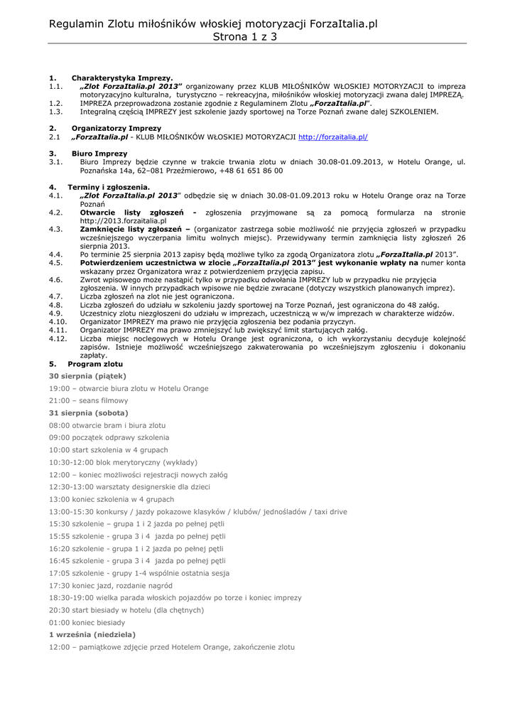 Regulamin Zlotu miłośników włoskiej motoryzacji ForzaItalia.pl Strona 1 z 3 1. 1.1. 1.2. 1.3. Charakterystyka Imprezy. „Zlot ForzaItalia.pl 2013” organizowany przez KLUB MIŁOŚNIKÓW WŁOSKIEJ MOTORYZACJI to impreza motoryzacyjno kulturalna, turystyczno – rekreacyjna, miłośników włoskiej motoryzacji zwana dalej IMPREZĄ. IMPREZA przeprowadzona zostanie zgodnie z Regulaminem Zlotu „ForzaItalia.pl”. Integralną częścią IMPREZY jest szkolenie jazdy sportowej na Torze Poznań zwane dalej SZKOLENIEM. 2. 2.1 Organizatorzy Imprezy „ForzaItalia.pl - KLUB MIŁOŚNIKÓW WŁOSKIEJ MOTORYZACJI http://forzaitalia.pl/ 3. 3.1. Biuro Imprezy Biuro Imprezy będzie czynne w trakcie trwania zlotu w dniach 30.08-01.09.2013, w Hotelu Orange, ul. Poznańska 14a, 62–081 Przeźmierowo, +48 61 651 86 00 4. Terminy i zgłoszenia. 4.1. „Zlot ForzaItalia.pl 2013” odbędzie się w dniach 30.08-01.09.2013 roku w Hotelu Orange oraz na Torze Poznań 4.2. Otwarcie listy zgłoszeń - zgłoszenia przyjmowane są za pomocą formularza na stronie http://2013.forzaitalia.pl 4.3. Zamknięcie listy zgłoszeń – (organizator zastrzega sobie możliwość nie przyjęcia zgłoszeń w przypadku wcześniejszego wyczerpania limitu wolnych miejsc). Przewidywany termin zamknięcia listy zgłoszeń 26 sierpnia 2013. 4.4. Po terminie 25 sierpnia 2013 zapisy będą możliwe tylko za zgodą Organizatora zlotu „ForzaItalia.pl 2013”. 4.5. Potwierdzeniem uczestnictwa w zlocie „ForzaItalia.pl 2013” jest wykonanie wpłaty na numer konta wskazany przez Organizatora wraz z potwierdzeniem przyjęcia zapisu. 4.6. Zwrot wpisowego może nastąpić tylko w przypadku odwołania IMPREZY lub w przypadku nie przyjęcia zgłoszenia. W innych przypadkach wpisowe nie będzie zwracane (dotyczy wszystkich planowanych imprez). 4.7. Liczba zgłoszeń na zlot nie jest ograniczona. 4.8. Liczba zgłoszeń do udziału w szkoleniu jazdy sportowej na Torze Poznań, jest ograniczona do 48 załóg. 4.9. Uczestnicy zlotu niezgłoszeni do udziału w imprezach, uczestniczą w w/w imprezach w charakterze widzów. 4.10. Organizator IMPREZY ma prawo nie przyjęcia zgłoszenia bez podania przyczyn. 4.11. Organizator IMPREZY ma prawo zmniejszyć lub zwiększyć limit startujących załóg. 4.12. Liczba miejsc noclegowych w Hotelu Orange jest ograniczona, o ich wykorzystaniu decyduje kolejność zapisów. Istnieje możliwość wcześniejszego zakwaterowania po wcześniejszym zgłoszeniu i dokonaniu zapłaty. 5. Program zlotu 30 sierpnia (piątek) 19:00 – otwarcie biura zlotu w Hotelu Orange 21:00 – seans filmowy 31 sierpnia (sobota) 08:00 otwarcie bram i biura zlotu 09:00 początek odprawy szkolenia 10:00 start szkolenia w 4 grupach 10:30-12:00 blok merytoryczny (wykłady) 12:00 – koniec możliwości rejestracji nowych załóg 12:30-13:00 warsztaty designerskie dla dzieci 13:00 koniec szkolenia w 4 grupach 13:00-15:30 konkursy / jazdy pokazowe klasyków / klubów/ jednośladów / taxi drive 15:30 szkolenie – grupa 1 i 2 jazda po pełnej pętli 15:55 szkolenie - grupa 3 i 4 jazda po pełnej pętli 16:20 szkolenie - grupa 1 i 2 jazda po pełnej pętli 16:45 szkolenie - grupa 3 i 4 jazda po pełnej pętli 17:05 szkolenie - grupy 1-4 wspólnie ostatnia sesja 17:30 koniec jazd, rozdanie nagród 18:30-19:00 wielka parada włoskich pojazdów po torze i koniec imprezy 20:30 start biesiady w hotelu (dla chętnych) 01:00 koniec biesiady 1 września (niedziela) 12:00 – pamiątkowe zdjęcie przed Hotelem Orange, zakończenie zlotu Regulamin Zlotu miłośników włoskiej motoryzacji ForzaItalia.pl Strona 2 z 3 6. Wysokość wpisowego. 6.1. Ustala się wysokość wpisowego: 7. Władze udział w zlocie załogi – 35 PLN udział w szkoleniu jazdy sportowej – 250 PLN udział w kolacji w sobotę 31 sierpnia 2013 – 50 PLN Zlotu. Komandor Zlotu Dyrektor Organizacyjny Zlotu Organizatorzy Przewodniczący Komisji Sportowej Jakub Strzemżalski Krzysztof Kubas Bartek Lichocki Maciej Słupecki 8. Zasady uczestnictwa. 8.1. Niniejszy dokument wraz z załącznikami określa zasady uczestnictwa w imprezach na zlocie „ForzaItalia.pl 2013” 8.2. Nadzór nad przebiegiem w/w prób sprawuje Komandor Zlotu i Komisja Sportowa, która zastrzega sobie prawo interpretacji niniejszych zasad. Jest jedyną władzą do rozpatrywania i rozstrzygania wszelkich rozbieżności i wątpliwości, które mogą powstać podczas stosowania niniejszych zasad. 8.3. Komandor Zlotu i Komisja Sportowa decyduje o dopuszczeniu lub wykluczeniu zawodnika bądź pojazdu z udziału w IMPREZIE i może tego dokonać bez podawania przyczyny. 8.4. Obowiązkiem każdego kierowcy jest udowodnienie, że jego pojazd odpowiada warunkom technicznym i bezpieczeństwa. 9. 9.1. 9.2. 9.3. 9.4. 9.5. 9.6. 9.7. Warunki techniczne, bezpieczeństwo oraz oznakowanie samochodów biorących udział w imprezach Zgłoszone do SZKOLENIA pojazdy mogą być przedstawione do Badania Kontrolnego (BK) w dowolnym miejscu i czasie podanym przez organizatora w czasie SZKOLENIA Pojazd nie spełniający wymogów regulaminu IMPREZY nie zostanie dopuszczony do startu – wykluczenie załogi; Pojazd przedstawiony do BK musi być oznakowany numerami startowymi oraz wymaganą reklamą sponsorską zgodnie z rysunkiem dostarczonym przez Organizatora przed BK lub opisem przekazanym na odprawie załóg. Pojazd musi być sprawny technicznie i posiadać wyposażenie zgodne z prawem o ruchu drogowym a kierowca obowiązany jest przedstawić wszystkie dokumenty uprawniające do prowadzenia pojazdu i dopuszczające do ruchu po drogach publicznych Pojazd musi być czysty zarówno na zewnątrz jak i wewnątrz; Pojazd, którego konstrukcja pozwala sądzić, że mogłaby zagrażać bezpieczeństwu, może nie zostać dopuszczony do udziału w IMPREZIE; Każdy startujący samochód musi być wyposażony w gaśnicę, trójkąt ostrzegawczy, apteczkę. 10. Załoga 10.1. Załogę stanowi kierowca i pilot (pozostali pasażerowie nie stanowią z