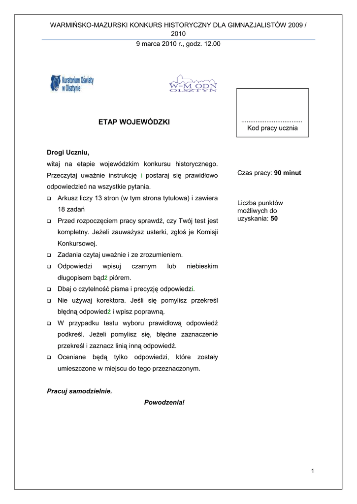 WARMIŃSKO-MAZURSKI KONKURS HISTORYCZNY DLA GIMNAZJALISTÓW 2009 / 2010 9 marca 2010 r., godz. 12.00 .................................. ETAP WOJEWÓDZKI Kod pracy ucznia Drogi Uczniu, witaj na etapie wojewódzkim konkursu historycznego. Przeczytaj uważnie instrukcję i postaraj się prawidłowo Czas pracy: 90 minut odpowiedzieć na wszystkie pytania. Arkusz liczy 13 stron (w tym strona tytułowa) i zawiera 18 zadań Przed rozpoczęciem pracy sprawdź, czy Twój test jest Liczba punktów możliwych do uzyskania: 50 kompletny. Jeżeli zauważysz usterki, zgłoś je Komisji Konkursowej. Zadania czytaj uważnie i ze zrozumieniem. Odpowiedzi wpisuj czarnym lub niebieskim długopisem bądź piórem. Dbaj o czytelność pisma i precyzję odpowiedzi. Nie używaj korektora. Jeśli się pomylisz przekreśl błędną odpowiedź i wpisz poprawną. W przypadku testu wyboru prawidłową odpowiedź podkreśl. Jeżeli pomylisz się, błędne zaznaczenie przekreśl i zaznacz linią inną odpowiedź. Oceniane będą tylko odpowiedzi, które zostały umieszczone w miejscu do tego przeznaczonym. Pracuj samodzielnie. Powodzenia! 1 WARMIŃSKO-MAZURSKI KONKURS HISTORYCZNY DLA GIMNAZJALISTÓW 2009 / 2010 9 marca 2010 r., godz. 12.00 Zadanie 1. (4 pkt) Podanym miejscom bitew przyporządkuj odpowiednich dowódców: A. Termopile 1. Wercyngetoryks B. Maraton 2. Miltiades C. Salamina 3. Leonidas D. Farsalos 4. Temistokles 5. Cezar Zadanie 2. (4 pkt) Zdecyduj, czy podane informacje są prawdziwe (P), czy fałszywe (F): P - prawda / F - fałsz 1. Skupiska kolonii greckich na obszarach Italii nazywano Wielką Grecją 2. Senat to nazwa rady starszych w Palestynie 3. Wojna punicka toczyła się między Grekami a Rzymianami 4. Termy to łaźnie greckie Zadanie 3. (2 pkt) Przeczytaj uważnie fragment tekstu źródłowego i odpowiedz na pytania umieszczone pod tekstem. 1. „Kościół rzymski przez samego Boga został założony. 2. Tylko sam biskup rzymski może być prawnie nazywany biskupem powszechnym. 3. Tylko on sam może biskupów składać z godności lub do nich przywracać. 4. Legat jego przewodniczy wszystkim biskupom na synodzie, nawet gdy jest niższy stopniem i może na nich wydać wyrok złożenia z godności. 5. Nieobecnych może papież składać z godności. 6. Z obłożonymi przez niego klątwą nie wolno przebywać w jednym domu. 2 WARMIŃSKO-MAZURSKI KONKURS HISTORYCZNY DLA GIMNAZJALISTÓW 2009 / 2010 9 marca 2010 r., godz. 12.00 7. Jedynie jemu samemu wolno stosownie do wymagań czasu nowe prawa wydawać, nowe gminy zakładać, ze zgromadzenia kanoników tworzyć opactwa, z drugiej strony dzielić bogate biskupstwa a ubogie łączyć. 8. On sam tylko używa insygniów cesarskich. 9. Tylko papieża stopy całować mają wszyscy książęta. 10. Jego jednego imię ma być wspominane w modlitwach kościelnych. (...) 11. Jemu wolno władcami rozporządzać (a więc i cesarzy z tronu składać). 12. Jemu wolno w razie potrzeby biskupów z miejsca na miejsce przenosić. 13. W całym kościele wolno mu duchownych mianować, gdzie by chciał. (...)” A. Jaką nazwę nosi ten dokument i kto go wydał? .............................................................................................................................................. .............................................................................................................................................. B. Jaką nazwę dokument? nosi okres konfliktów w Europie, z którym związany jest ten .............................................................................................................................................. ............................................................................................................................................ Zadanie 4. (2 pkt) Podane niżej informacje podziel na 2 grupy wstawiając je do odpowiedniej kolumny: a) upadek władzy chrześcijan w Palestynie b) brak pracy i nieurodzaj w Europie c) zajęcie Jerozolimy przez Turków d) dążenie jednostek do zapewnienia sobie bogactw e) rozwój kultury rycerskiej f) Synod w Clermont A. Przyczyny krucjat B. Skutki krucjat 3 WARMIŃSKO-MAZURSKI KONKURS HISTORYCZNY DLA GIMNAZJALISTÓW 2009 / 2010 9 marca 2010 r., godz. 12.00 Zadanie 5 (4 pkt) Poniższa tabela zawiera zestawienie najważniejszych wydarzeń politycznych XVI – XVII wieku. Uzupełnij tabelę (pola oznaczone literami A, B, C, D, E, F, G, H, F), wpisując polskich władców, odpowiednią datę roczną bądź wydarzenie. Władca Lp. Data 1. 1578 Utworzenie Trybunału Koronnego A 2. 1610 B Zygmunt III Waza 3. 1648 Wybuch powstania Chmielnickiego C 4. 1656 Traktat w Radnot D 5. 1668 Abdykacja króla E Odsiecz wiedeńska Jan III Sobieski 6. F Wydarzenie 7. 1717 „sejm niemy“ G 8. 1772 H Stanisław August Poniatowski Zadanie 6 (4 pkt) Zamieszczone poniżej ilustracje ukazują aktywność obywatelską polskiej szlachty. Przyporządkuj ilustracjom właściwe podpisy, umieszczając odpowiednie cyfry pod ilustracjami. A. ................................................................. B. ................................................................... 4 WARMIŃSKO-MAZURSKI KONKURS HISTORYCZNY DLA GIMNAZJALISTÓW 2009 / 2010 9 marca 2010 r., godz. 12.00 C. .............................................................................. D. ......................................................... Źródło: Wielka historia Polski, t. 4, t. 5, Kraków 2000 1. wolna elekcja 2. pospolite ruszenie 3. sejmik ziemski 4. trybunał szlachecki 5. sejm walny Zadanie 7. (2 pkt) Przeczytaj uważnie fragment tekstu źródłowego i odpowiedz na pytania umieszczone pod tekstem. Uważamy za niezbite i oczywiste prawdy: że ludzie stworzeni zostali równymi sobie, że Stwórca udzielił im pewnych praw niezbywalnych, w rządzie których na pierwszym miejscu postawić należy prawo do życia, do wolności i poszukiwania szczęścia; że w celu zapewnienia sobie tych praw ludzie ustanowili m