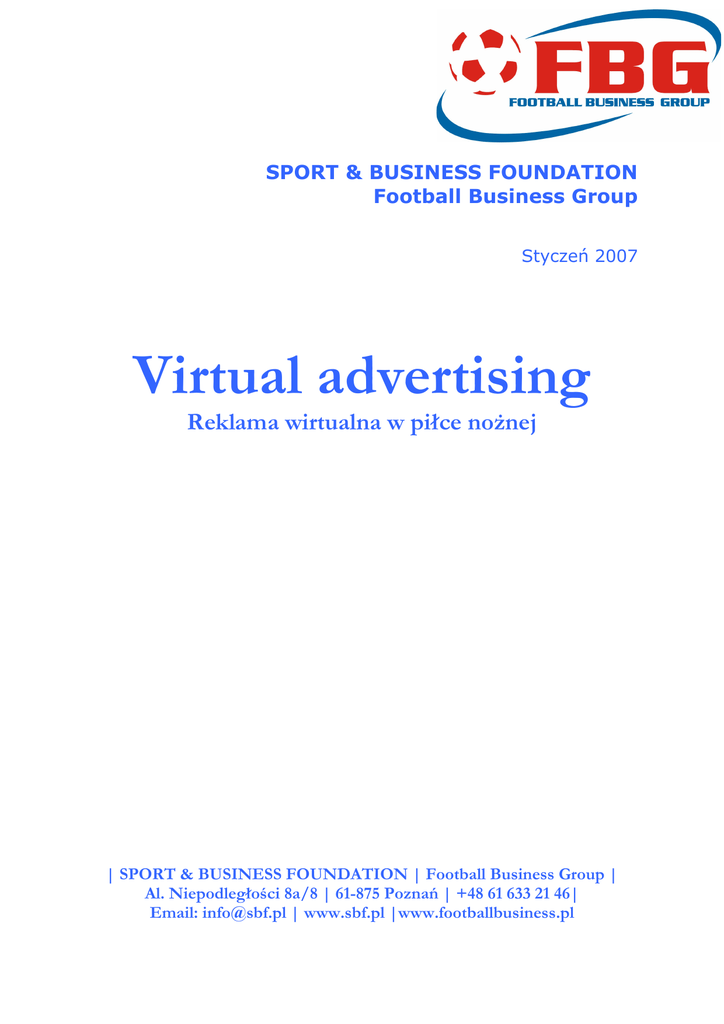 SPORT & BUSINESS FOUNDATION Football Business Group Styczeń 2007 Virtual advertising Reklama wirtualna w piłce nożnej | SPORT & BUSINESS FOUNDATION | Football Business Group | Al. Niepodległości 8a/8 | 61-875 Poznań | +48 61 633 21 46| Email: [email protected] | www.sbf.pl |www.footballbusiness.pl Football Business Group SPIS TREŚCI ROZDZIAŁ I: Wprowadzenie 3 ROZDZIAŁ II: Wirtualna reklama, a piłka nożna 4 ROZDZIAŁ III: Regulacje dotyczące umieszczania wirtualnych reklam 5,6 ROZDZIAŁ IV: Wirtualna reklama w Polsce 7 ROZDZIAŁ V: Technologia CyberSport 8 2 Football Business Group I: Wprowadzenie Trudno sobie wyobrazić dzisiejsze widowiska sportowe bez reklamy. Ogromne pieniądze wielkich koncernów, przyczyniają się do tego, że co raz częściej sięgają oni do nowinek technologicznych tak, aby oferowany przez nich produkt jeszcze lepiej się sprzedawał. Reklama w sporcie to już nie tylko bandy reklamowe okalające boiska z wyświetlaczami ciekłokrystalicznymi, specjalne plansze 3D umieszczane poza boiskami sportowymi, czy serie gadżetów z umieszczonymi nazwami i logami firm sponsorujących, ale także specjalna grafika komputerowa widziana szczególnie dla widzów przed odbiornikami telewizyjnymi. Co raz częściej brakuje powierzchni reklamowych, a sumy dyktowane przez organizatorów imprez sportowych są niebagatelne. W tym miejscu przypomnę choćby coroczny finał Super Bowl Amerykańskiej Ligi NFL w trakcie, którego koszt wyemitowania 30 sekundowego spotu reklamowego waha się w granicach 2,5 – 3,0 milionów dolarów. A i tak nie brakuje chętnych. Wśród reklamodawców prym wiodą oczywiście producenci piwa ulubionego napoju kibiców futbolu. Wielkie widowiska sportowe, ciągną za sobą wielkie pieniądze, każdy chce zaistnieć, wykorzystywany jest postęp technologiczny, a wszystko po to by generować kolejne milionowe przychody. 3 Football Business Group II: Wirtualna reklama, a piłka nożna Piłka nożna jako jedna z najpopularniejszych dyscyplin sportowych, ze względu na swoją widowiskowość zainteresowanie kibiców, mediów, jest również łakomym kąskiem dla firm promujących się na rynku. Jedną z rozwijających się ostatnimi czasy form skutecznego dotarcia do kibica piłkarskiego jest reklama wirtualna – virtual advertising. Jest to nowoczesna technologia umożliwiająca elektroniczne umieszczanie spotów reklamowych lub informacji dotyczących sponsoringu w trakcie trwania programów telewizyjnych. W skrócie ujmując jest to specjalnie nałożony fragment obrazu widoczny tylko i wyłącznie dla widz przed nośnikiem elektronicznym odbierającym sygnał podczas trwania transmisji. Może się to odbywać poprzez telewizje cyfrową, sieć internetowa, nośniki DVD, czy też ostatnio coraz bardziej popularne odtwarzacze w telefonach komórkowych. 4 Football Business Group III: Regulacje dotyczące umieszczania wirtualnych reklam Ze względu na rosnącą potrzebę wyznaczenia przy współudziale widowisk piłkarskich nowych ram dla form reklamy, firmy reklamowe, nadawcy jak również właściciele praw autorskich obecnych przy partycypacji postanowili samodzielnie je uregulować. Pierwszą tego inicjatywą było przyjęcie przez Międzynarodową Federacją Piłkarska FIFA z roku 1999 regulacji dotyczących użycia reklamy wirtualnej. Przyjęty dokument dotyczy meczów piłki nożnej organizowanych pod egidą narodowych federacji piłkarskich. Do najważniejszych postanowień należy: - zezwolenie na umieszczanie reklamy wirtualnej na kole środkowym boiska oraz polach karnych, podczas gdy drużyn nie ma jeszcze na boisku, tylko i wyłącznie poza czasem gry i tylko w przypadku, gdy zawodnicy je opuszczą. - zezwolenie na umieszczanie reklamy wirtualnej na tych obszarach stadionu gdzie umieszczana jest tradycyjna reklama - zezwolenie na umieszczenie reklamy wirtualnej na płaskich częściach stadionu, które normalnie są wykorzystywane do zamieszczania reklam Wspomniana wyżej regulacja zabrania natomiast umieszczania reklamy wirtualnej: - na boisku, podczas gdy drużyny wciąż się na nim znajdują - na osobach (także na: poszczególnych kibicach oraz grupach kibiców) - bez zezwolenia wszystkich zainteresowanych stron: organizatorów meczu, właścicieli praw, nadawców oraz reklamodawców. - reklama wirtualna nie może zakłócać w jakimkolwiek stopniu odbioru widowiska - reklama wirtualna nie może stosować technik podprogowych. - reklama wirtualna nie może być wykorzystywana do reklamowania produktów lub usług, co, do których reklam telewizyjna jest zabroniona w 5 Football Business Group państwie gdzie dany nadawca ma siedzibę. Reklama wirtualna, która jest celowo skierowana do widowni w danym państwie nie może być wykorzystywana jako sposób na obchodzenie przepisów obowiązujących w tym państwie. Nie powinno się w ten sposób reklamować wyrobów tytoniowych. - nadawcy muszą informować swoich widzów o zastosowaniu reklamy wirtualnej we właściwy sposób, zgodnie z prawem krajowym i stosowaną praktyką. 6 Football Business Group IV: Wirtualna reklama w Polsce Wirtualna reklama w Polsce miała swój debiut w 2006 roku. 13 Maja podczas transmisji spotkania Legia Warszawa Wisła Kraków ostatniego meczu sezonu Orange Ekstraklasy sezonu 2005/2006 tuż przed pierwszym gwizdkiem sędziego spotkania, oraz bezpośrednio po jego zakończeniu widzowie programu Canal + Sport zobaczyli pierwszą wirtualną reklamę. Pierwszym reklamowanym w ten sposób w Canal + produktem była Pepsi. Logo firmy zostało umieszczone wirtualnie na murawie po obu stronach środkowego koła. A treści w niej zawarte były widoczne tylko i wyłącznie dla widzów programu Canal +. W ten sposób wirtualna prezentacja marki mogła być zrealizowana na żywo dzięki zaawansowanej technologii CyberSport. Inwestycja dla reklamodawców – CANAL+ np. daje prezentację nowe w atrakcyjne trakcie możliwości transmisji treści niewidocznych bezpo