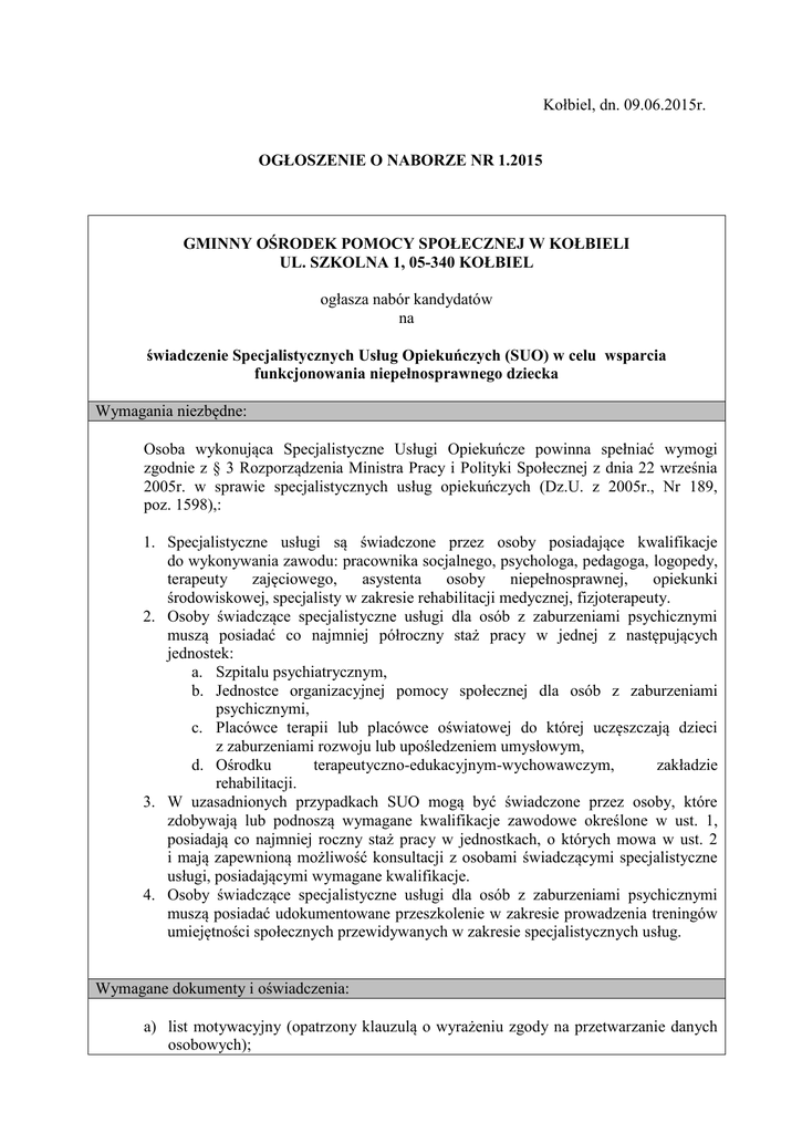 Kołbiel, dn. 09.06.2015r. OGŁOSZENIE O NABORZE NR 1.2015 GMINNY OŚRODEK POMOCY SPOŁECZNEJ W KOŁBIELI UL. SZKOLNA 1, 05-340 KOŁBIEL ogłasza nabór kandydatów na świadczenie Specjalistycznych Usług Opiekuńczych (SUO) w celu wsparcia funkcjonowania niepełnosprawnego dziecka Wymagania niezbędne: Osoba wykonująca Specjalistyczne Usługi Opiekuńcze powinna spełniać wymogi zgodnie z § 3 Rozporządzenia Ministra Pracy i Polityki Społecznej z dnia 22 września 2005r. w sprawie specjalistycznych usług opiekuńczych (Dz.U. z 2005r., Nr 189, poz. 1598),: 1. Specjalistyczne usługi są świadczone przez osoby posiadające kwalifikacje do wykonywania zawodu: pracownika socjalnego, psychologa, pedagoga, logopedy, terapeuty zajęciowego, asystenta osoby niepełnosprawnej, opiekunki środowiskowej, specjalisty w zakresie rehabilitacji medycznej, fizjoterapeuty. 2. Osoby świadczące specjalistyczne usługi dla osób z zaburzeniami psychicznymi muszą posiadać co najmniej półroczny staż pracy w jednej z następujących jednostek: a. Szpitalu psychiatrycznym, b. Jednostce organizacyjnej pomocy społecznej dla osób z zaburzeniami psychicznymi, c. Placówce terapii lub placówce oświatowej do której uczęszczają dzieci z zaburzeniami rozwoju lub upośledzeniem umysłowym, d. Ośrodku terapeutyczno-edukacyjnym-wychowawczym, zakładzie rehabilitacji. 3. W uzasadnionych przypadkach SUO mogą być świadczone przez osoby, które zdobywają lub podnoszą wymagane kwalifikacje zawodowe określone w ust. 1, posiadają co najmniej roczny staż pracy w jednostkach, o których mowa w ust. 2 i mają zapewnioną możliwość konsultacji z osobami świadczącymi specjalistyczne usługi, posiadającymi wymagane kwalifikacje. 4. Osoby świadczące specjalistyczne usługi dla osób z zaburzeniami psychicznymi muszą posiadać udokumentowane przeszkolenie w zakresie prowadzenia treningów umiejętności społecznych przewidywanych w zakresie specjalistycznych usług. Wymagane dokumenty i oświadczenia: a) list motywacyjny (opatrzony klauzulą o wyrażeniu zgody na przetwarzanie danych osobowych); b) c) d) e) f) g) h) i) j) k) życiorys – curriculum vitae; kwestionariusz dla osoby ubiegającej się o zatrudnienie; kserokopie dokumentów potwierdzające wykształcenie i kwalifikacje zawodowe; inne dokumenty o posiadanych kwalifikacjach i umiejętnościach; Udokumentowane przeszkolenie w zakresie prowadzenia treningów umiejętności społecznych przewidywanych w zakresie specjalistycznych usług; oświadczenie o posiadaniu pełnej zdolności do czynności prawnych i korzystaniu z pełni praw publicznych; oświadczenie, że kandydat nie był skazany prawomocnym wyrokiem za umyślne przestępstwo lub umyślne przestępstwo skarbowe; oświadczenie o stanie zdrowia niezbędnym do pracy na danym stanowisku; wobec kandydatów, którzy nie są obywatelami polskimi ale są obywatelami Unii Europejskiej lub obywatelami innych państw, którym na podstawie umów międzynarodowych lub przepisów prawa wspólnotowego przysługuje prawo do podjęcia zatrudnienia na terytorium Rzeczypospolitej Polskiej – dokument potwierdzający znajomość języka polskiego, określony w przepisach o służbie cywilnej. Oświadczenie o wyrażeniu zgody na przetwarzanie danych osobowych zawartych w ofercie pracy na potrzeby postępowania rekrutacyjnego Gminnego Ośrodka Pomocy Społecznej w Kołbieli zgodnie z ustawą z dnia 29 sierpnia 1997 r. o ochronie danych osobowych (t.j. Dz. U. z 2014, poz. 1182)”. Wszystkie dokumenty i oświadczenia powinny być własnoręcznie podpisane, zaś kserokopie składanych dokumentów powinny być poświadczone przez kandydata za zgodność z oryginałem. Warunki pracy: forma zatrudnienia: 1 osoba – umowa zlecenia średnia ilość godzin pracy 8 godzin tygodniowo prowadzenie karty czasu pracy praca w miejscu zamieszkania dziecka, przewidywany czas zatrudnienia – od dnia zawarcia umowy do 31.12.2015 r. (z możliwością przedłużenia) Miejsce i termin złożenia dokumentów: Osoby zainteresowane prosimy o dostarczenie kompletu dokumentów do Gminnego Ośrodka Pomocy Społecznej w Kołbieli - pokój nr 5 lub za pośrednictwem poczty na adres: Gminny Ośrodek Pomocy Społecznej ul. Szkolna 1 05-340 Kołbiel tel. (25) 757 39 92 wew. 126 fax. 757 39 97 wew. 127 w terminie do dnia 30.06.2015r. do godz. 1500 (liczy się data wpływu) Z DOPISKIEM: „dotyczy naboru na świadczenie Specjalistycznych Usług Opiekuńczych (SUO) w celu wsparcia funkcjonowania niepełnosprawnego dziecka. ” Aplikacje, które wpłyną do Gminnego Ośrodka Pomocy Społecznej w Kołbieli po wyżej określonym terminie nie będą rozpatrywane. Dla oferty przesłanej pocztą terminem wiążącym jest data wpływu do Gminnego Ośrodka Pomocy Społecznej w Kołbieli, a nie data nadania. Oferty odrzucone można odbierać w siedzibie Ośrodka, przez okres 3 miesięcy. Po upływie powyższego terminu zostaną one komisyjnie zniszczone. Z kandydatami spełniającymi wymagania formalne zostanie przeprowadzona rozmowa kwalifikacyjna, o której kandydaci zostaną powiadomieni telefonicznie. Informacja o wyniku naboru będzie umieszczona na stronie www.gopskolbiel.pl oraz na tablicy ogłoszeń Gminnego Ośrodka Pomocy Społecznej w Kołbieli. Wymagane dokumenty aplikacyjne: list motywacyjny i szczegółowe CV, powinny być opatrzone klauzulą „Wyrażam zgodę na przetwarzanie moich danych osobowych zawartych w ofercie pracy dla potrzeb niezbędnych do realizacji procesu rekrutacji, zgodnie z ustawą z dnia 29.08.1997 o ochronie danych osobowych ( Dz. U. z 2014, poz.1182.)”. Informacji na temat naboru na w/w stanowisko można uzyskać pod nr tel. 25 757 39 92 wew. 126