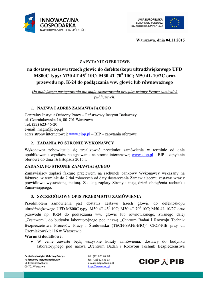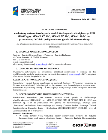 Warszawa, dnia 04.11.2015 ZAPYTANIE OFERTOWE na dostawę zestawu trzech głowic do defektoskopu ultradźwiękowego UFD M800C typy: M30 4T 450 10C; M30 4T 700 10C; M50 4L 10/2C oraz przewodu np. K-24 do podłączania ww. głowic lub równoważnego Do niniejszego postępowania nie mają zastosowania przepisy ustawy Prawo zamówień publicznych. 1. NAZWA I ADRES ZAMAWIAJĄCEGO Centralny Instytut Ochrony Pracy – Państwowy Instytut Badawczy ul. Czerniakowska 16, 00-701 Warszawa Tel. (22) 623-46-20 e-mail: [email protected] adres strony internetowej: www.ciop.pl – BIP – zapytania ofertowe 2. ZADANIA PO STRONIE WYKONAWCY Wykonawca zobowiązuje się zrealizować przedmiot zamówienia w terminie od dnia opublikowania wyników postępowania na stronie internetowej www.ciop.pl – BIP – zapytania ofertowe do dnia 16 listopada 2015 r. ZADANIA PO STRONIE ZAMAWIAJĄCEGO Zamawiający zapłaci fakturę przelewem na rachunek bankowy Wykonawcy wskazany na fakturze, w terminie do 7 dni roboczych od daty dostarczenia Zamawiającemu zestawu wraz z prawidłowo wystawioną fakturą. Za datę zapłaty Strony uznają dzień obciążenia rachunku Zamawiającego. 3. SZCZEGÓŁOWY OPIS PRZEDMIOTU ZAMÓWIENIA Przedmiotem zamówienia jest dostawa zestawu trzech głowic do defektoskopu ultradźwiękowego UFD M800C typy: M30 4T 450 10C; M30 4T 700 10C; M50 4L 10/2C oraz przewodu np. K-24 do podłączania ww. głowic lub równoważnego, zwanego dalej „Zestawem”, do budynku laboratoryjnego pod nazwą „Centrum Badań i Rozwoju Technik Bezpieczeństwa Procesów Pracy i Środowiska (TECH-SAFE-BIO)” CIOP-PIB przy ul. Czerniakowskiej 16 w Warszawie. Warunki dodatkowe: W cenie zawarte będą wszystkie koszty zamówienia: dostawy do budynku laboratoryjnego pod nazwą „Centrum Badań i Rozwoju Technik Bezpieczeństwa Centralny Instytut Ochrony Pracy – Państwowy Instytut Badawczy ul. Czerniakowska 16 00-701 Warszawa tel. (22) 623 46 20 fax: (22) 623 36 93 e-mail: [email protected] http://www.ciop.pl Procesów Pracy i Środowiska (TECH-SAFE-BIO)” CIOP-PIB przy ul. Czerniakowskiej 16 w Warszawie oraz udzielenia gwarancji na okres minimum 12 miesięcy. 4. TERMIN I MIEJSCE WYKONANIA ZAMÓWIENIA Zamawiający wymaga, aby przedmiot zamówienia został dostarczony do budynku laboratoryjnego pod nazwą „Centrum Badań i Rozwoju Technik Bezpieczeństwa Procesów Pracy i Środowiska (TECH-SAFE-BIO)” CIOP-PIB przy ul. Czerniakowskiej 16 w Warszawie w terminie od dnia opublikowania wyników postępowania na stronie internetowej www.ciop.pl – BIP – zapytania ofertowe do dnia 16 listopada 2015 r. 5. WALUTA, W JAKIEJ BĘDĄ PROWADZONE ROZLICZENIA ZWIĄZANE Z REALIZACJĄ NINIEJSZEGO ZAMÓWIENIA Wszystkie rozliczenia związane z realizacją zamówienia dokonywane będą w PLN. 6. OPIS SPOSOBU PRZYGOTOWANIA OFERTY ORAZ MIEJSCE, SPOSÓB I TERMIN JEJ ZŁOŻENIA Oferta powinna zostać przesłana za pomocą poczty elektronicznej na adres mailowy [email protected] lub w formie pisemnej (pocztą) na adres Zamawiającego kancelaria piętro III pok. 335 z informacją „Oferta na zestaw trzech głowic do defektoskopu ultradźwiękowego UFD M800C” do dnia 05.11.2015r. do godziny 14:00. Wykonawca ponosi wszelkie koszty związane z przygotowaniem i złożeniem oferty. Wszystkie oferty otrzymane po określonym terminie nie będą rozpatrywane. Zamawiający złoży zamówienie z wybranym Wykonawcą po wyborze najkorzystniejszej oferty. 7. KRYTERIA OCENY OFERT I WYBORU WYKONAWCY Przy wyborze najkorzystniejszej oferty Zamawiający będzie się kierował kryterium ceny brutto za realizację przedmiotu zamówienia obliczonej przez Wykonawcę. lp. Kryterium zasadnicze Opis Waga – udział w ocenie 1 Cena Cena oferty (z podatkiem VAT) za realizację przedmiotu zamówienia, na którą powinny składać się wszelkie koszty ponoszone przez Wykonawcę 100 8. SPOSÓB OBLICZENIA OFERTY Zamawiający za najkorzystniejszą uzna ofertę, która uzyska największą liczbę punktów przyznanych w ramach ustalonego kryterium. Centralny Instytut Ochrony Pracy – Państwowy Instytut Badawczy ul. Czerniakowska 16 00-701 Warszawa tel. (22) 623 46 20 fax: (22) 623 36 93 e-mail: [email protected] http://www.ciop.pl Maksymalna liczba punktów w ramach kryterium równa jest określonej wadze kryterium w %. Uzyskana liczba punktów w ramach kryterium zaokrąglana będzie do drugiego miejsca po przecinku. Przyznane liczby punktów poszczególnym ofertom odbywać się będzie według następującej zasady: Liczba punktów = Cena brutto najniższej zaproponowanej oferty Cena brutto oferty badanej X 100 9. UWAGI KOŃCOWE Niniejsze zapytanie ofertowe nie stanowi zobowiązania Zamawiającego do złożenia zamówienia. Zamawiający może odstąpić od złożenia zamówienia bez podania uzasadnienia swojej decyzji. 10. POSTANOWIENIA KOŃCOWE Do zapytania ofertowego dołączono: Załącznik nr 1 – Formularz cenowy Centralny Instytut Ochrony Pracy – Państwowy Instytut Badawczy ul. Czerniakowska 16 00-701 Warszawa tel. (22) 623 46 20 fax: (22) 623 36 93 e-mail: [email protected] http://www.ciop.pl
