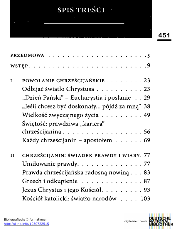 S P I S TREŚCI 451 PRZEDMOWA 5 WSTĘP 9 I POWOŁANIE CHRZEŚCIJAŃSKIE 23 Odbijać światło Chrystusa 23 „Dzień Pański" - Eucharystia i posłanie . . 29 „Jeśli chcesz być doskonały... pójdź za mną" 38 Wielkość zwyczajnego życia 49 Świętość: prawdziwa „kariera" chrześcijanina 56 Każdy chrześcijanin - apostołem 69 II CHRZEŚCIJANIN: ŚWIADEK PRAWDY I WIARY. 77 Umiłowanie prawdy 77 Prawda chrześcijańska radosną nowiną ... 83 Grzech i odkupienie 87 Jezus Chrystus i jego Kościół 93 Kościół katolicki: światło narodów .... 103 http://d-nb.info/1050722515 SPIS TREŚCI Kościół - papież - jedność chrześcijan . . 107 Droga: najświętsze człowieczeństwo Jezusa Chrystusa 113 III BOSKIE DROGI NA ZIEMI: DUCH I CEL OPUS DEI 117 117 Spotkać Boga w zwykłym życiu 2 października 1928 roku: św. Josemaria Escriva „widzi" Opus Dei. . 131 Żyć jako dzieci Boże 138 Jak Jezus w Nazarecie: uświęcenie pracy . . 143 Dusza kapłańska: duch poświęcenia, troska o innych, modlitwa 153 Mentalność świecka: wolność, osobista odpowiedzialność, naturalność Cnoty chrześcijańskie i apostolstwo na co dzień IV 161 171 PRAGNĄĆ SŁUŻYĆ: POWOŁANIE DO OPUS DEI Powołanie - nowe światło 177 177 Specyficzna misja w łonie Kościoła .... 184 Oddać życie za innych 201 Jak zapalone latarnie 204 Spojrzenie na historię: nieporozumienia i kłamstwa 213 Opus Dei: instytucja i rodzina 221 Szkoła świętości: chrześcijańska asceza . . 228 Narzędzia w ręku Boga 238 SPIS TREŚCI V TA SAMA DROGA, RÓŻNE SPOSOBY JEJ POKONYWANIA Małżeństwo i celibat: dwie możliwości chrześcijańskiego oddania Małżeństwo: powołanie człowieka i chrześcijanina Bezżenność dla królestwa Bożego: celibat apostolski Drogi miłości i cnota świętej czystości . . Numerariusze i numerarie w Opus Dei . . VI 245 245 257 266 279 286 WSTĄPIENIE DO OPUS DEI I ŻYCIE W NIM: KSZTAŁCENIE, ŚRODKI, CNOTY 315 Droga miłości: gotowość do poddania się formacji 315 Przyjęcie do Opus Dei, prawa i obowiązki, podstawowe wykształcenie 324 Środki: plan życia i środki formacyjne . . 333 Cnoty (1): pokora, szczerość, posłuszeństwo, hojność 346 Cnoty (2): duch pokuty i umartwienia . . 367 Cnoty (3): oderwanie i duch ubóstwa . . . 381 Cnoty (4): pracowitość, dzielność, miłość bliźniego 396 Nikt nie jest sam: braterstwo i życie rodzinne w Opus Dei 403 VII JAK ROZPOZNAĆ POWOŁANIE 417 Przed podjęciem decyzji 417 Powołanie a dom rodzinny 425 Sprawa między daną osobą a Bogiem . . . 437 Wolność i hojność wobec Boga 440 SPIS TREŚCI Cytowane dzieła Josemarii Escrivy de Balaguera: 447 Najważniejsze dzieła bibliograficzne o św. Josemarii Escrivie i o Opus Dei:. . . 448 Niektóre polecane strony internetowe dotyczące Opus Dei 450 454