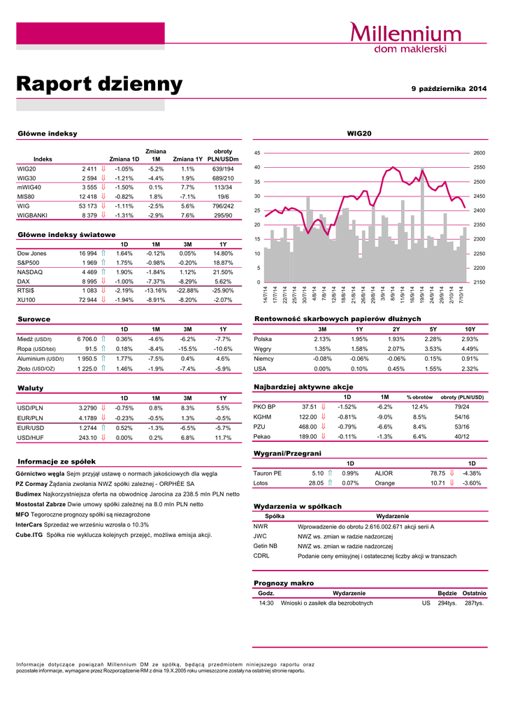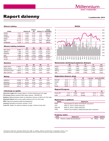 Raport dzienny 9 października 2014 Gł•wne indeksy WIG20 1.8% -7.1% 19/6 -1.11% -2.5% 5.6% 796/242 8 379 -1.31% -2.9% 7.6% 295/90 WIGBANKI Gł•wne indeksy światowe 1M 3M 1Y 2450 25 2400 20 2350 15 2300 10 2250 5 2200 0 2150 16 994 1.64% -0.12% 0.05% 14.80% S&P500 1 969 1.75% -0.98% -0.20% 18.87% NASDAQ 4 469 1.90% -1.84% 1.12% 21.50% DAX 8 995 -1.00% -7.37% -8.29% 5.62% 1 083 72 944 -2.19% -13.16% -22.88% -25.90% -1.94% -8.91% -8.20% -2.07% 1D 1M 3M 1Y 6 706.0 0.36% -4.6% -6.2% -7.7% Polska RTSI$ XU100 Rentowność skarbowych papier•w dłużnych Surowce Miedź (USD/t) 14/7/14 Dow Jones 1D 30 7/10/14 -0.82% 53 173 2/10/14 12 418 WIG 2500 29/9/14 MIS80 35 24/9/14 113/34 19/9/14 689/210 7.7% 16/9/14 1.9% 0.1% 8/9/14 -4.4% -1.50% 11/9/14 -1.21% 3/9/14 2 594 3 555 mWIG40 2550 29/8/14 WIG30 40 26/8/14 639/194 21/8/14 1.1% 18/8/14 -5.2% 7/8/14 -1.05% 12/8/14 2 411 2600 4/8/14 WIG20 45 30/7/14 obroty Zmiana 1Y PLN/USDm 25/7/14 Zmiana 1M 22/7/14 Zmiana 1D 17/7/14 Indeks 3M 1Y 2Y 5Y 10Y 2.13% 1.95% 1.93% 2.28% 2.93% 91.5 0.18% -8.4% -15.5% -10.6% Węgry 1.35% 1.58% 2.07% 3.53% 4.49% Aluminium (USD/t) 1 950.5 1.77% -7.5% 0.4% 4.6% Niemcy -0.08% -0.06% -0.06% 0.15% 0.91% Złoto (USD/OZ) 1 225.0 1.46% -1.9% -7.4% -5.9% USA 0.00% 0.10% 0.45% 1.55% 2.32% 1D 1M 3M 1Y Ropa (USD/bbl) Najbardziej aktywne akcje Waluty 1D 1M % obrot€w obroty (PLN/USD) 37.51 -1.52% -6.2% 12.4% 79/24 KGHM 122.00 -0.81% -9.0% 8.5% 54/16 -5.7% PZU 468.00 -0.79% -6.6% 8.4% 53/16 11.7% Pekao 189.00 -0.11% -1.3% 6.4% 40/12 USD/PLN 3.2790 -0.75% 0.8% 8.3% 5.5% PKO BP EUR/PLN 4.1789 -0.23% -0.5% 1.3% -0.5% EUR/USD 1.2744 0.52% -1.3% -6.5% USD/HUF 243.10 0.00% 0.2% 6.8% Wygrani/Przegrani Informacje ze sp•łek 1D G€rnictwo węgla Sejm przyjął ustawę o normach jakościowych dla węgla Tauron PE PZ Cormay Żądania zwołania NWZ sp‚łki zależnej - ORPHˆE SA Lotos 1D 5.10 0.99% ALIOR 78.75 -4.38% 28.05 0.07% Orange 10.71 -3.60% Budimex Najkorzystniejsza oferta na obwodnicę Jarocina za 238.5 mln PLN netto Mostostal Zabrze Dwie umowy sp‚łki zależnej na 8.0 mln PLN netto MFO Tegoroczne prognozy sp‚łki są niezagrożone Wydarzenia w sp•łkach Sp€łka Wydarzenie InterCars Sprzedaż we wrześniu wzrosła o 10.3% NWR Wprowadzenie do obrotu 2.616.002.671 akcji serii A Cube.ITG Sp‚łka nie wyklucza kolejnych przejęć, możliwa emisja akcji. JWC NWZ ws. zmian w radzie nadzorczej Getin NB NWZ ws. zmian w radzie nadzorczej CDRL Podanie ceny emisyjnej i ostatecznej liczby akcji w transzach Prognozy makro Godz. 14:30 Wydarzenie Wnioski o zasiłek dla bezrobotnych Informacje dotyczące powiązań Millennium DM ze sp‚łką, będącą przedmiotem niniejszego raportu oraz pozostałe informacje, wymagane przez Rozporządzenie RM z dnia 19.X.2005 roku umieszczone zostały na ostatniej stronie raportu. Będzie Ostatnio US 294tys. 287tys. Informacje ze sp•łek G€rnictwo węgla Sejm przyjął ustawę o normach jakościowych dla węgla Sejm przyjął w dniu 8 października br. wraz z poprawkami ustawę wprowadzającą normy jakościowe dla węgla i jednocześnie umożliwiającą przeznaczenie 280 mln PLN na likwidację i spłatę dług‚w kopalni Kazimierz-Juliusz (120 mln PLN na pokrycie zobowiązań i 160 mln PLN na koszty likwidacji). Za przyjęciem ustawy głosowało 396 posł‚w, nikt nie był przeciw, jeden poseł się wstrzymał. Zgodnie z ustawą dopuszczaniem węgla na rynek polski ma zajmować się Służba Celna, kontrolą obrotu - Inspekcja Handlowa, zaś normy surowca w specjalnym rozporządzeniu ma wydać minister gospodarki. Słuzby legislacyjne sejmu mają wątpliwości czy projekt nie stanowi pomocy publicznej, kt‚rą należałoby notyfikować w KE. PZ Cormay Żądania zwołania NWZ sp€łki zależnej - ORPH‡E SA Sp‚łka poinformowała, że Rada Dyrektor‚w będąca organem zarządzającym sp‚łki (ponad 50%) zależnej - Orph‹e SA zaniechała zwołania NWZA, mimo skierowania żądania w tym zakresie. W związku z powyższym, w celu uzyskania pełnej kontroli nad sp‚łkami z grupy kapitałowej zarząd złożył ponowne żądanie zwołania NWZA Sp‚łki Orph‹e z porządkiem obrad obejmującym odwołanie z Rady Dyrektor‚w Tomasza Tuora, Tadeusza Tuora i Katarzyny Jackowskiej oraz powołanie do Rady Dyrektor‚w Janusza Płocicę (Prezesa Zarządu Emitenta), Wojciecha Suchowskiego (Wiceprezesa) i Michała Błacha. Budimex Najkorzystniejsza oferta na obwodnicę Jarocina za 238.5 mln PLN netto Oferta sp‚łki na budowę obwodnicy Jarocina w ciągu drogi S11 za 238.53 mln PLN netto została wybrana przez GDDKiA jako najkorzystniejsza. Termin realizacji ustalono na 24 miesiące (od dnia rozpoczęcia prac w dniu podpisania umowy). Mostostal Zabrze Dwie umowy sp€łki zależnej na 8.0 mln PLN netto Mostostal Zabrze Realizacje Przemysłowe SA, sp‚łka zależna podpisała dwie umowy z Arcelor Mittal Poland S.A., z kt‚rych jedna (na wymianę rurociągu) opiewa na 1.08 mln PLN netto z terminem realizacji luty 2015, zaś druga (na prace mechaniczne dla Projektu Instalacji Warstwy Ochronnej taśm spiekalniczych) opiewa na 6.9 mln PLN i ma termin realizacji marzec 2016r. MFO Tegoroczne prognozy sp€łki są niezagrożone Tomasz Mirski, Prezes Zarządu potwierdził w "Parkiecie", że tegoroczne prognozy sp‚łki (8.2 mln PLN zysku netto przy 212.2 mln PLN obrot‚w) są niezagrożone. Prezes dodał, że wolumeny sprzedawanych produkt‚w są zgodne z założeniami sp‚łki, jednak zaznaczył, że nie można wykluczyć spadku zam‚wień w wyniku pogarszającej się koniunktury w Europie, a w szczeg‚lności w Niemczech. Prezes podał, że do końca roku sp‚łka planuje uruchomić produkcję na dw‚ch nowych liniach technologicznych, z czego jedna jest już zainstalowana. Cube.ITG Sp€łka nie wyklucza kolejnych przejęć, możliwa emisja akcji. Cube.ITG, kt‚re poinformowało o umowie ws. przejęcia sp‚łki RightSoft (łącznie za 8 mln PLN), prowadzi obecnie zaawansowane prace ws. ko