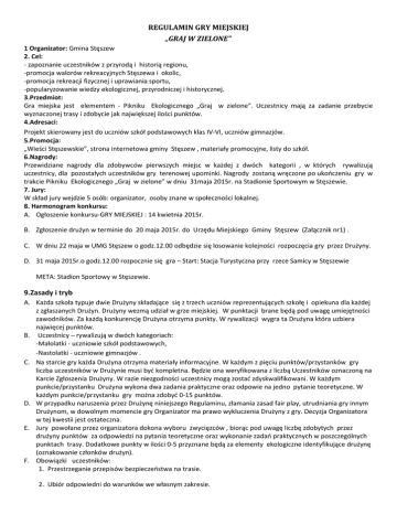 REGULAMIN GRY MIEJSKIEJ „GRAJ W ZIELONE” 1 Organizator: Gmina Stęszew 2. Cel: - zapoznanie uczestników z przyrodą i historią regionu, -promocja walorów rekreacyjnych Stęszewa i okolic, -promocja rekreacji fizycznej i uprawiania sportu, -popularyzowanie wiedzy ekologicznej, przyrodniczej i historycznej. 3.Przedmiot: Gra miejska jest elementem - Pikniku Ekologicznego „Graj w zielone”. Uczestnicy mają za zadanie przebycie wyznaczonej trasy i zdobycie jak największej ilości punktów. 4.Adresaci: Projekt skierowany jest do uczniów szkół podstawowych klas IV-VI, uczniów gimnazjów. 5.Promocja: „Wieści Stęszewskie”, strona internetowa gminy Stęszew , materiały promocyjne, listy do szkół. 6.Nagrody: Przewidziane nagrody dla zdobywców pierwszych miejsc w każdej z dwóch kategorii , w których rywalizują uczestnicy, dla pozostałych uczestników gry terenowej upominki. Nagrody zostaną wręczone po ukończeniu gry w trakcie Pikniku Ekologicznego „Graj w zielone” w dniu 31maja 2015r. na Stadionie Sportowym w Stęszewie. 7. Jury: W skład jury wejdzie 5 osób: organizator, osoby znane w społeczności lokalnej. 8. Harmonogram konkursu: A. Ogłoszenie konkursu-GRY MIEJSKIEJ : 14 kwietnia 2015r. B. Zgłoszenie drużyn w terminie do 20 maja 2015r. do Urzędu Miejskiego Gminy Stęszew (Załącznik nr1) . C. W dniu 22 maja w UMG Stęszew o godz.12.00 odbędzie się losowanie kolejności rozpoczęcia gry przez Drużyny. D. 31 maja 2015r.o godz.12.00 rozpocznie się gra – Start: Stacja Turystyczna przy rzece Samicy w Stęszewie META: Stadion Sportowy w Stęszewie. 9.Zasady i tryb A. Każda szkoła typuje dwie Drużyny składające się z trzech uczniów reprezentujących szkołę i opiekuna dla każdej z zgłaszanych Drużyn. Drużyny wezmą udział w grze miejskiej. W punktacji brane będą pod uwagę umiejętności zawodników. Za każdą konkurencję Drużyna otrzyma punkty. W rywalizacji wygra ta Drużyna która uzbiera najwięcej punktów. B. Uczestnicy – rywalizują w dwóch kategoriach: -Małolatki - uczniowie szkół podstawowych, -Nastolatki - uczniowie gimnazjów . C. Na starcie gry każda Drużyna otrzyma materiały informacyjne. W każdym z pięciu punktów/przystanków gry liczba uczestników w Drużynie musi być kompletna. Będzie ona weryfikowana z liczbą Uczestników oznaczoną na Karcie Zgłoszenia Drużyny. W razie niezgodności uczestnicy mogą zostać zdyskwalifikowani. W każdym punkcie/przystanku Drużyna wykona dwa zadania praktyczne oraz odpowie na jedno pytanie teoretyczne. W każdym punkcie/przystanku gry można zdobyć 0-15 punktów. D. W przypadku naruszenia przez Drużynę niniejszego Regulaminu, złamania zasad fair play, utrudniania gry innym Drużynom, w dowolnym momencie gry Organizator ma prawo wykluczenia Drużyny z gry. Decyzja Organizatora w tej kwestii jest ostateczna. E. Jury powołane przez organizatora dokona wyboru zwycięzców , biorąc pod uwagę liczbę zdobytych przez drużyny punktów za odpowiedzi na pytania teoretyczne oraz wykonanie zadań praktycznych w poszczególnych punktach trasy. Dodatkowe punkty w ilości 0-5 przyznane będą za elementy ekologiczne identyfikujące drużynę (oznakowanie członków drużyn). F. Obowiązki uczestników: 1. Przestrzeganie przepisów bezpieczeństwa na trasie. 2. Ubiór odpowiedni do warunków we własnym zakresie.