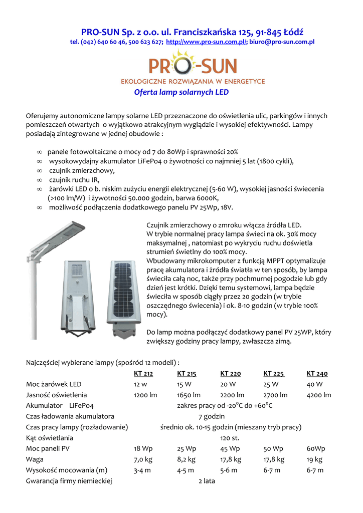 PRO-SUN Sp. z o.o. ul. Franciszkańska 125, 91-845 Łódź tel. (042) 640 60 46, 500 623 627; http://www.pro-sun.com.pl/; [email protected] Oferta lamp solarnych LED Oferujemy autonomiczne lampy solarne LED przeznaczone do oświetlenia ulic, parkingów i innych pomieszczeń otwartych o wyjątkowo atrakcyjnym wyglądzie i wysokiej efektywności. Lampy posiadają zintegrowane w jednej obudowie : • panele fotowoltaiczne o mocy od 7 do 80Wp i sprawności 20% • wysokowydajny akumulator LiFePo4 o żywotności co najmniej 5 lat (1800 cykli), • czujnik zmierzchowy, • czujnik ruchu IR, • żarówki LED o b. niskim zużyciu energii elektrycznej (5-60 W), wysokiej jasności świecenia (>100 lm/W) i żywotności 50.000 godzin, barwa 6000K, • możliwość podłączenia dodatkowego panelu PV 25Wp, 18V. Czujnik zmierzchowy o zmroku włącza źródła LED. W trybie normalnej pracy lampa świeci na ok. 30% mocy maksymalnej , natomiast po wykryciu ruchu doświetla strumień świetlny do 100% mocy. Wbudowany mikrokomputer z funkcją MPPT optymalizuje pracę akumulatora i żródła światła w ten sposób, by lampa świeciła całą noc, także przy pochmurnej pogodzie lub gdy dzień jest krótki. Dzięki temu systemowi, lampa będzie świeciła w sposób ciągły przez 20 godzin (w trybie oszczędnego świecenia) i ok. 8-10 godzin (w trybie 100% mocy). Do lamp można podłączyć dodatkowy panel PV 25WP, który zwiększy godziny pracy lampy, zwłaszcza zimą. Najczęściej wybierane lampy (spośród 12 modeli) : KT 212 KT 215 KT 220 KT 225 Moc żarówek LED 12 w 15 W 20 W 25 W Jasność oświetlenia 1200 lm 1650 lm 2200 lm 2700 lm 0 Akumulator LiFePo4 zakres pracy od -20 C do +600C Czas ładowania akumulatora 7 godzin Czas pracy lampy (rozładowanie) średnio ok. 10-15 godzin (mieszany tryb pracy) Kąt oświetlania 120 st. Moc paneli PV 18 Wp 25 Wp 45 Wp 50 Wp Waga 7,0 kg 8,2 kg 17,8 kg 17,8 kg Wysokość mocowania (m) 3-4 m 4-5 m 5-6 m 6-7 m Gwarancja firmy niemieckiej 2 lata KT 240 40 W 4200 lm 60Wp 19 kg 6-7 m