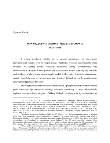 Zygmunt Kozak TOWARZYSTWO OBRONY PRZECIWGAZOWEJ 1922—1928 I wojna światowa różniła się w sposób zasadniczy od dotychczas prowadzonych wojen. Była to wojna nauki i techniki, w której uczestniczyły dwie koalicje. Po każdej strome walczyły milionowe armie. Dysponowały one nowoczesnym sprzętem i uzbrojeniem. Na wyposażeniu wojsk pojawiły się znacznie doskonalsze od dotychczas stosowanych środki walki, m.in.: karabiny maszynowe, czołgi i samoloty oraz po raz pierwszy gazy trujące1, których użycie było zabronione umowami międzynarodowymi2. Dla wyprodukowania środków chemicznych i przeprowadzenia odpowiednich prób konieczny był dobrze rozwinięty przemysł chemiczny, a więc odpowiednie zaplecze badawcze i inżynieryjne3. Zakłady i fabryki powinny więc być nastawione na 1 J. K o w a l i k, Narodziny broni chemicznej, „Przegląd Obrony Przeciwlotniczej i Przeciwgazowej” nr 6 z 1936 roku, s. 151—154, nr 7 z 1936 roku, s. 185—188; J. K o w a l i k, Niemiecka broń chemiczna w czasie wojny światowej, „Przegląd Obrony Przeciw Lotniczej i Przeciwgazowej” nr 8 z 1936 roku, s. 217—219, nr 9 z 1936 roku, s. 252—254, nr 10 z 1936 roku, s. 277—281, nr 11 z 1936 roku, s. 311— 315; A. M a ł y s z k o, Wojna chemiczna, „Lot Polski” nr 3 z 1927 roku, s. 61—63; Z. W i t k i e w i c z, B. M a k l e s, K. S z a r s k i, Broń chemiczna na ziemiach polskich, „Wojskowy Przegląd Historyczny” nr 1—2 z 1995 roku, s. 163. 2 Centralne Archiwum Wojskowe [dalej CAW], I.300.35.127. Deklaracja petersburska z 11 grudnia 1868 roku była pierwszym aktem zakazującym używania w celach wojennych jakichkolwiek trucizn. Konferencja Haska z 1899 roku zabraniała używania trucizn bojowych, a w 1907 roku zakaz ten został potwierdzony w „Przepisach o prowadzeniu wojny lądowej”. Art. 25 tych przepisów brzmiał: „Jest bezwzględnie zabronioną rzeczą posługiwanie się w walce wszelkimi gazami trującymi lub duszącymi”. Z. W o j n i c z – S i a n o ż ę c k i, F. S a r n e k, Wojna chemiczna i obrona kraju, Warszawa 1923, s. 34. 3 Prace nad wykorzystaniem chemii dla potrzeb wojska przed 1914 roku najbardziej zaawansowane były w Niemczech. Wielkość produkcji sztucznych barwników produkowanych przez niemiecki przemysł w 1913 roku wynosiła 75% produkcji światowej. E. K w i a t k o w s k i, Zagadnienia przemysłu chemicznego na masową produkcję z wykorzystaniem łatwo dostępnych materiałów i sprzętu oraz tanich, prostych i szybkich metod produkcji, a także musiałyby nawiązać współpracę z instytucjami i zakładami wojskowymi, w których można przeprowadzać próby. Dla odradzającej się Polski zagadnienie to było szczególnie trudne do realizacji, gdyż cały przemysł należało budować od podstaw. W celu zapoznania wojska ze skutkami stosowania broni chemicznej organizowano liczne spotkania, szkolenia i odprawy. Poszukiwano przy tym odpowiednich osób do pracy nad tą bronią4. Prace w dziedzinie chemii, a tym samym nad bronią chemiczną prowadzono na świecie najczęściej w cywilnych ośrodkach naukowych. Również polskie władze wojskowe włączyły do nich osoby spoza wojska. Począwszy od 1920 roku, na potrzeby Wojska Polskiego zaczęli pracować: prof. Szymon Dzierzgowski, prof. Wojciech Świętosławski, prof. Smoleński, prof. Włodzimierz Lindeman5 oraz inż. Eugeniusz Berger. Lata 1921—1922 były przełomowe w badaniach nad wykorzystaniem chemii dla potrzeb wojska. Uznając za dobrą sytuację międzynarodową6 oraz uwzględniając niedogodne położenie geograficzne7, przyszłą obronę przed gazami bojowymi rozpatrywano w Polsce w dwóch aspektach. Pierwszy to przeprowadzenie badań nad gazami trującymi oraz sposobami ochrony przed ich działaniem. Drugi natomiast to tle wielkiej wojny Lwów 1923, s. 111; Z. W o j n i c z – S i a n o ż ę c k i, Uzbrojenie chemiczne a przemysł organiczny o charakterze pokojowym, „Bellona” 1922, R. 5 [październik 1922], z. 1, s. 94—95. 4 CAW, I.342.2.75. Mjr. Wojnicz-Sianożęckiemu udało się pozyskać zaledwie dwóch oficerów. Byli to: kpt. Franciszek Sarner i por. Tadeusz Kalusiński — absolwent Politechniki Warszawskiej. 5 Istotny wpływ na rozwój polskiego przemysłu chemicznego miał napływ polskich chemików z Rosji. Ludzie ci często zajmowali kierownicze stanowiska w rosyjskim przemyśle chemicznym. E. K w i a t k o w s k i, op. cit., s. 164; CAW, I.342.2.35. Jednym z nich był prof. Włodzimierz Lindeman, który w czasie „pobytu” Wojsk Polskich w Kijowie w 1920 roku zgłosił się do prof. Jankowskiego z propozycją podjęcia pracy w Polsce. W maju 1922 roku został sprowadzony do Polski i zaliczony do współpracowników Oddziału II Sztabu Generalnego. Pracował w Szkole Gazowej (ul. Ludna 11), a w grudniu 1922 roku objął stanowisko kierownika III (Toksykologii) Laboratorium Instytutu Badawczego Broni Chemicznej. 6 W latach 1921—1922 odbyła się w Waszyngtonie konferencja poświęcona omówieniu stosunków międzynarodowych na Dalekim Wschodzie, z udziałem przedstawicieli: Stanów Zjednoczonych, Wielkiej Brytanii, Chin, Japonii, Francji, Włoch, Holandii, Portugalii i Belgii. W trakcie konferencji podpisano trzy układy. Jednym z nich był układ o zakazie stosowania w wojnie gazów trujących i innych bojowych środków chemicznych. Mała encyklopedia wojskowa, t. 3, Warszawa 1967, s. 421. 7 16 kwietnia 1922 roku w Rappalo Niemcy i Rosja podpisały układ o przywróceniu wzajemnych stosunków politycznych oraz współpracy ekonomicznej. A. C z u b i ń s k i, Europa dwudziestego wieku, Poznań 1997, s. 90. rozbudowa własnego przemysłu chemicznego w celu uniezależnienia się od dostaw z zagranicy. O ile rozbudowę rodzimego przemysłu chemicznego można było powierzyć instytucjom cywilnym8, o tyle domeną wojska był nadzór nad wykonywaniem badań chemicznych dla potrzeb militarnych. Do realizacji tych przedsięwzięć nieodzowne było j