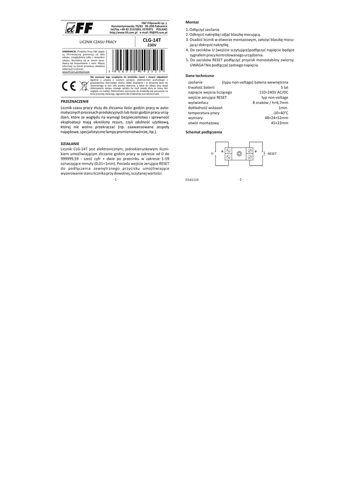 F&F Filipowski sp. j. Konstantynowska 79/81 95-200 Pabianice tel/fax +48 42 2152383; 2270971 POLAND http:/www.fif.com.pl e-mail: [email protected] LICZNIK CZASU PRACY GWARANCJA. Produkty firmy F&F objęte są 24-miesięczną gwarancją od daty zakupu. Uwzględniana tylko z dowodem zakupu. Skontaktuj się ze swoim sprzedawcą lub bezpośrednio z nami. Więcej informacji na temat procedury składania reklamacji na stronie: www.fif.com.pl/reklamacje 5 9 0 8 3 1 2 CLG-14T 230V Montaż 1. Odłączyć zasilanie 2. Odkręcić nakrętkę i zdjąć blaszkę mocującą. 3. Osadzić licznik w otworze montażowym, założyć blaszkę mocującą i dokręcić nakrętkę. 4. Do zacisków U (wejście sczytujące)podłączyć napięcie będące sygnałem pracy kontrolowanego urządzenia. 5. Do zacisków RESET podłączyć przycisk monostabilny zwierny. UWAGA! Nie podłączać żadnego napięcia. 5 9 2 5 2 5 Nie wyrzucać tego urządzenia do śmietnika razem z innymi odpadami! Zgodnie z ustawą o zużytym sprzęcie, elektrośmieci pochodzące z gospodarstwa domowego można oddać bezpłatnie i w dowolnej ilości do utworzonego w tym celu punktu zbierania, a także do sklepu przy okazji dokonywania zakupu nowego sprzętu (w myśl zasady stary za nowy, bez względu na markę). Elektrośmieci wyrzucone do śmietnika lub porzucone na łonie przyrody, stwarzają zagrożenie dla środowiska oraz zdrowia ludzi. PRZEZNACZENIE Licznik czasu pracy służy do zliczania ilości godzin pracy w automatycznych procesach produkcyjnych lub ilości godzin pracy urządzeń, które ze względu na wymogi bezpieczeństwa i sprawność eksploatacji mają określony resurs, czyli zdolność użytkową, której nie wolno przekraczać (np. zaawansowane zespoły napędowe, specjalistyczne lampy promieniotwórcze, itp.). Dane techniczne (typu non-voltage) bateria wewnętrzna zasilanie trwałość baterii 5 lat napięcie wejścia liczącego 110÷240V AC/DC wejście zerujące RESET typ non-voltage wyświetlacz 8 znaków / h=6,7mm dokładność wskazań 1min. temperatura pracy -10÷40°C wymiary 48×24×52mm otwór montażowy 45×23mm Schemat podłączenia DZIAŁANIE Licznik CLG-14T jest elektronicznym, jednokierunkowym licznikiem umożliwiającym zliczanie godzin pracy w zakresie od 0 do 999999,59 - sześć cyfr + dwie po przecinku w zakresie 1-59 oznaczające minuty (0,01=1min). Posiada wejście zerujące RESET do podłączenia zewnętrznego przycisku umożliwiające wyzerowanie stanu licznika przy dowolnej, sczytanej wartości. -1- U D141114 + + -2- RESET
